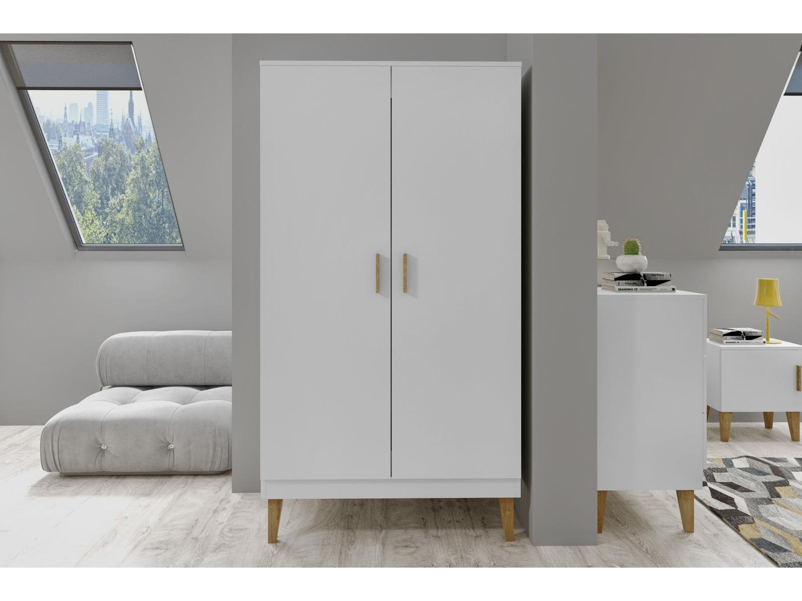 Dvojdverová šatníková skriňa je vybavená piatimi priestrannými poličkami a pevným kovovým držiakom na vešiaky, čo zabezpečuje dostatok priestoru pre vaše odevy a doplnky.