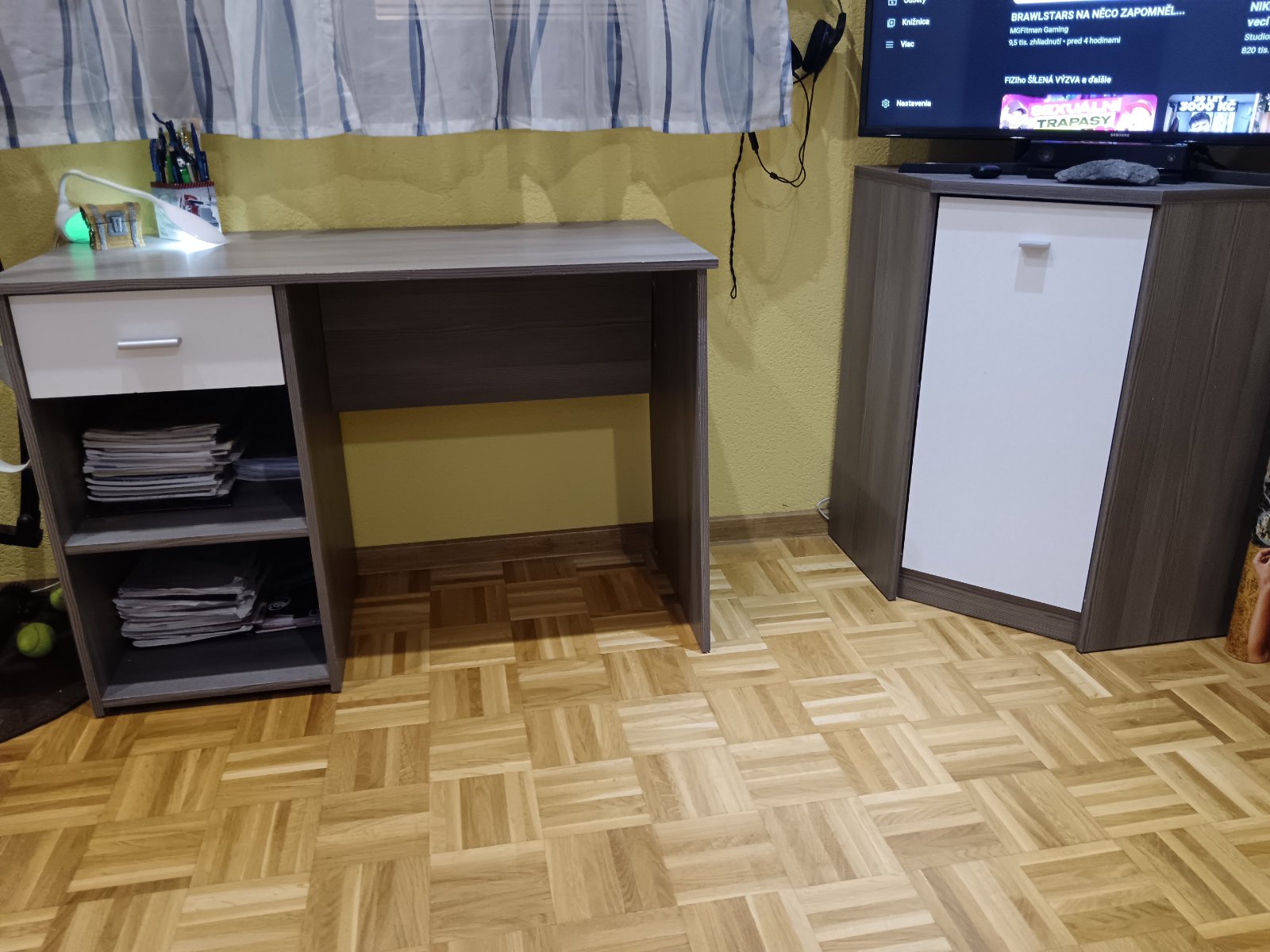 Písací stôl 1e treba spevniť 2casti inak OK a rohová skrinka 30e ta bez poškodení