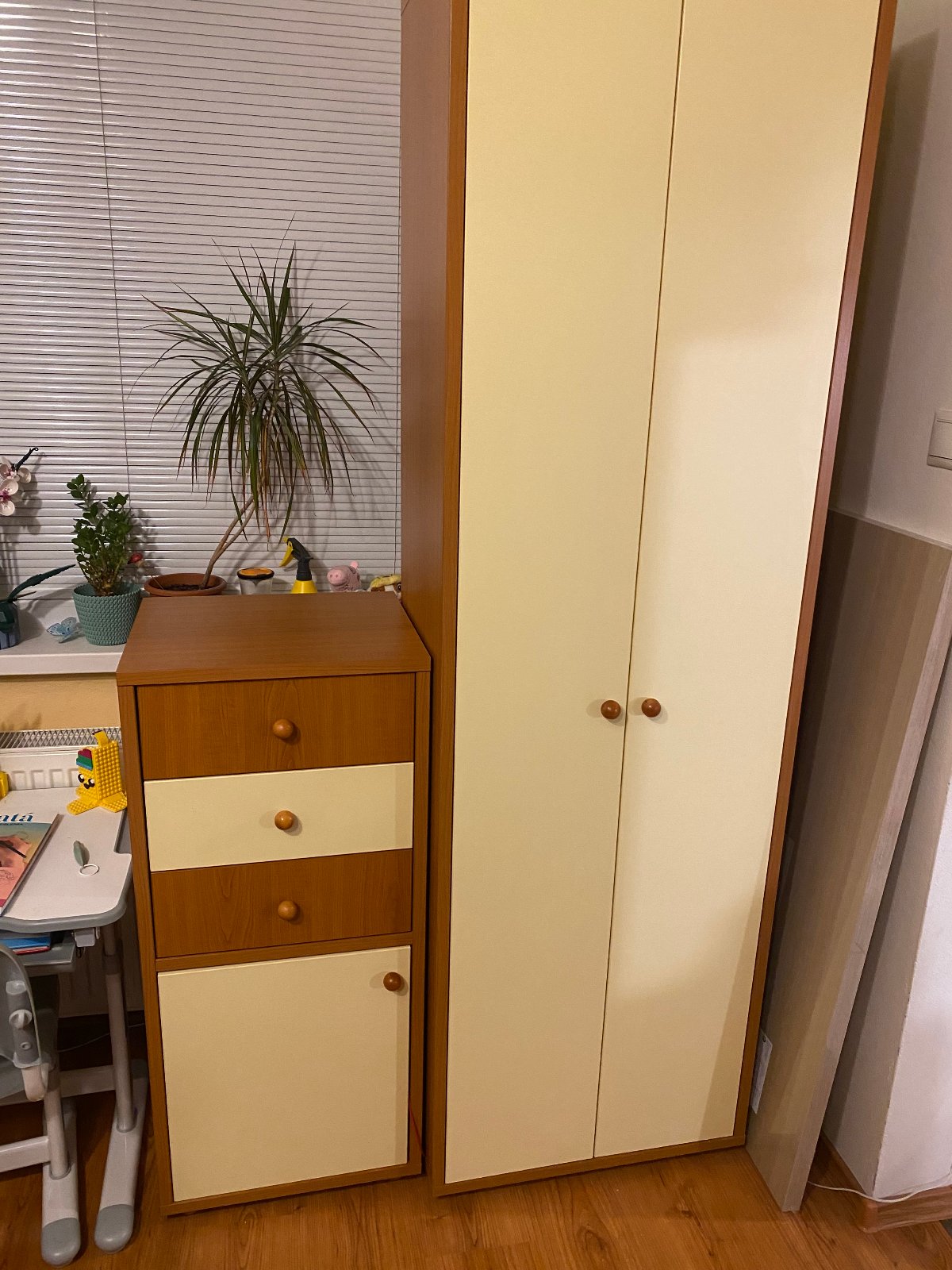 Predám zostavu do detskej izby - 4 skrinky + velka satnikova rohova skrina, hlbka 40 cm, sirka 45 cm roznej vysky: