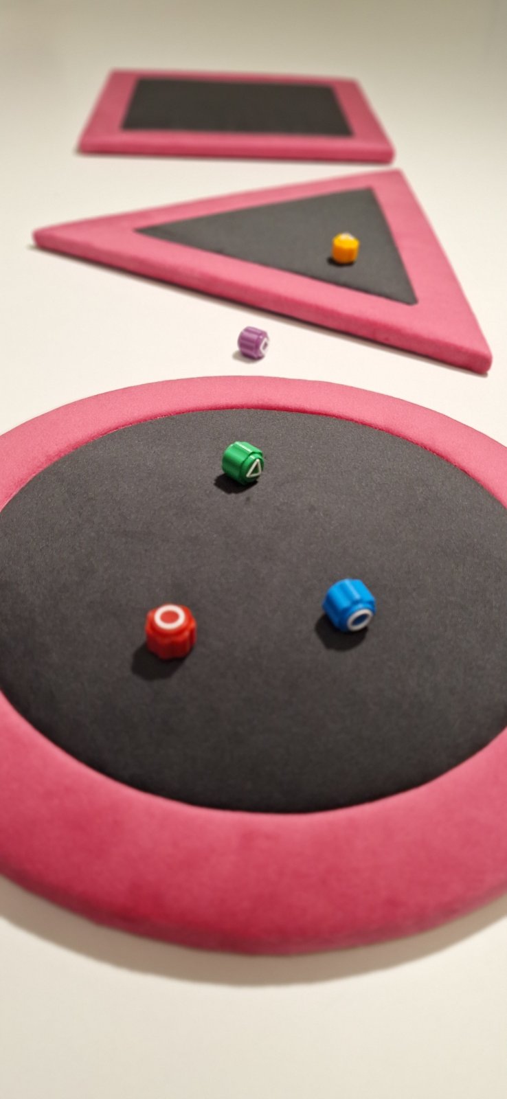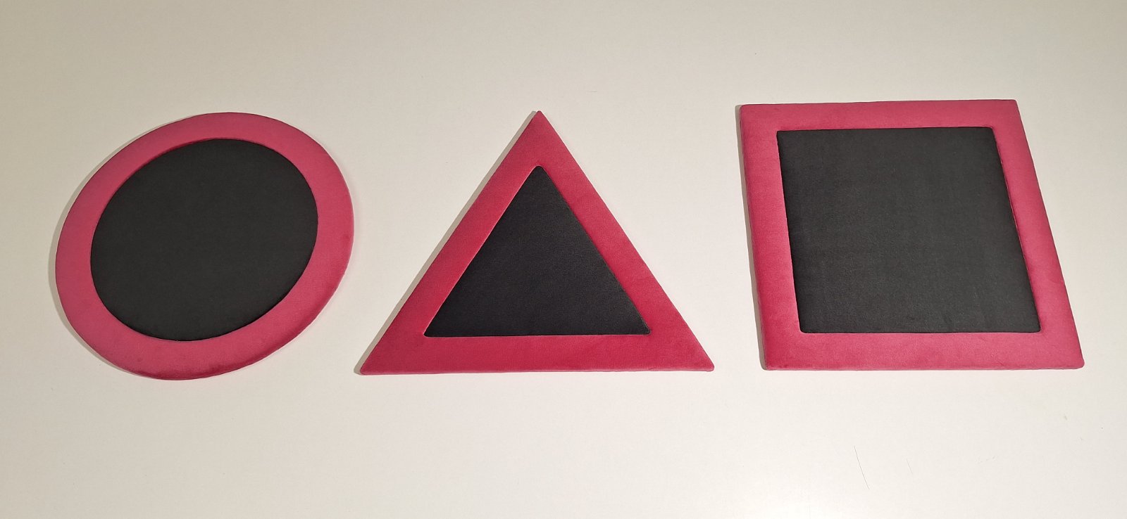 Dekoratívne čalúnené nástenné panely na zavesenie s motívom Squid Game. Set obsahujev 3 symboly, každý v rozmery 30x30. Cena je za 3dielny set.