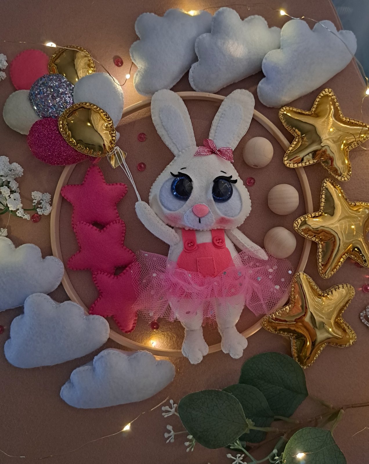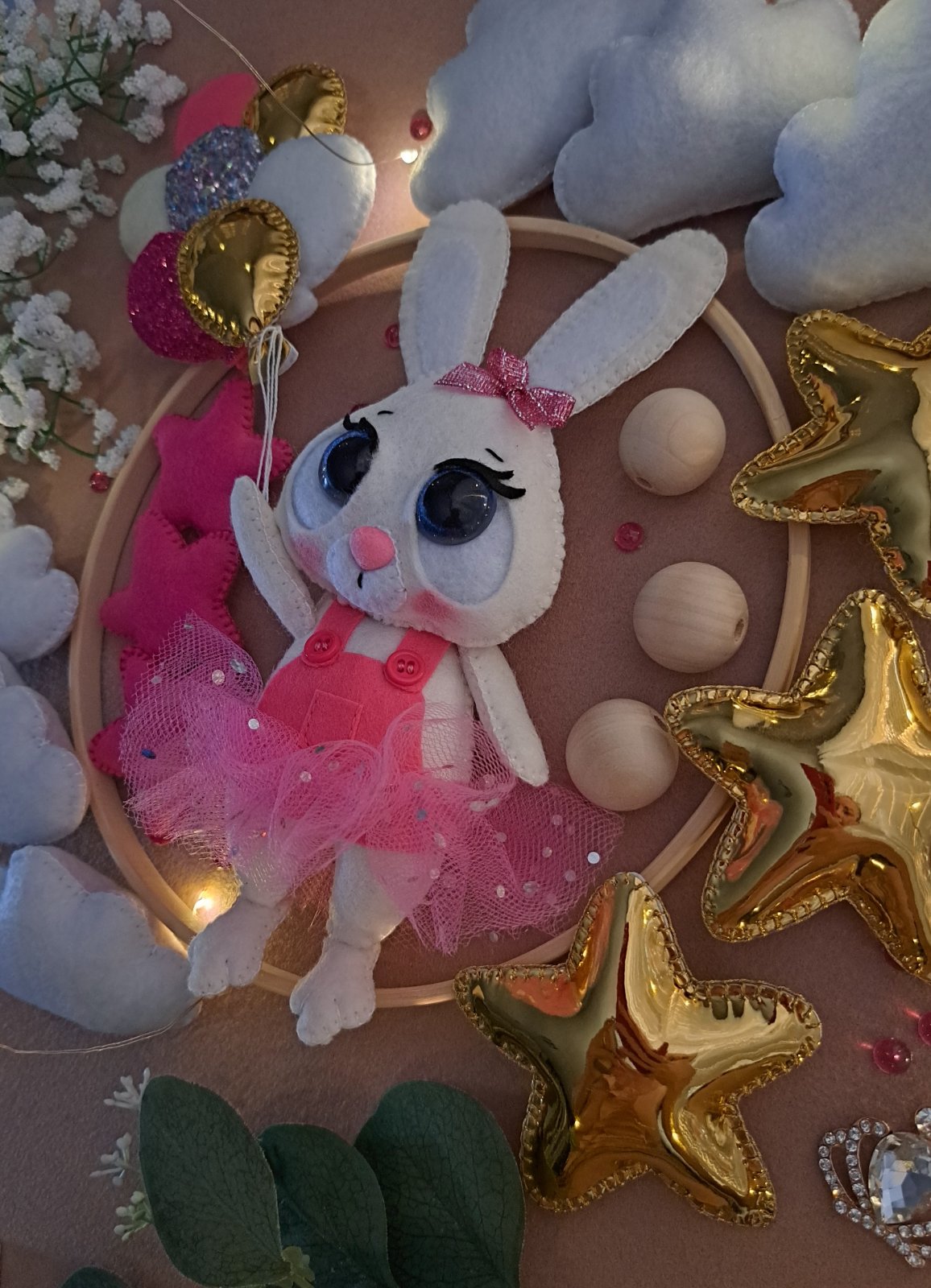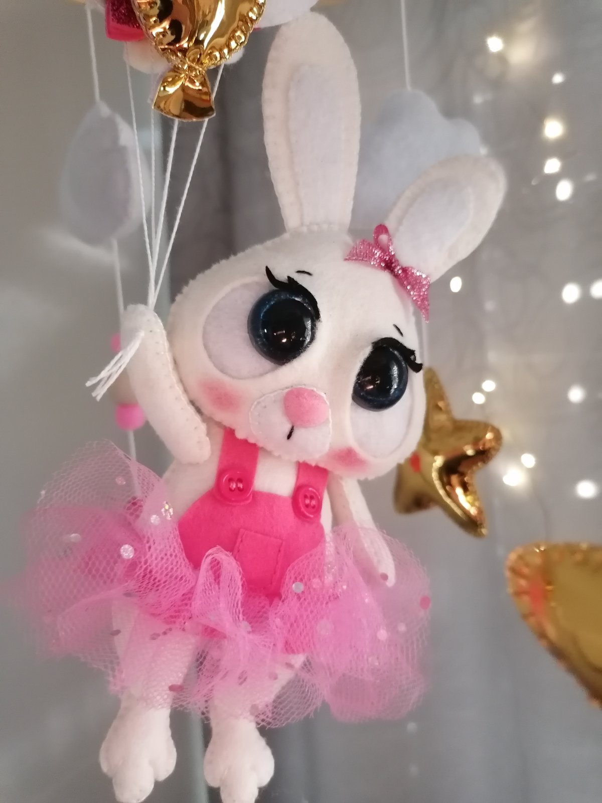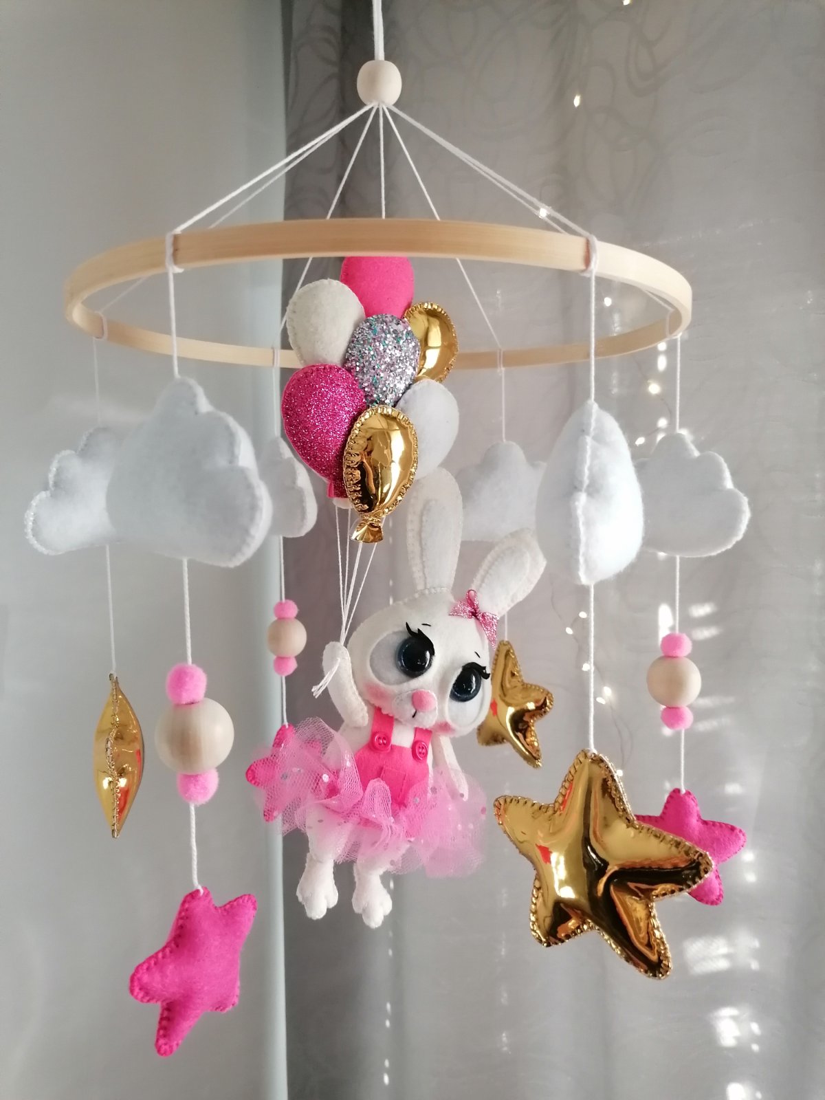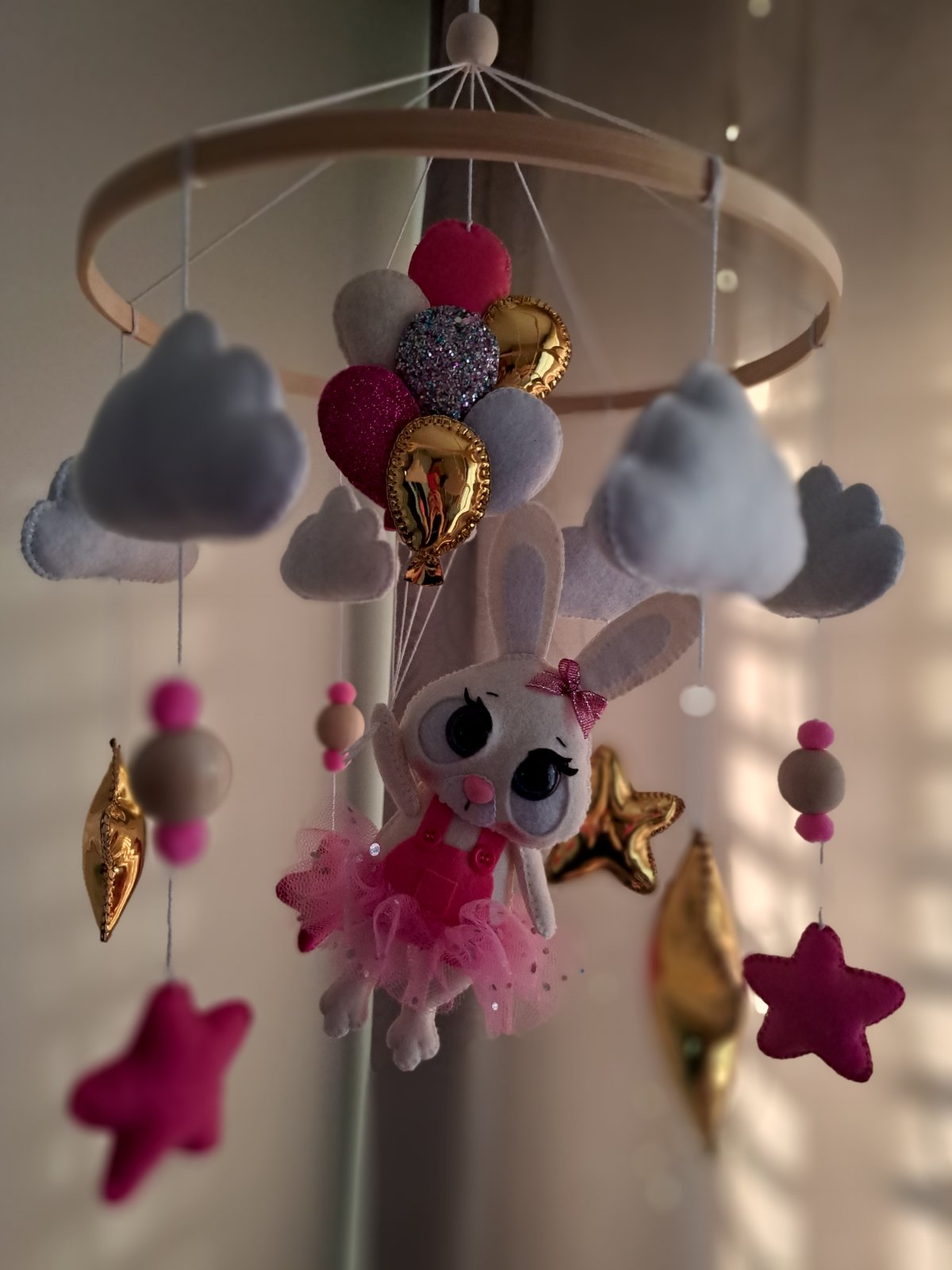 Kolotoč nad postieľku, priemer kruhu 30cm, rucne šitý, na želanie motiv aj farba. Cena 65e, plus stojan so skrinkou 15e.