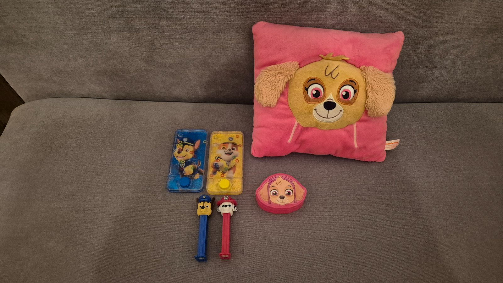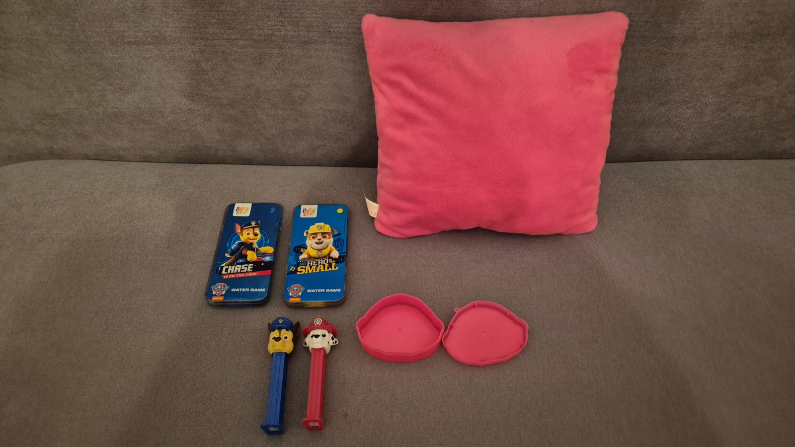 Vankúš je nový, len vystavený. PEZ Paw Patrol prázdne obaly. Krabička na drobnosti Skye. A 2x hra - na Chaseovi je škrabanec.