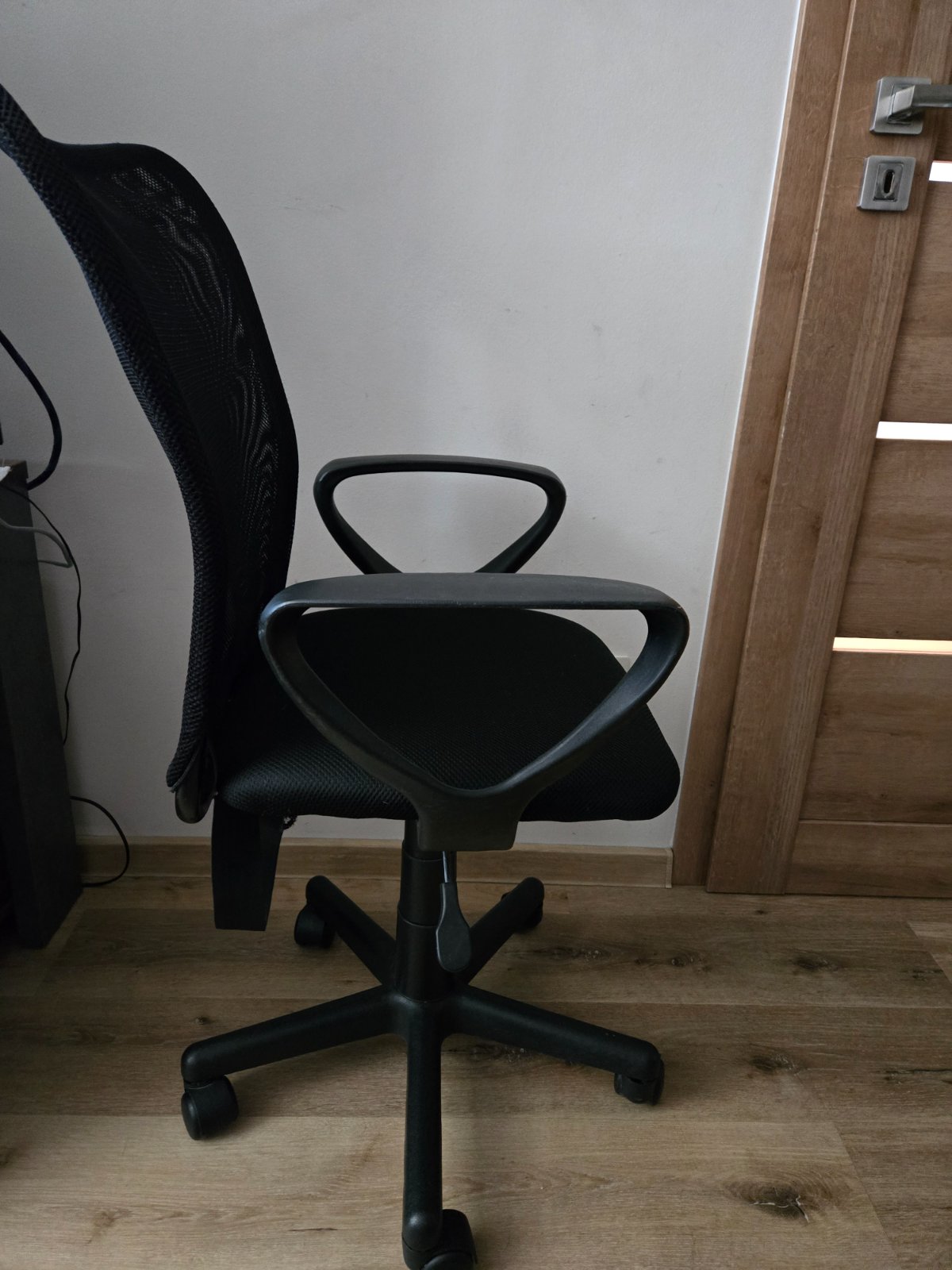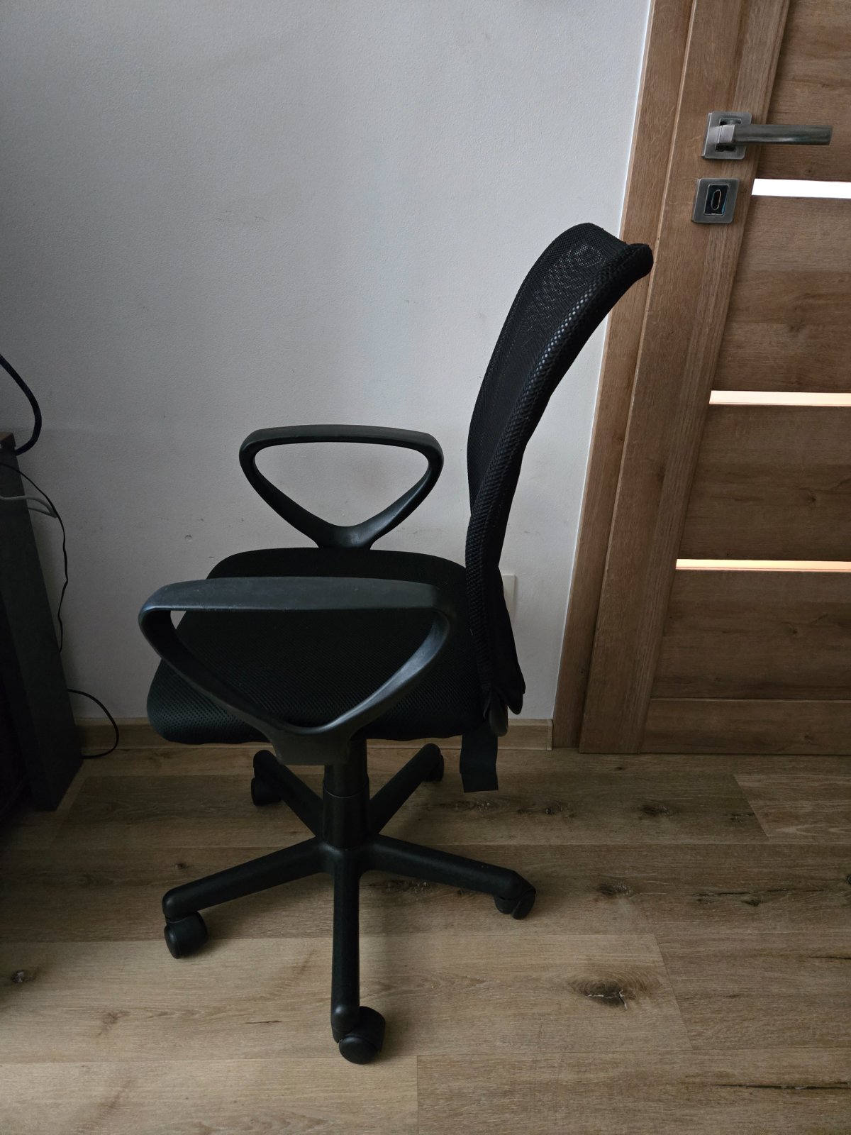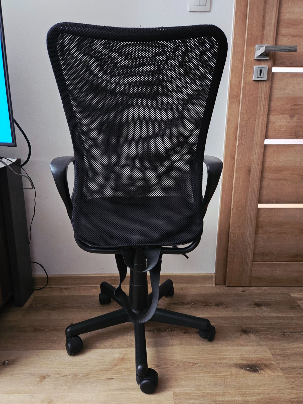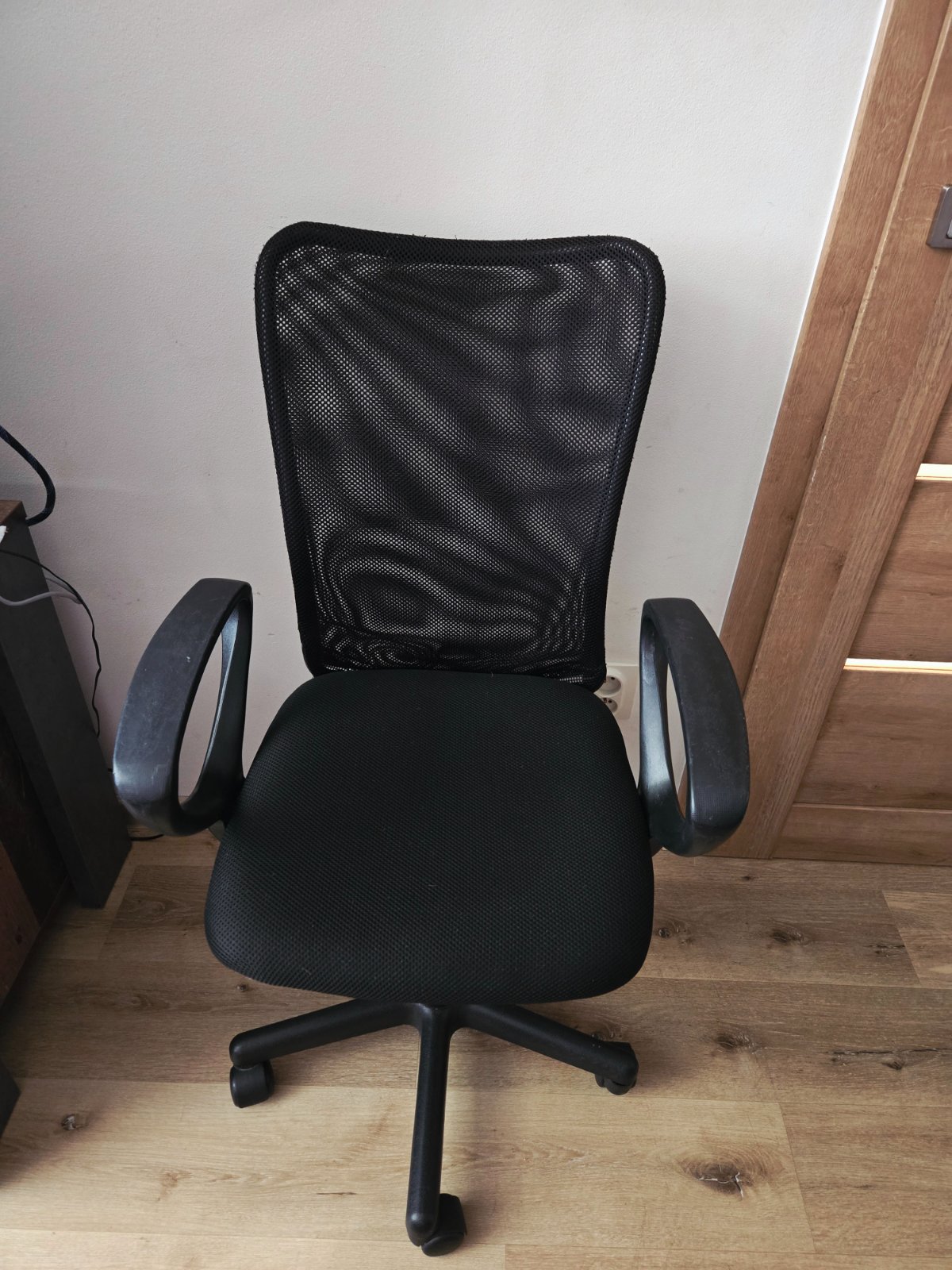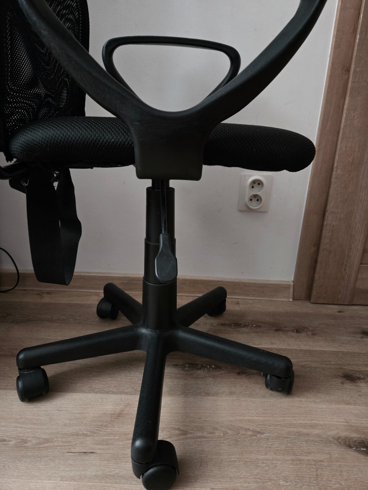 Praktická čierna stolička, pohodlný podsedák, bočné podrúčky, zadné operadlo pružné. Nastaviteľná výška. Pohyb cez otočné kolieska. Otočná. Používaná 2 roky.