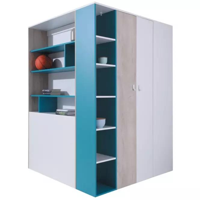Kombinovaná rohová šatníková skriňa z programu Planet – kombinácia svetlého dubového dekoru, bielej a morskéj modrej farby vyzerá zaujímavo. Nábytok je tak ideálny pre zariadenie detskej alebo študentskej izby, prípadne i dospelých. Obsahuje praktické členité vnútorné priestory i vonkajší odkladací regál.