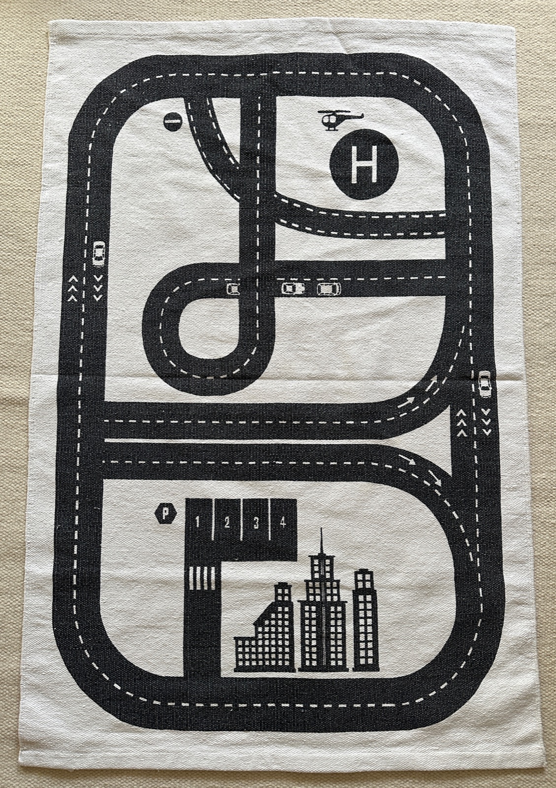 Bavlnený koberček 90 x 130 cm s motívom cesty - poslúži aj ako koberec aj ako hracia podložka pre naháňačku s autíčkami. Čistý, bez poškodení.