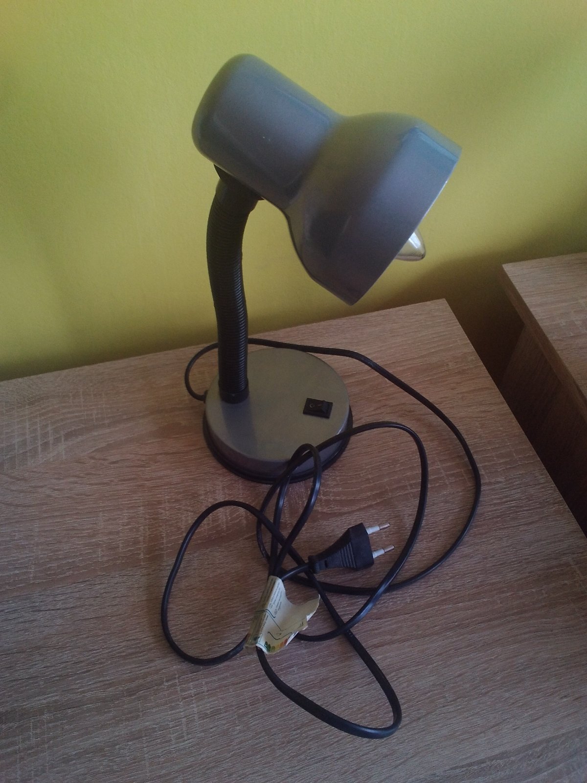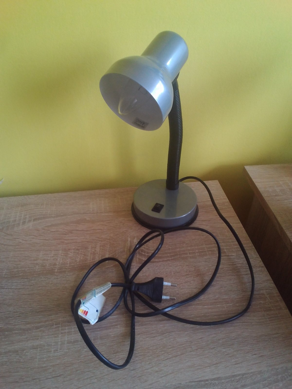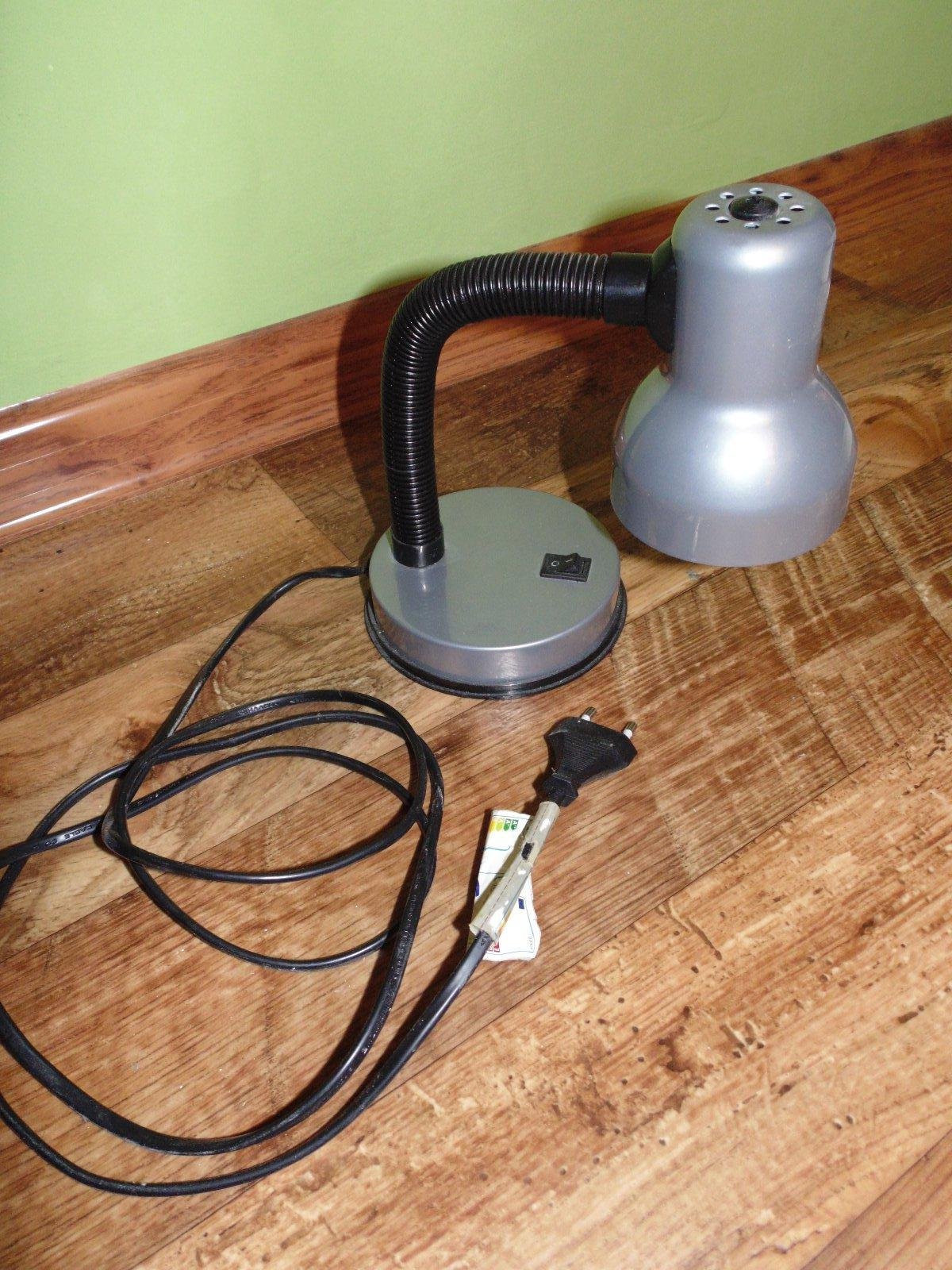 Strieborná/šedá stolná kancelárska lampa vhodná najmä do detskej izby alebo dielne na stôl.