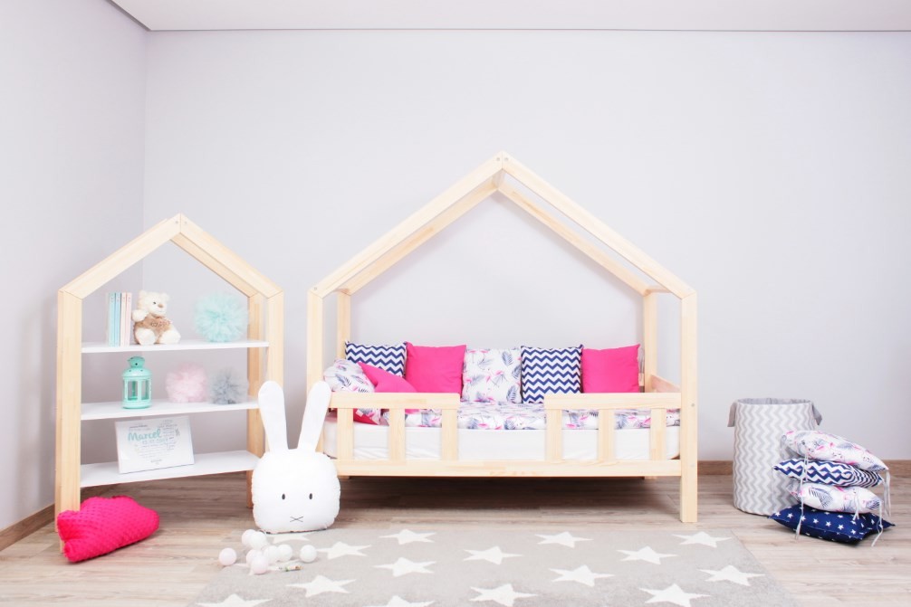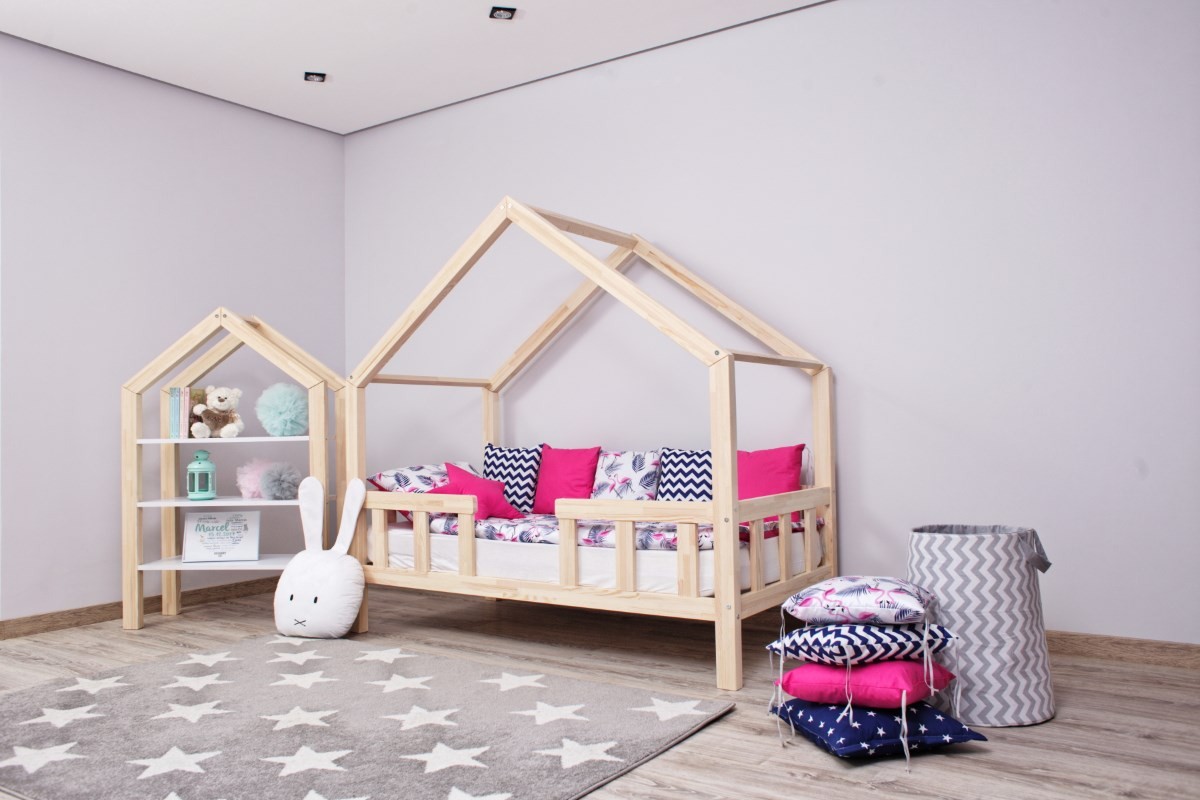Posteľ DOMČEK - Posteľ a zábradlie - pohodlné lôžko pre detskú izbu v 12 veľkostiach s doplnkovým príslušenstvom. Leštené drevo so zaobleným hranami