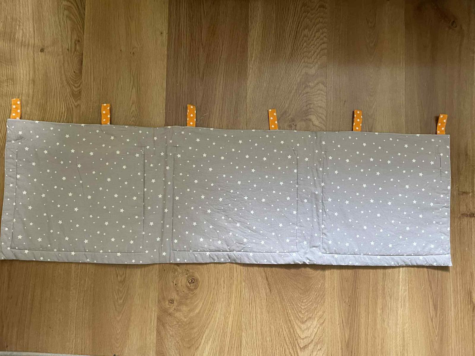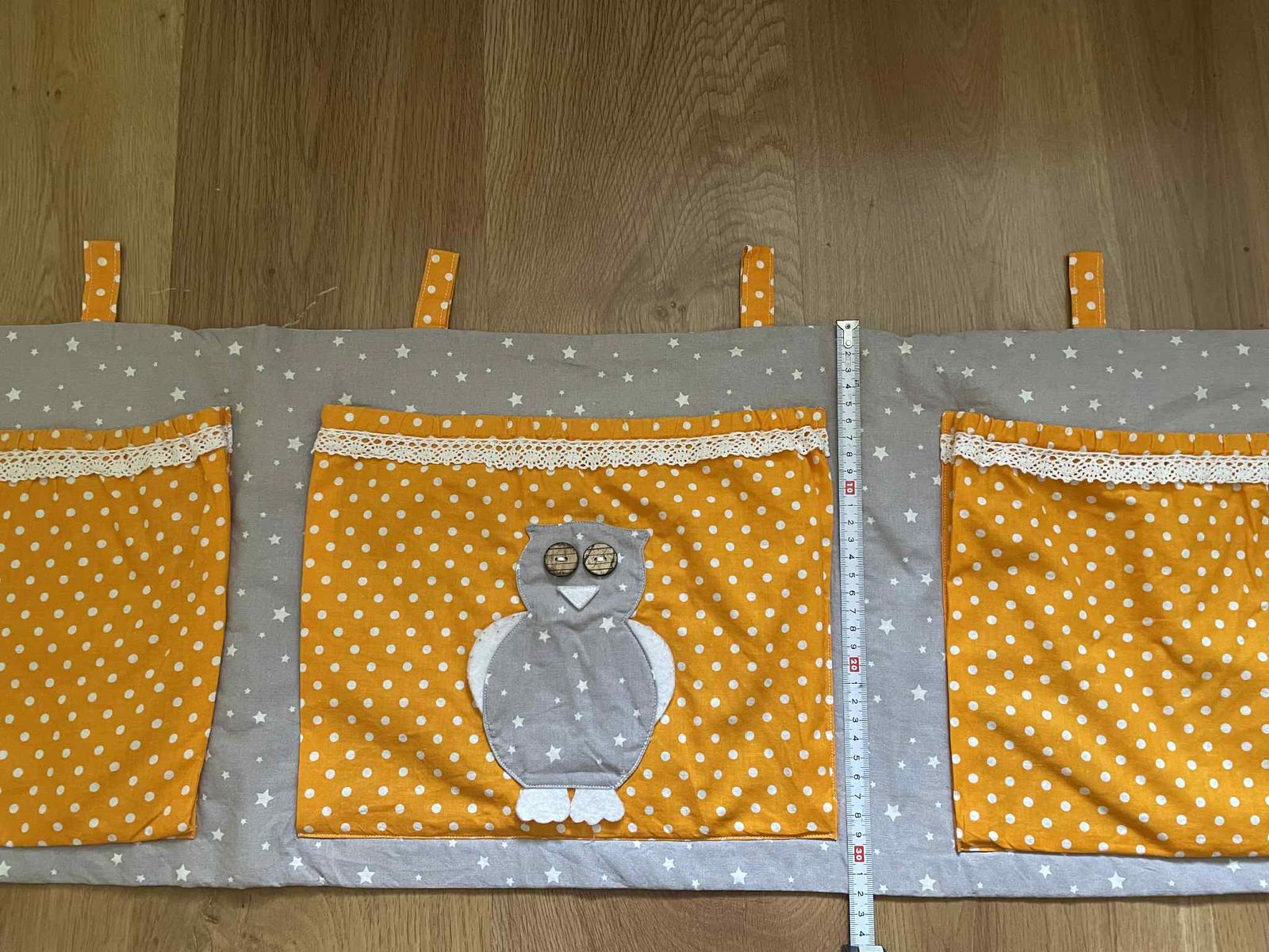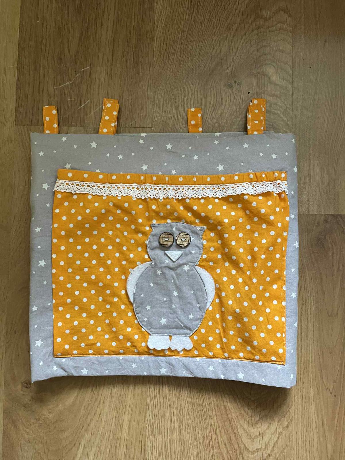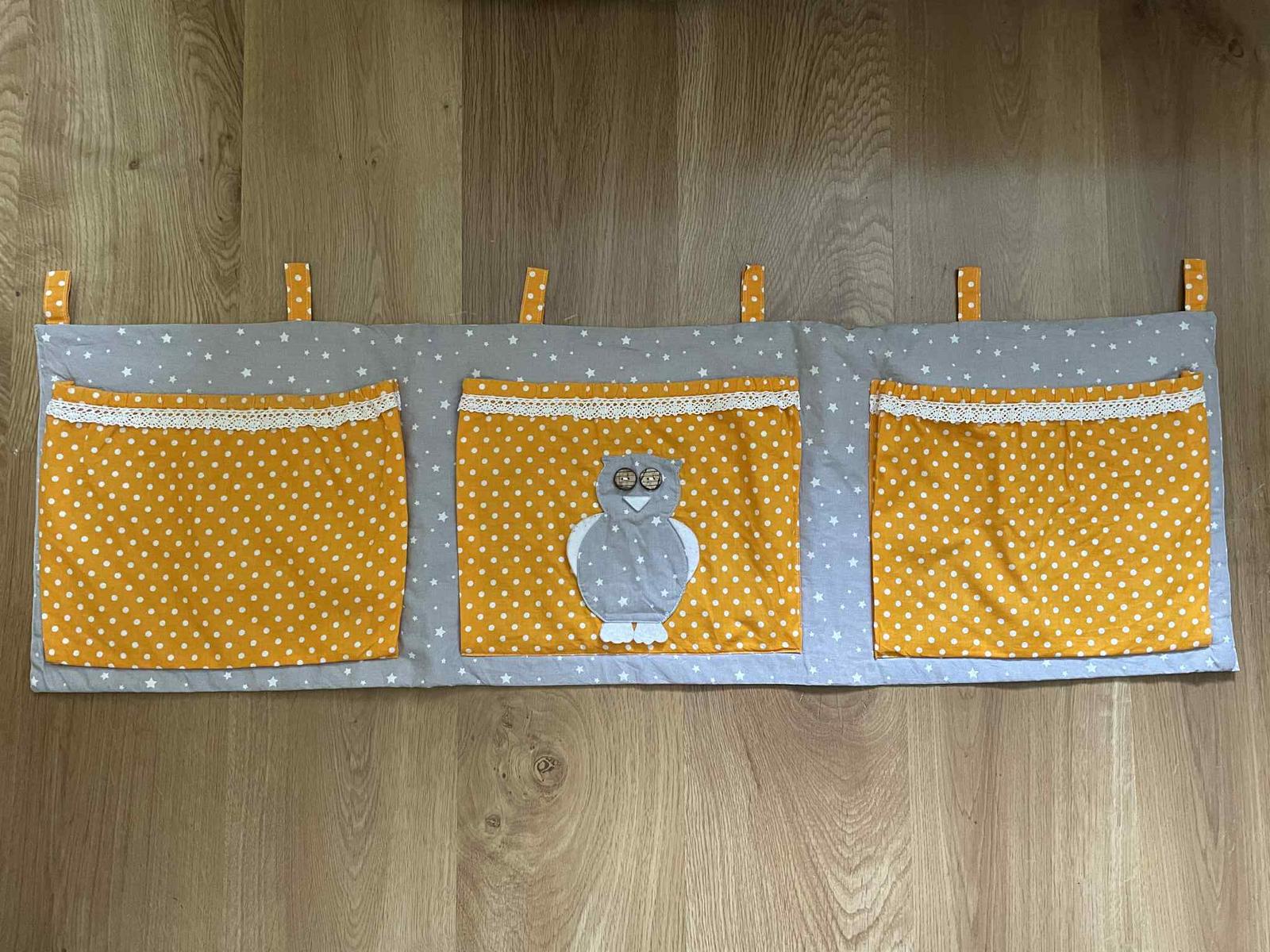 Predám závesný organizér na stenu (vhodný k prebaľovaniu) v skvelom stave, handmade. Organizér má 3 pohodlné vrecká (my sme tam mali plienky a hračky, môžete ho upevniť na prebaľovací pult alebo zavesiť na stenu (u nás to bolo zavesené na stene nad prebaľovacím pultom, aby sme mali všetko poruke).