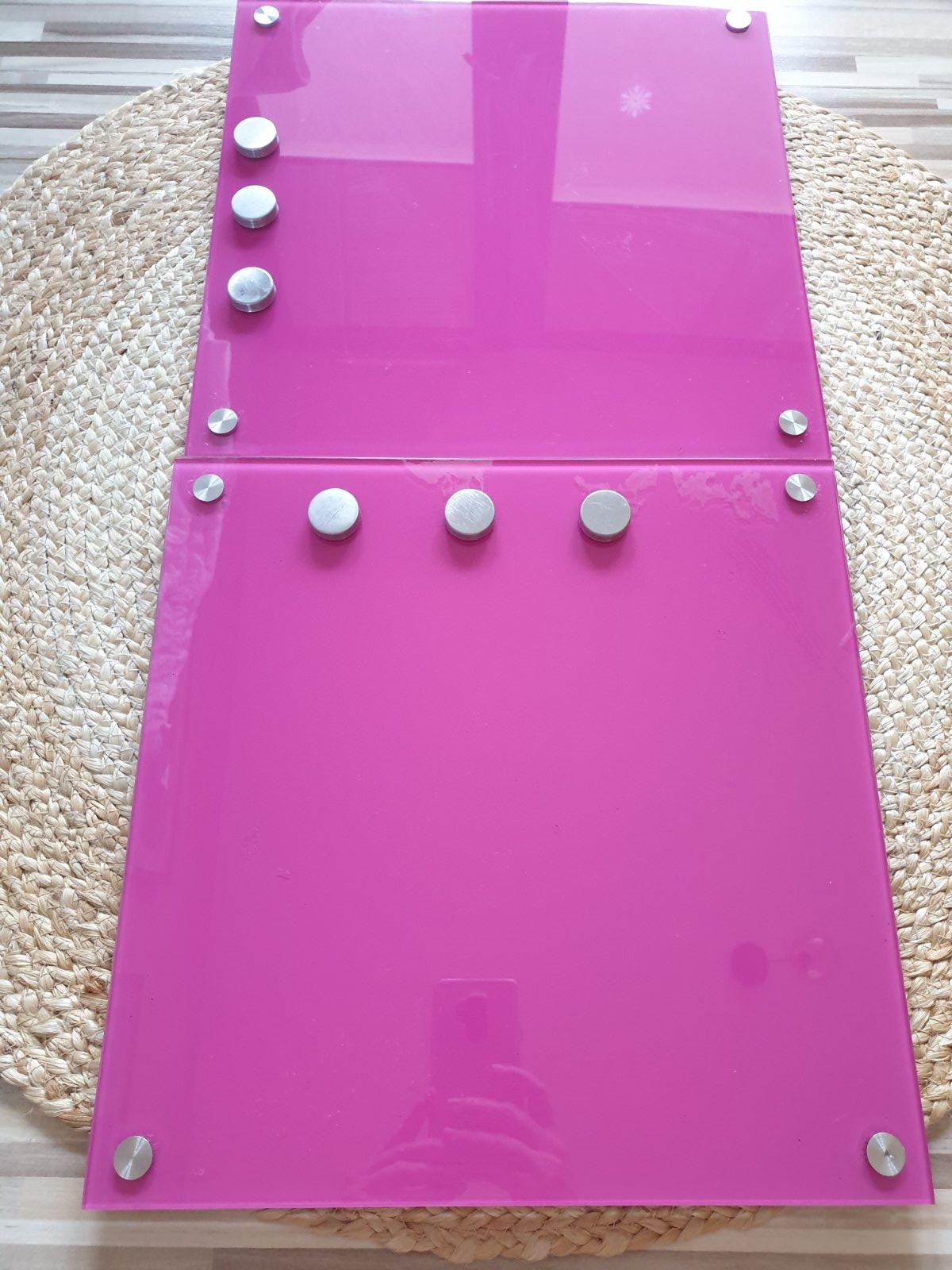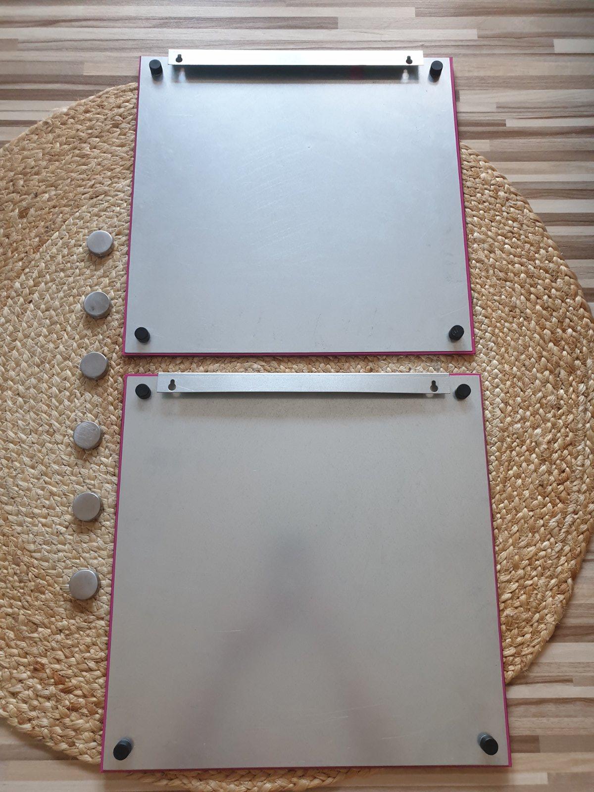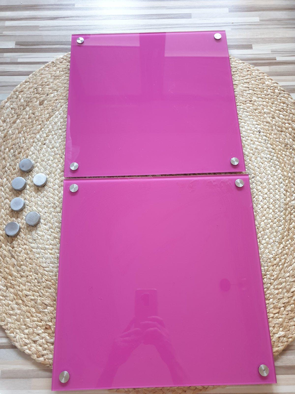 2 x sklenená magnetická tabula s magnetmi, pekný doplnok do dievčenskej izby alebo pracovne, dajú sa zavesiť na stenu, dá sa ne kresliť a pripinať odkazy a pod... Rozmer tabuľe je 35 x 35 cm. Cena spolu za 2 ks.