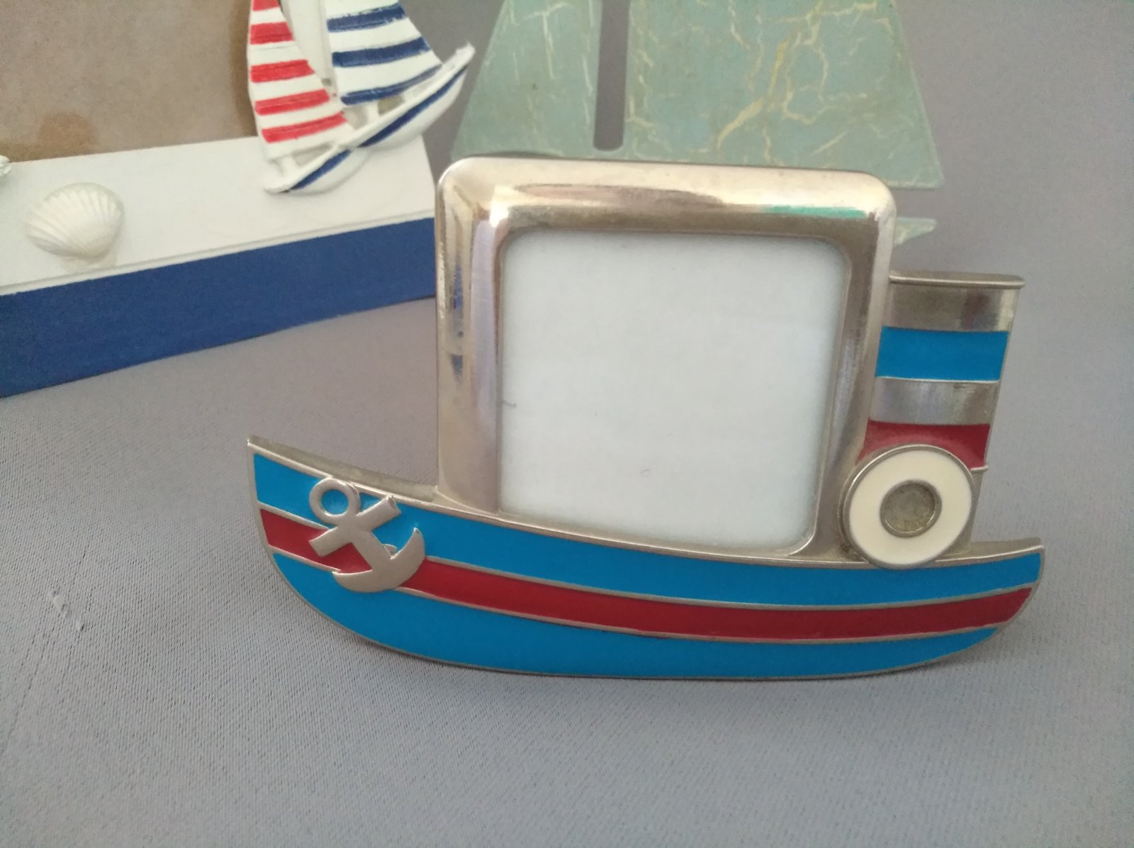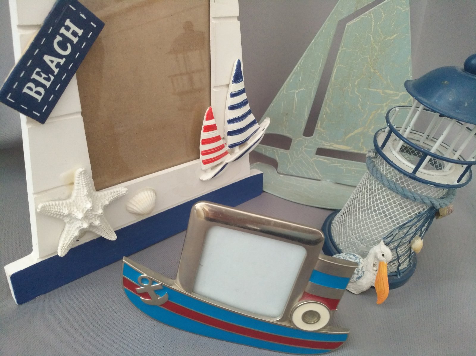 Predam pouzivane doplnky do detskej izby v namornickom style. Ozdobna plachetnica smalt-plech 22x15cm, ram na foto - majak - dreveny 30x17cm - predany, ram na foto kov/nerez- lod 22x15cm, majak svietnik 13cm- predany