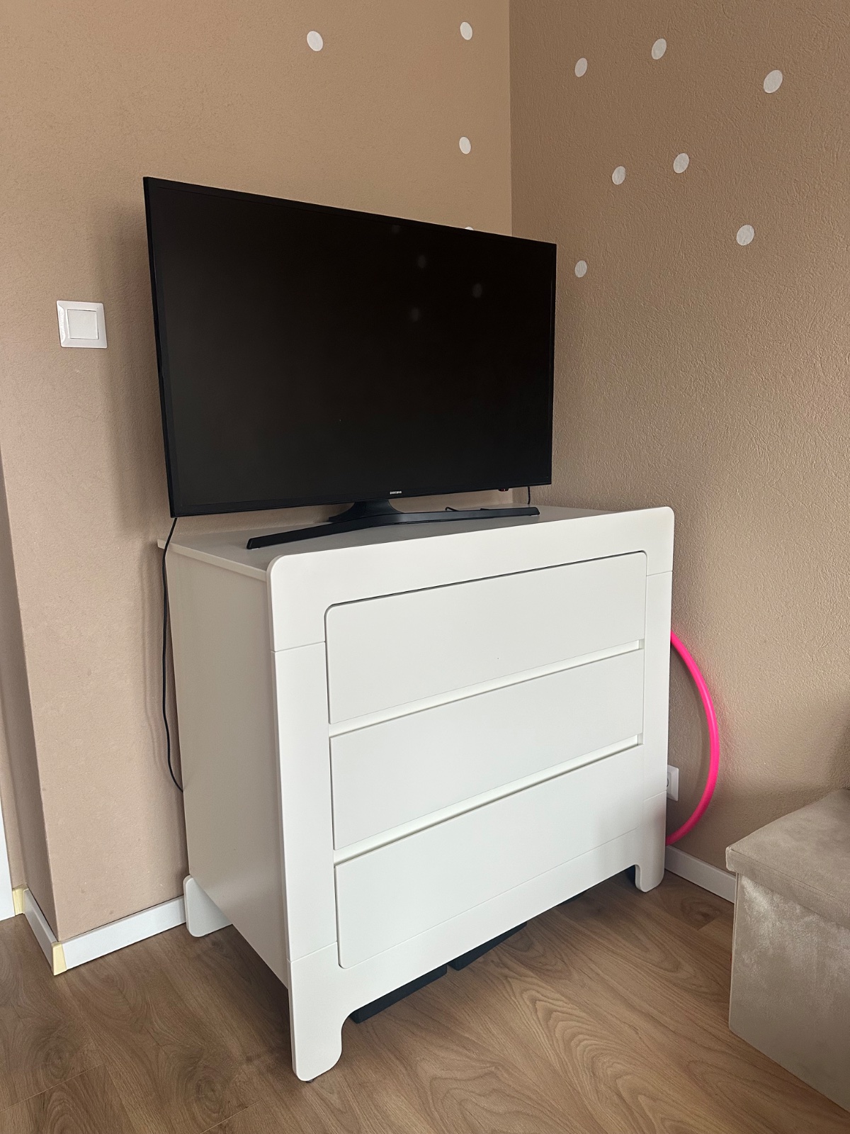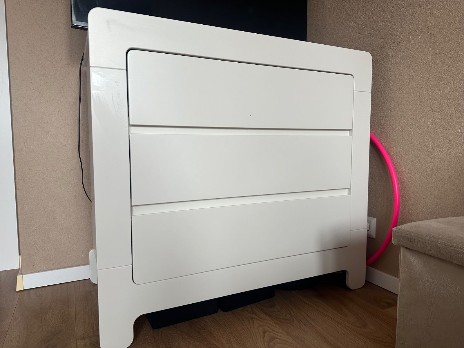 Komoda Pinio Moon s 3 zásuvkami je tichá a pohodlná na používanie vďaka kvalitnému systému zásuviek s mäkkým zatváraním. To umožňuje jednoduché používanie aj vtedy, keď vaše dieťa spí. Rozmery 93 × 100 x 52 cm, hmotnosť cca 62 kg.
