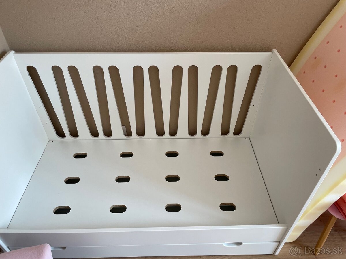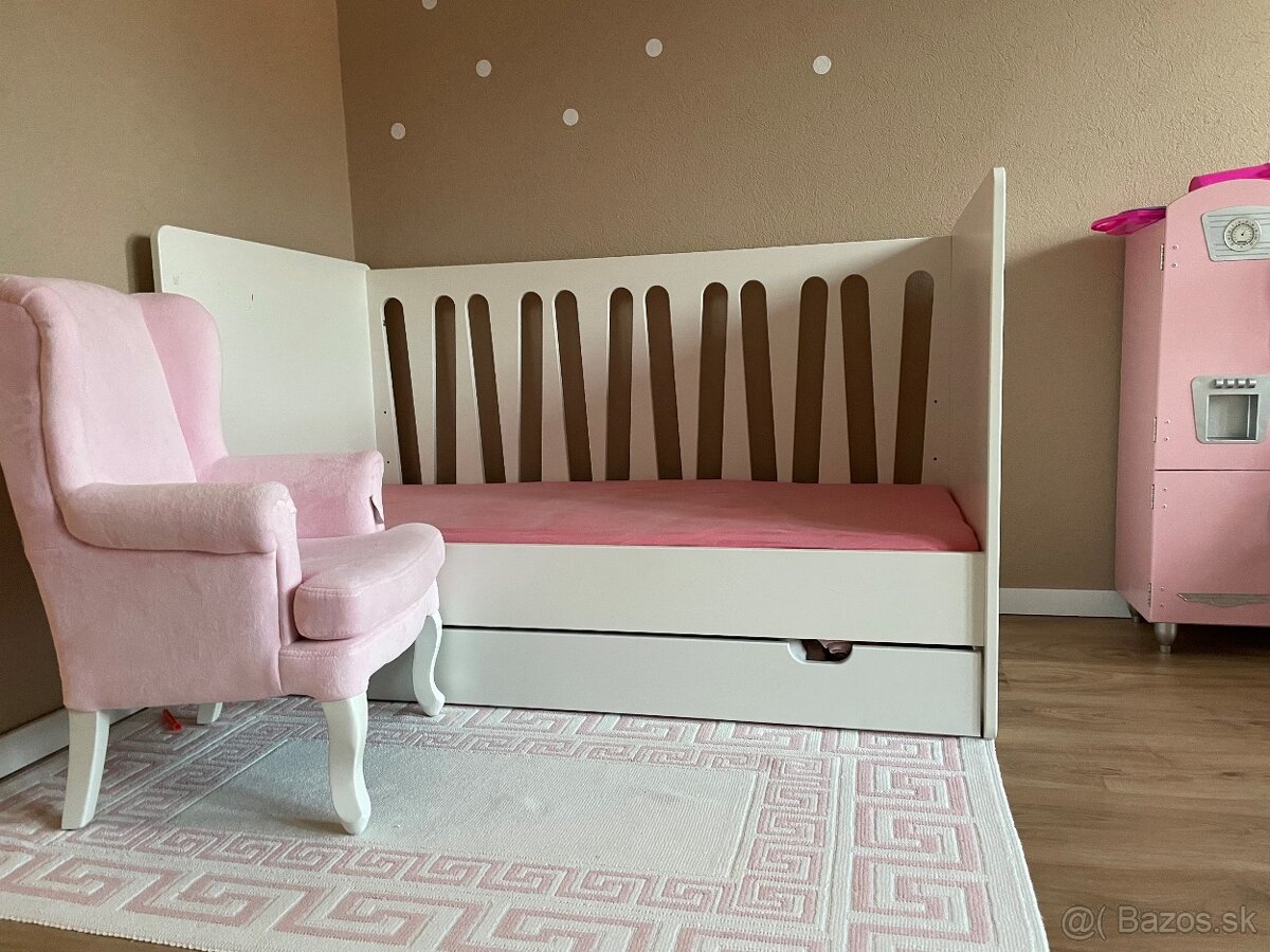 Posteľ má veľkosť 70 x 140 cm a jej súčasťou je aj rošt. Výšku roštu s matracom je možné nastaviť do troch úrovní a keď zložíte postranné bočnice, máte ihneď aj prvú plnohodnotnú posteľ pre vaše dieťatko. K posteli je aj zásuvka a zábrana.