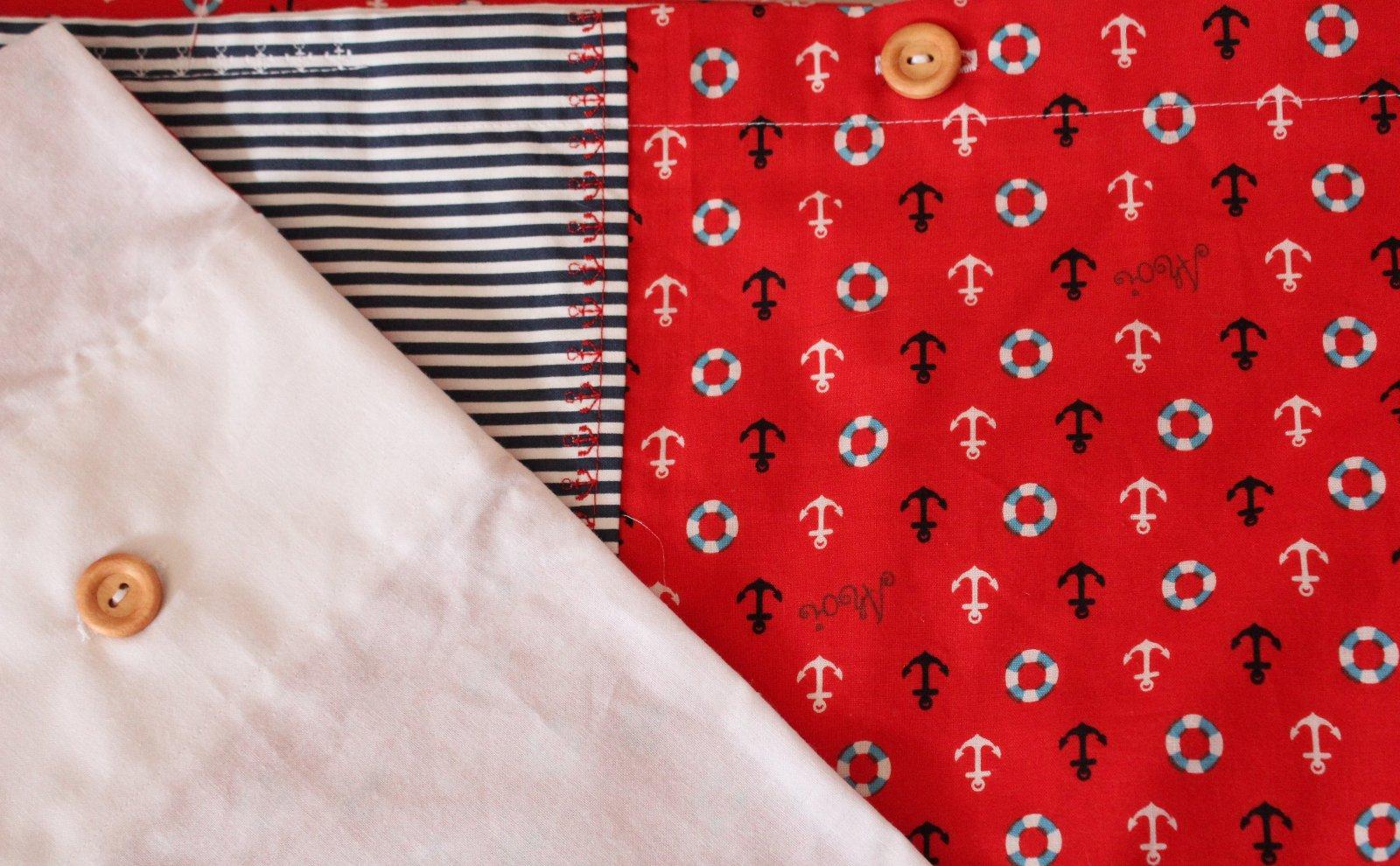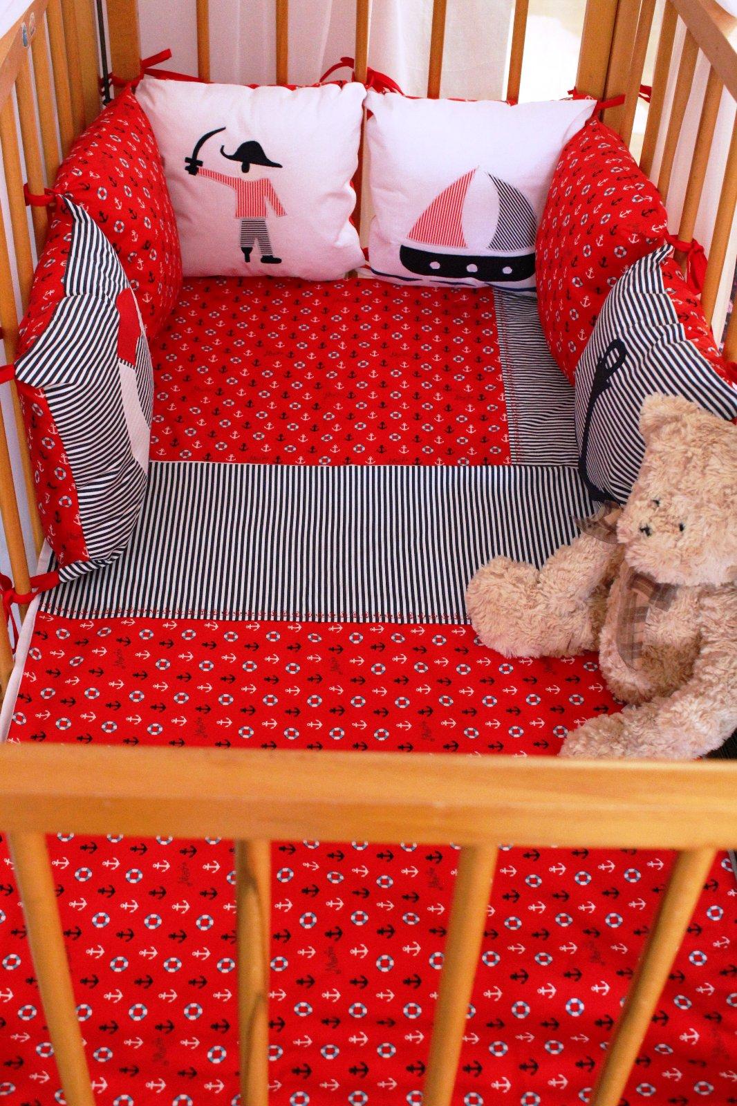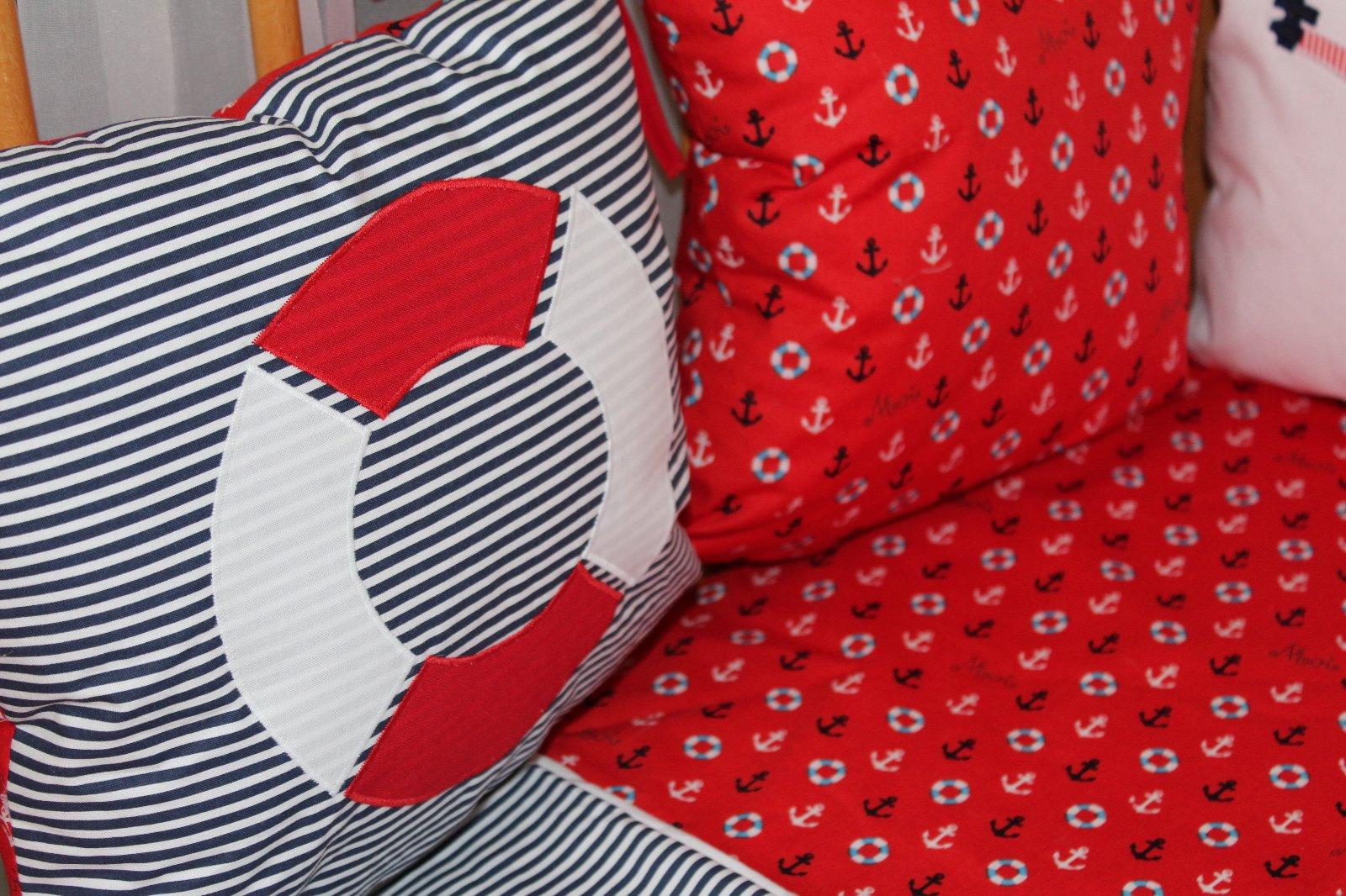 Kompletík do detskej izby námornícky, obliečky dozdobené strojovou výšivkou , hniezdo zložené zo samostatne sa uväzujúcich vankúšikov, keď už z malej postieľky vyrastiete odstrihnete šnúrky a máte samostatné vankúšiky, vreckár a závesy v cene 4 ks . výrobca Coccinella-Patchwork