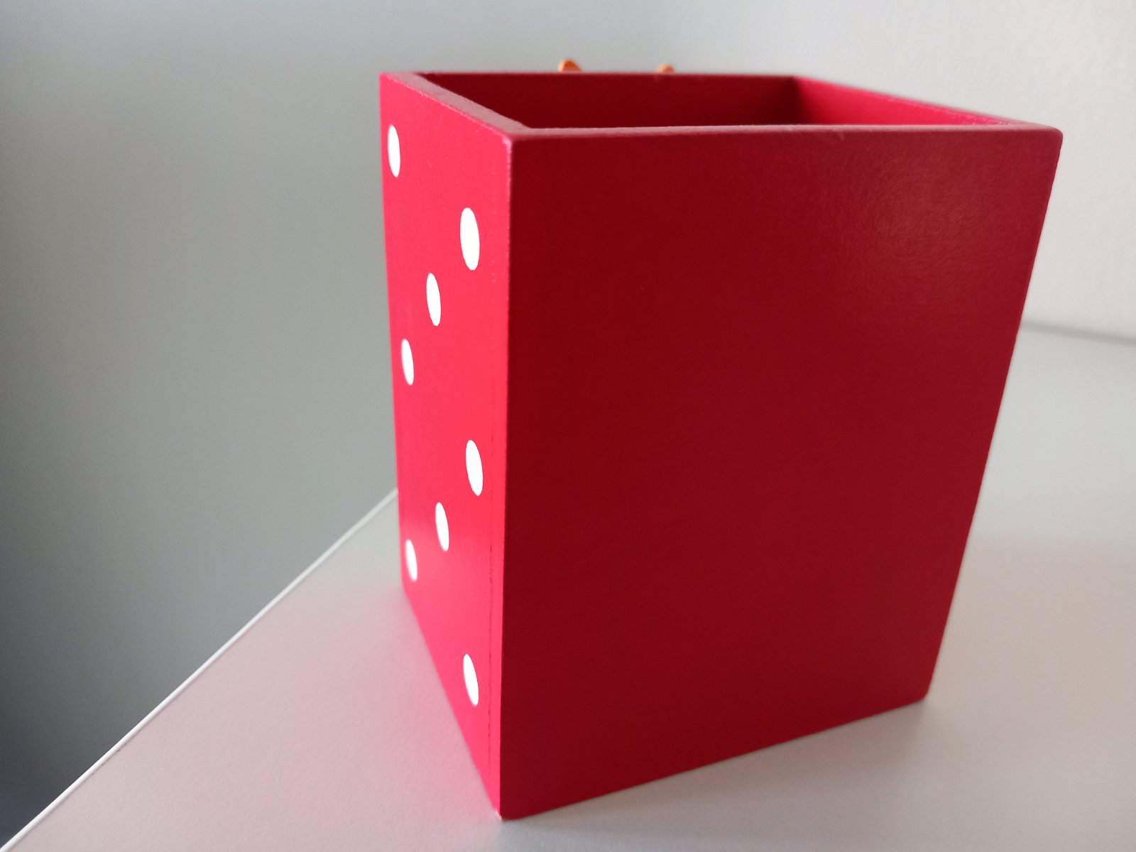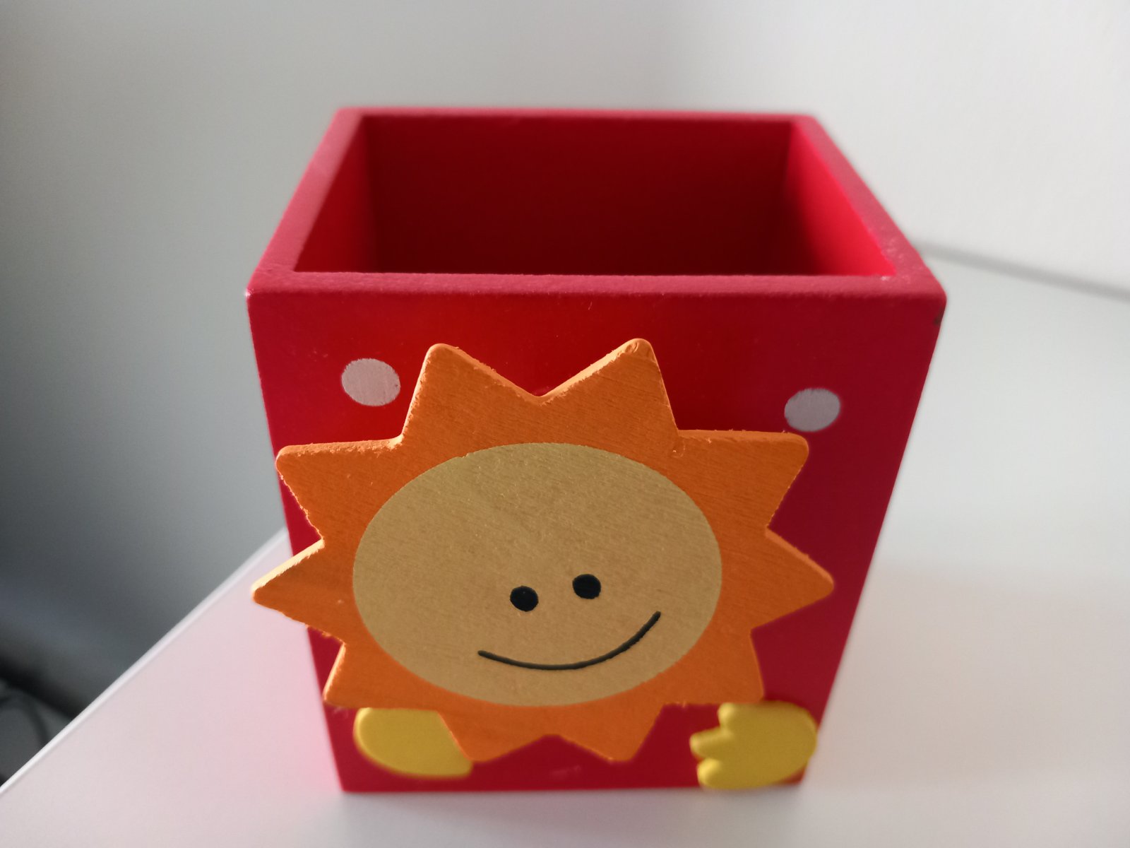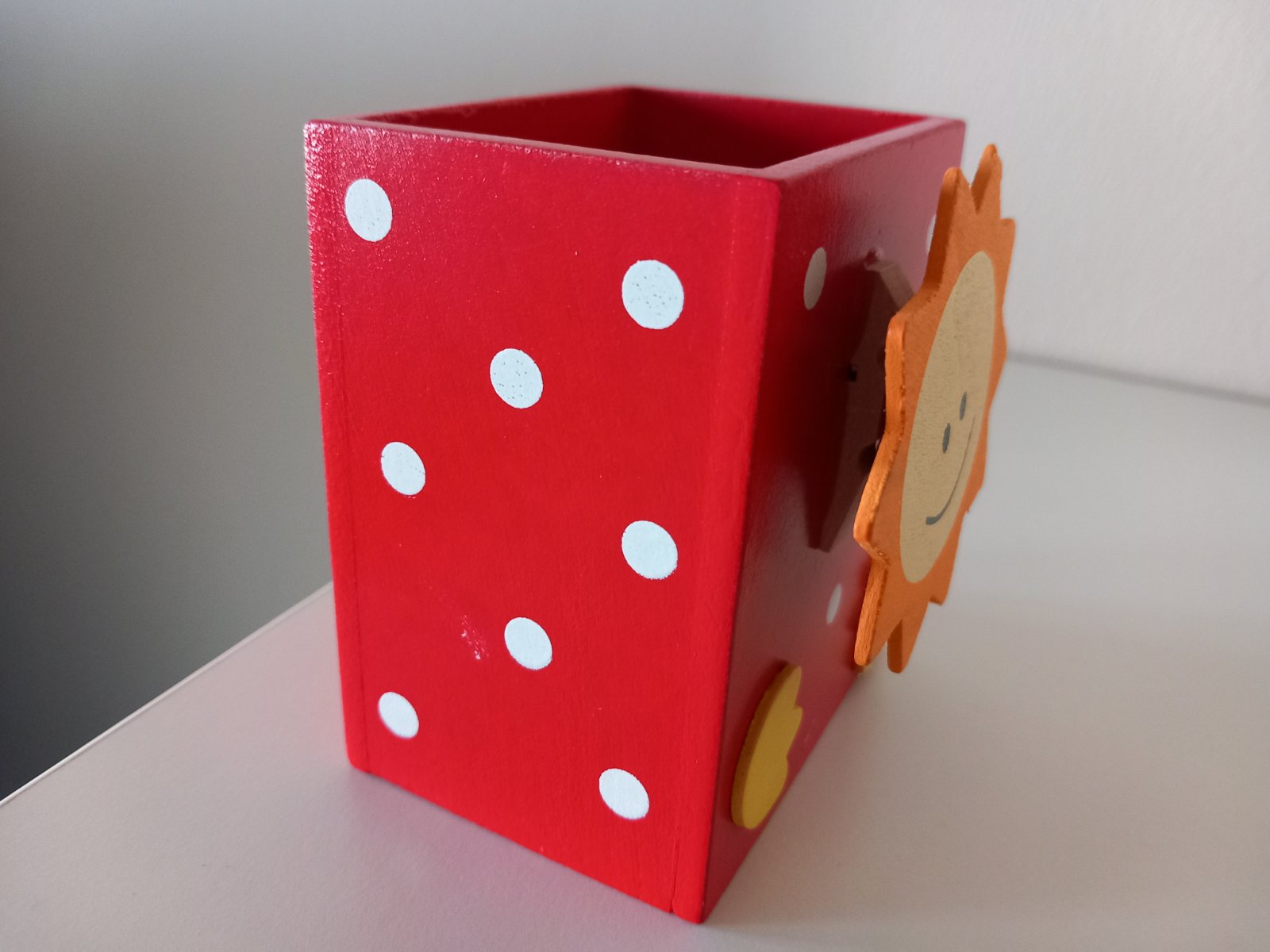 Drevený, ručne maľovaný a zdobený stojanček na čokoľvek podľa potreby a nápaditosti, napr. na perá, ceruzky, mobil... Dcérou nepoužitý, nový. Výška 8,5 cm, šírka 7 cm.