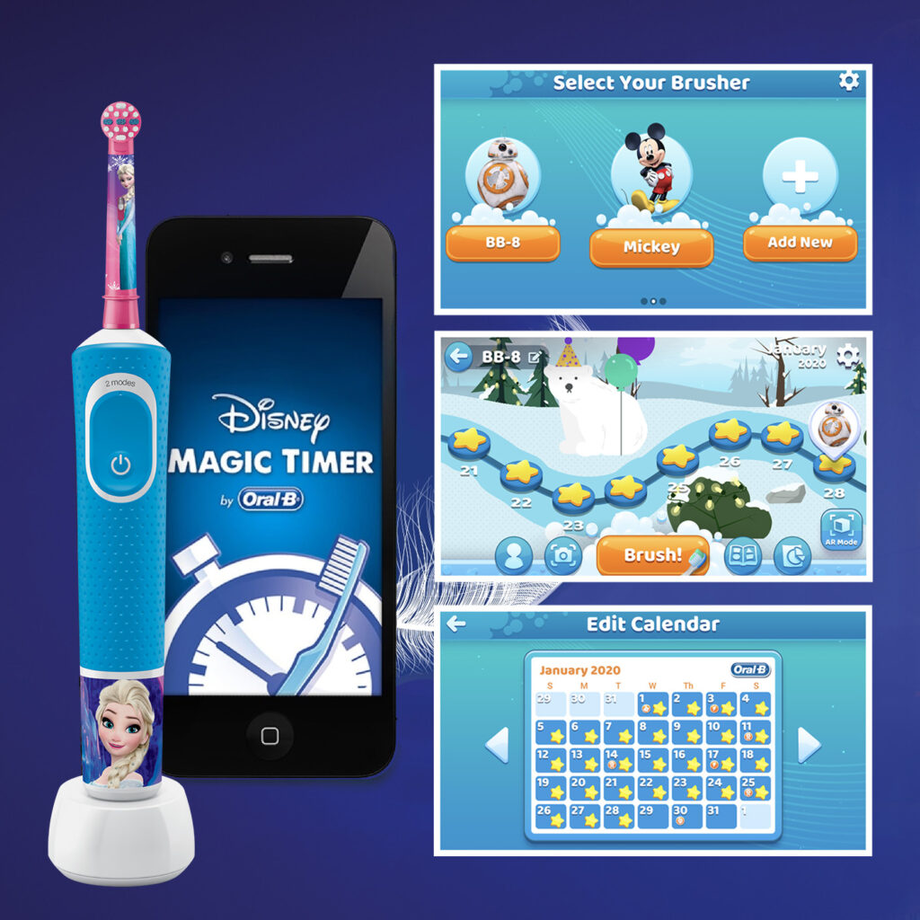 Elektrická zubná kefka Oral-B Kids bola navrhnutá v spolupráci so zubnými lekármi a s ohľadom na bezpečnosť detí. Textúrovaná rukoväť zlepšuje uchopenie, najmä malými a mokrými ručičkami. Vstavaný časovač nahradí dohľad rodiča. Každých 30 sekúnd upozorní dieťa, aby presunulo zubnú kefku do ďalšieho kvadrantu úst a rovnako oznamuje koniec čistenia po dvoch minútach. Od mliečnych zubov až po strojčeky. Zábavná aplikácia Disney Magic Timer pomáha deťom od 3 rokov čistiť zuby dlhšie a v porovnaní s bežnou manuálnou kefkou odstrániť viac zubného povlaku.