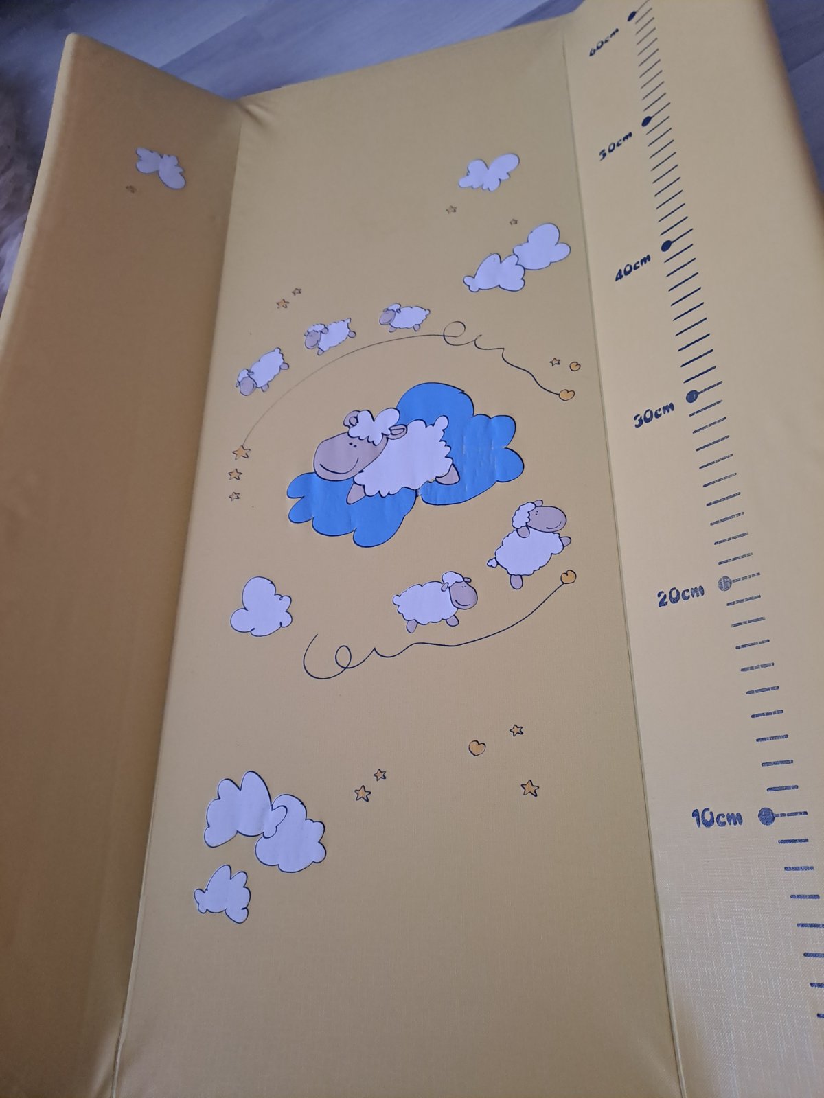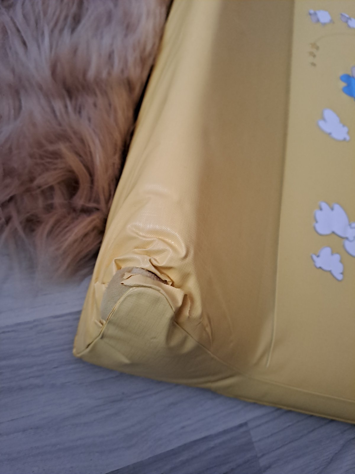 Pevná prebaľovacia podložka. Má jedinú chybičku (viď.foto) prasknutý roh. Inak je bez poškodení. Vnútro, kde leží bábo, je hladké, čisté, bez chybičky.