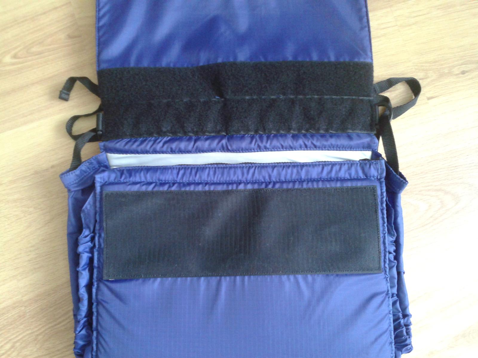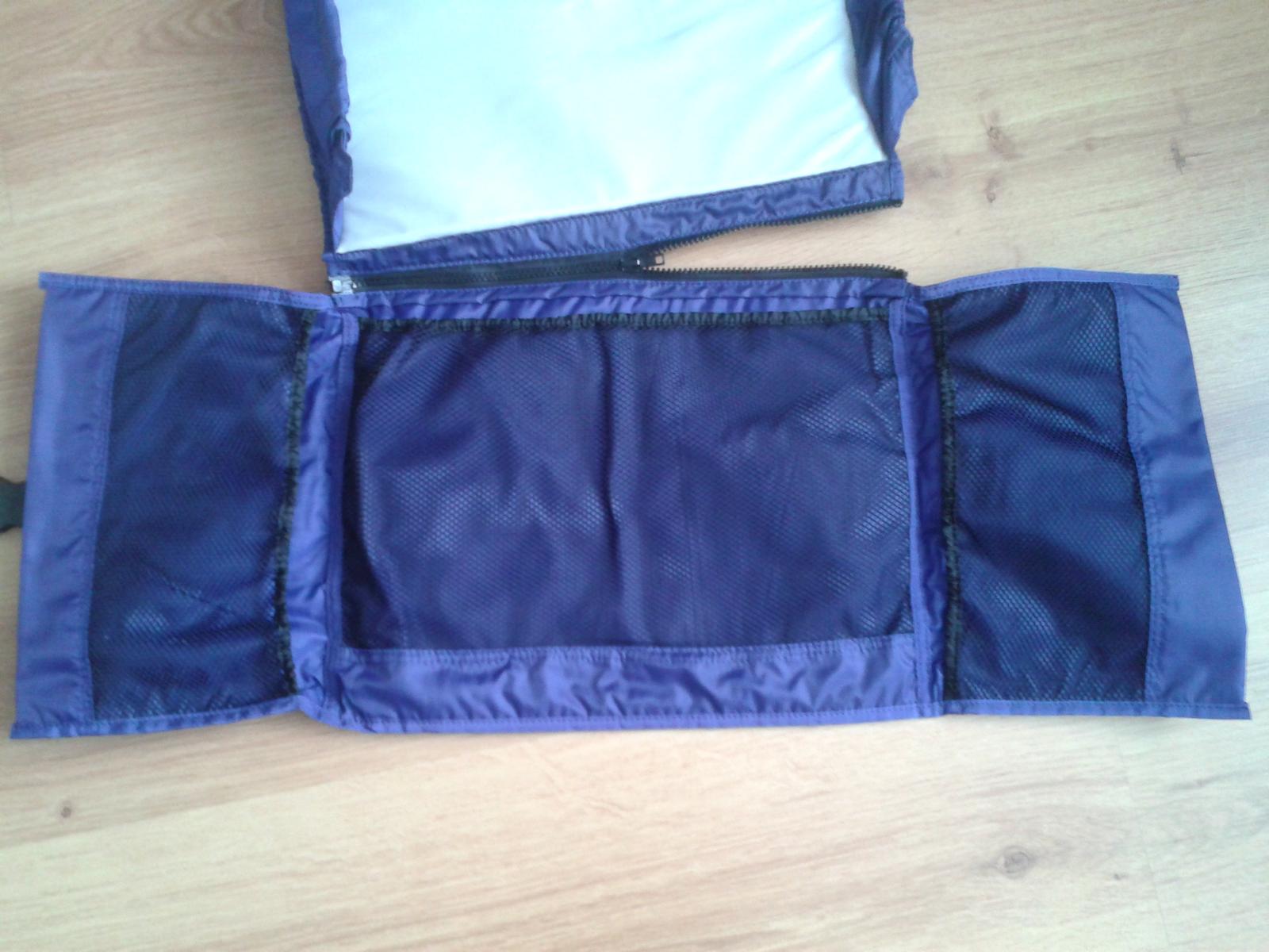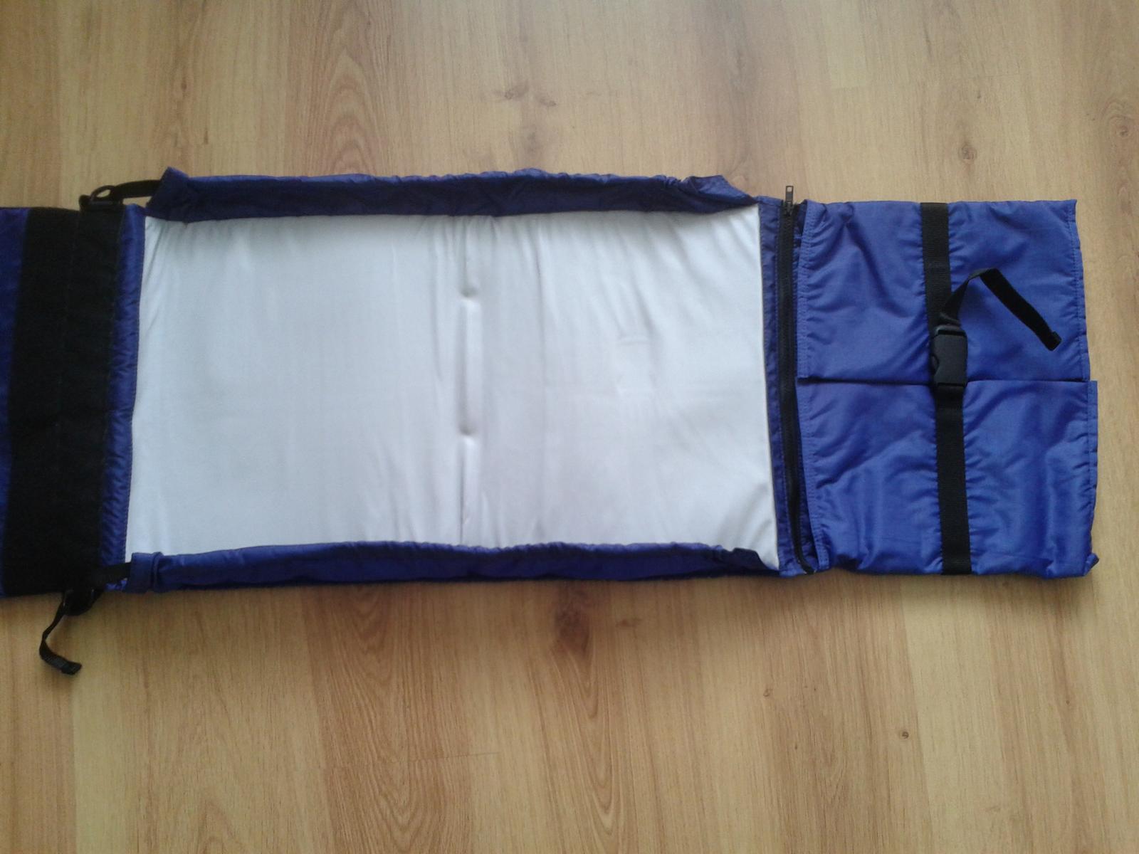 Už len nepoužitá taška , lebo sme mali kočík s taškou. Krásna slivkovomodrá farba. Zložená 37 x 33 cm, vpredu oddelenie na zips, skladanie na suchý zips, podložka má zdvihnuté okraje, jej dĺžka je 60 cm. Zipsom je pripojená časť s 3 vreckami. Ľahučká, " 5 deková ".