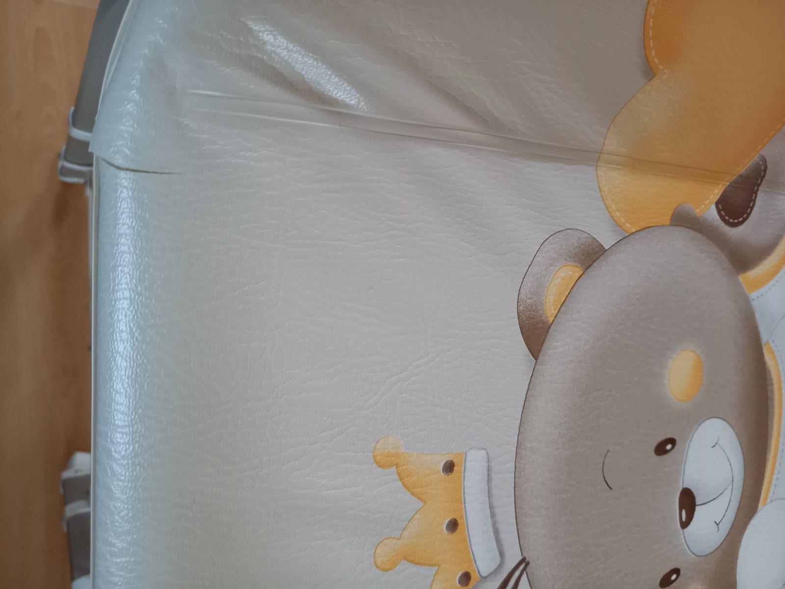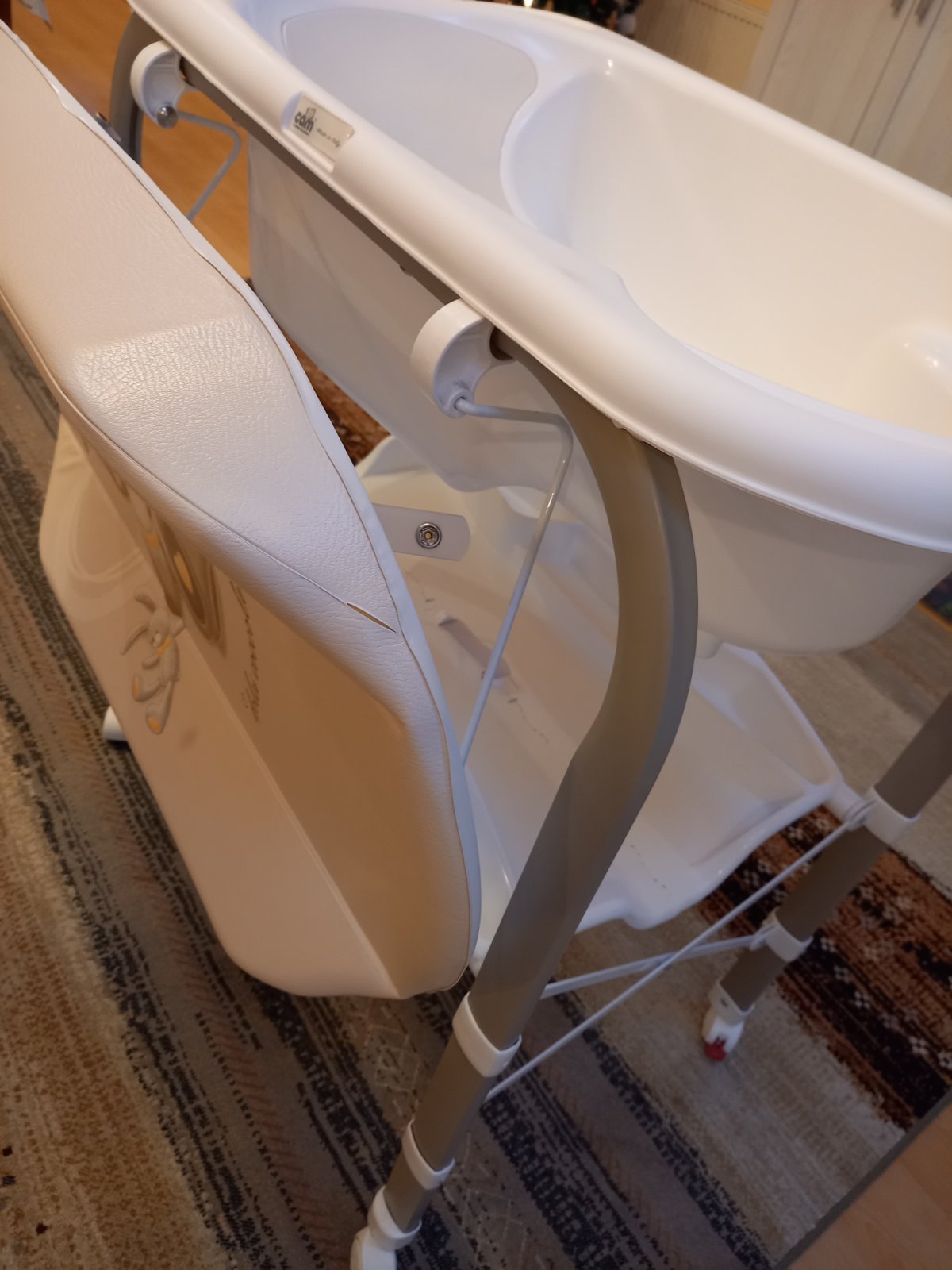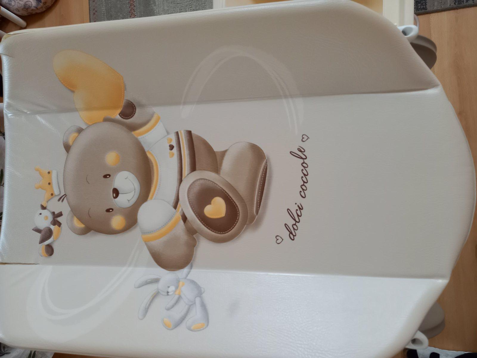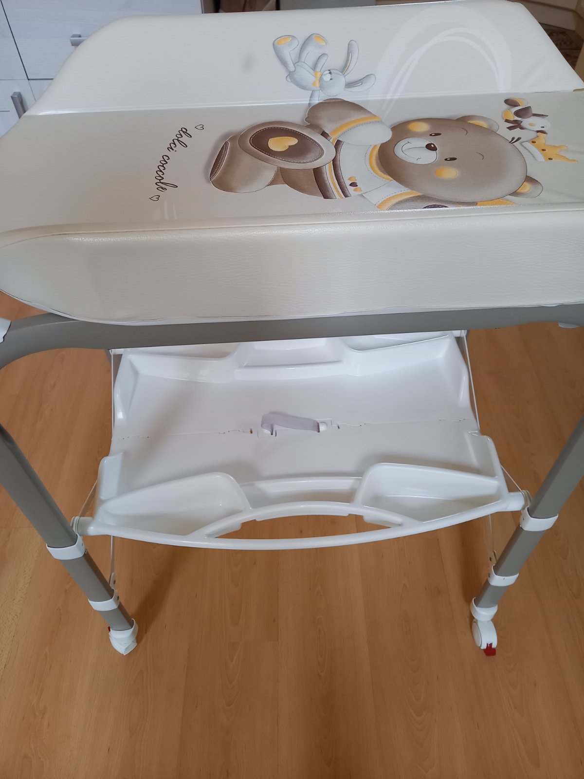 Prebaľovací pult s vaničkou CAM. Jediná chyba je, že vrchná časť je popraskaná, ale vždy sme ho používali prikritý. Vôbec to nebráni používaniu. Ostatné časti sú v super stave, vanička je pekná biela, čistá. Vanička sa dá vybrať a tak sa dá poskladať na menšie rozmery. Hadička na vypustenie vody, veľký odkladací priestor. Pult je na 4 kolesách, 2 majú brzdy, manipulácia je ľahká, praktická.