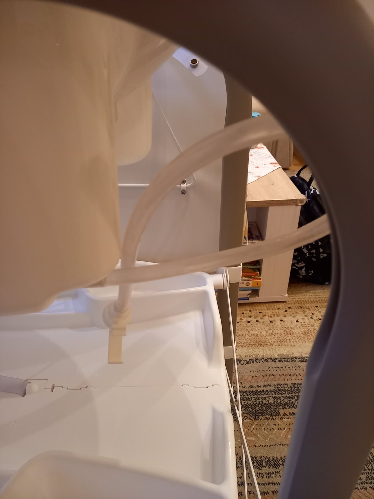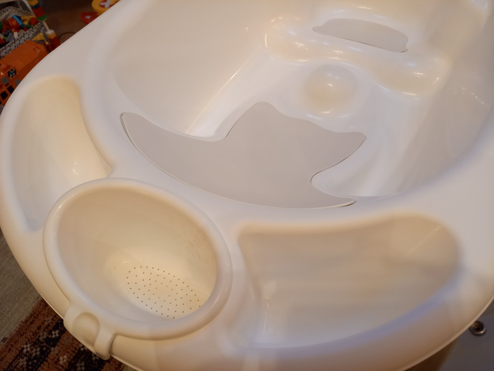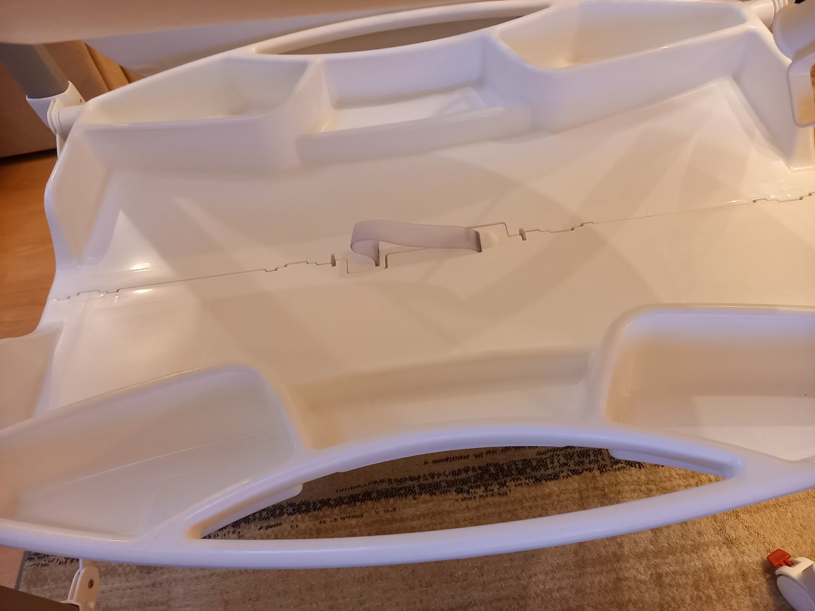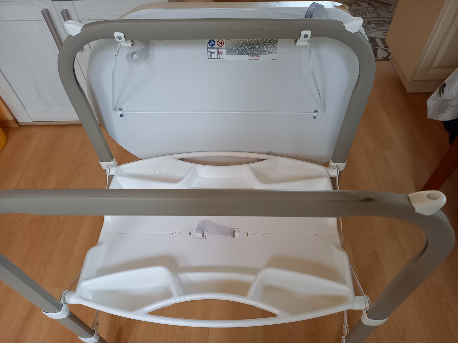 Prebaľovací pult s vaničkou CAM. Jediná chyba je, že vrchná časť je popraskaná, ale vždy sme ho používali prikritý. Vôbec to nebráni používaniu. Ostatné časti sú v super stave, vanička je pekná biela, čistá. Vanička sa dá vybrať a tak sa dá poskladať na menšie rozmery. Hadička na vypustenie vody, veľký odkladací priestor. Pult je na 4 kolesách, 2 majú brzdy, manipulácia je ľahká, praktická.