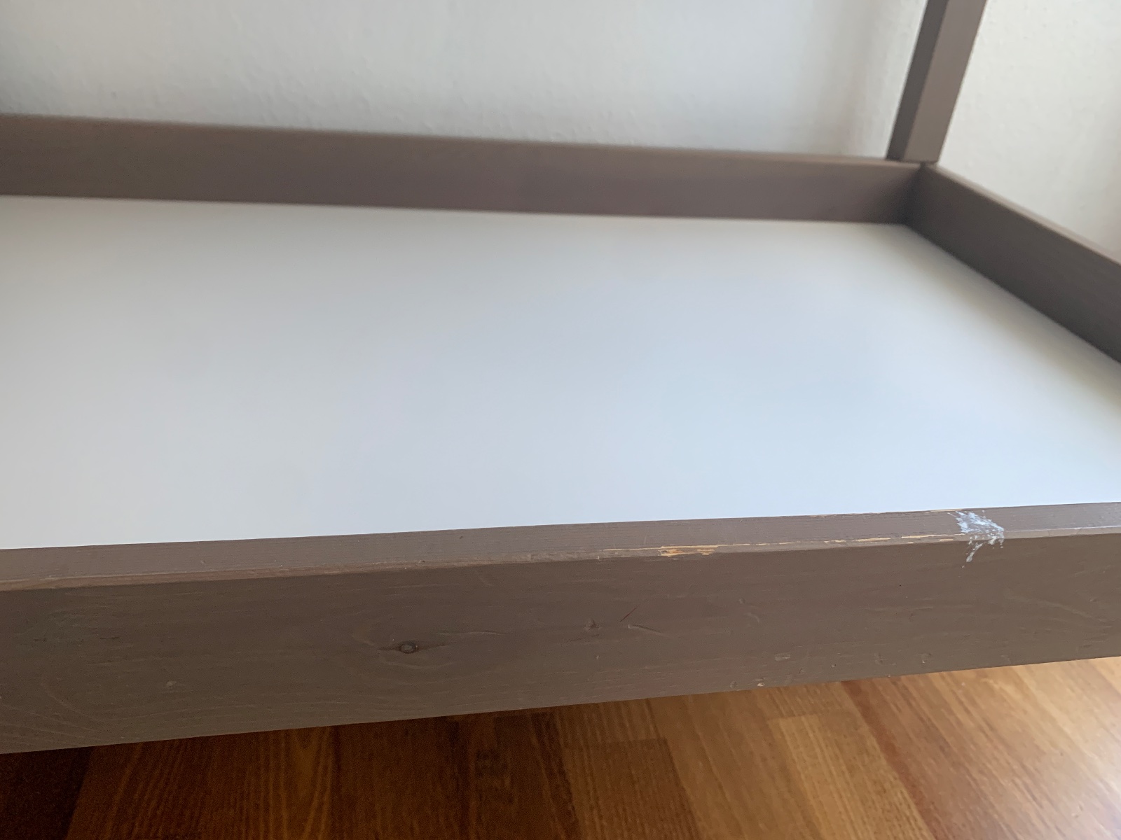 Prebalovací pult chicco. Podlozka sa nám začala trhať na jednej strane. Zalepená, viď.foto. Prikladám úplne nový návlek na prebaľovačí pult. Jednoduchá manipulácia, 3 výšky nastavenia.