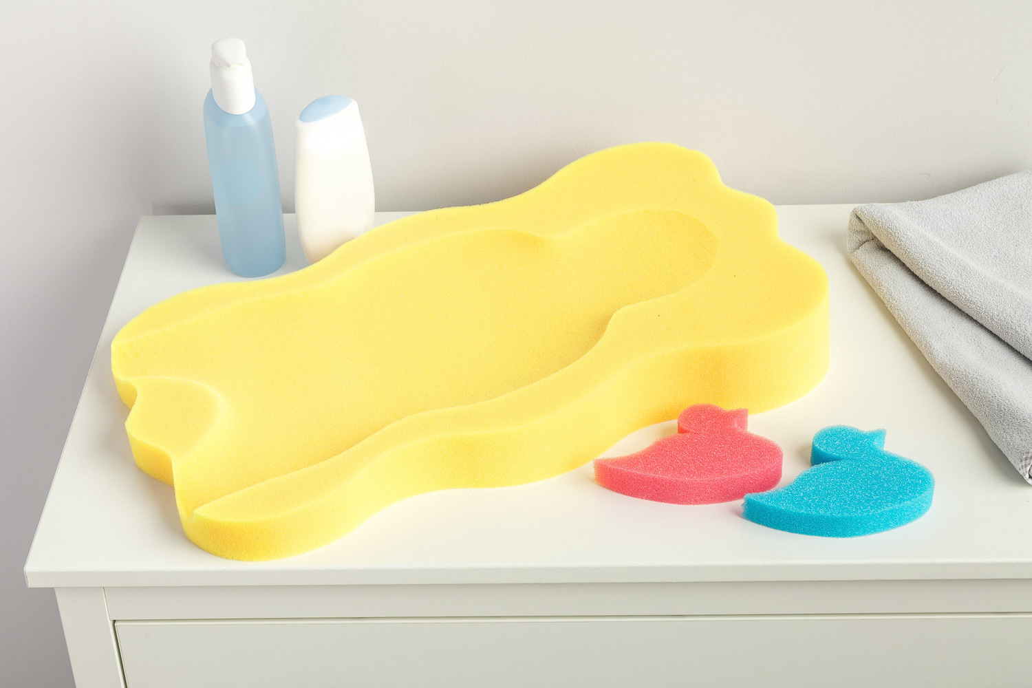 Mäkká penová podložka na kúpanie pre bábätká. Podložka umožňuje jednoduché a bezpečné kúpanie detí. Súčasťou balenia sú 2 umývacie hubky v tvare zvieratiek. Neobsahuje žiadne škodlivé látky a je citlivá na najjemnejšie detskej pokožke. Podložka má príjemné farby, a je veľmi praktickým pomocníkom v starostlivosti o bábätko.