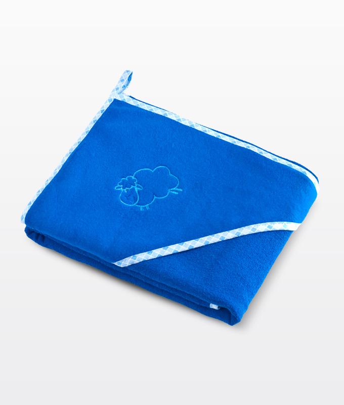 Detská osuška značky Sensillo s výšivkou roztomilej ovečky na kapucni. Celá osuška je olemovaná farebným lemom so vzorkou. Krásne zahreje dieťa po kúpeli a kapucňa chráni hlavičku dieťatka.