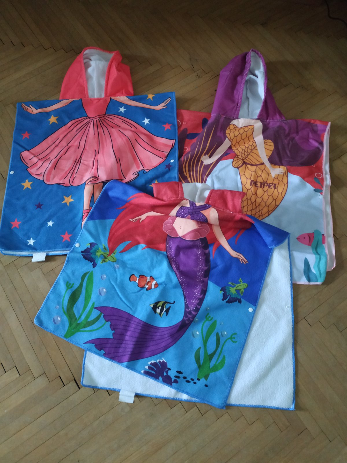 Dievčenské pončo osušky ( v ponuke už len 2 horné). Spolu 10€, jednotlivo 7€/ kus.