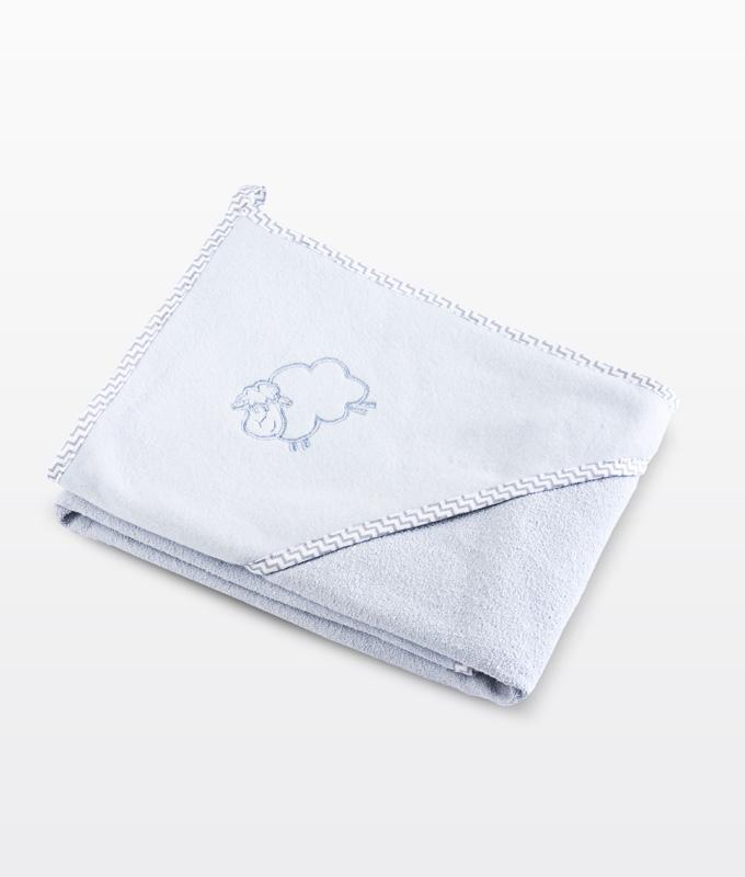 Detská osuška značky Sensillo s výšivkou roztomilej ovečky na kapucni. Celá osuška je olemovaná farebným lemom so vzorkou. Krásne zahreje dieťa po kúpeli a kapucňa chráni hlavičku dieťatka.