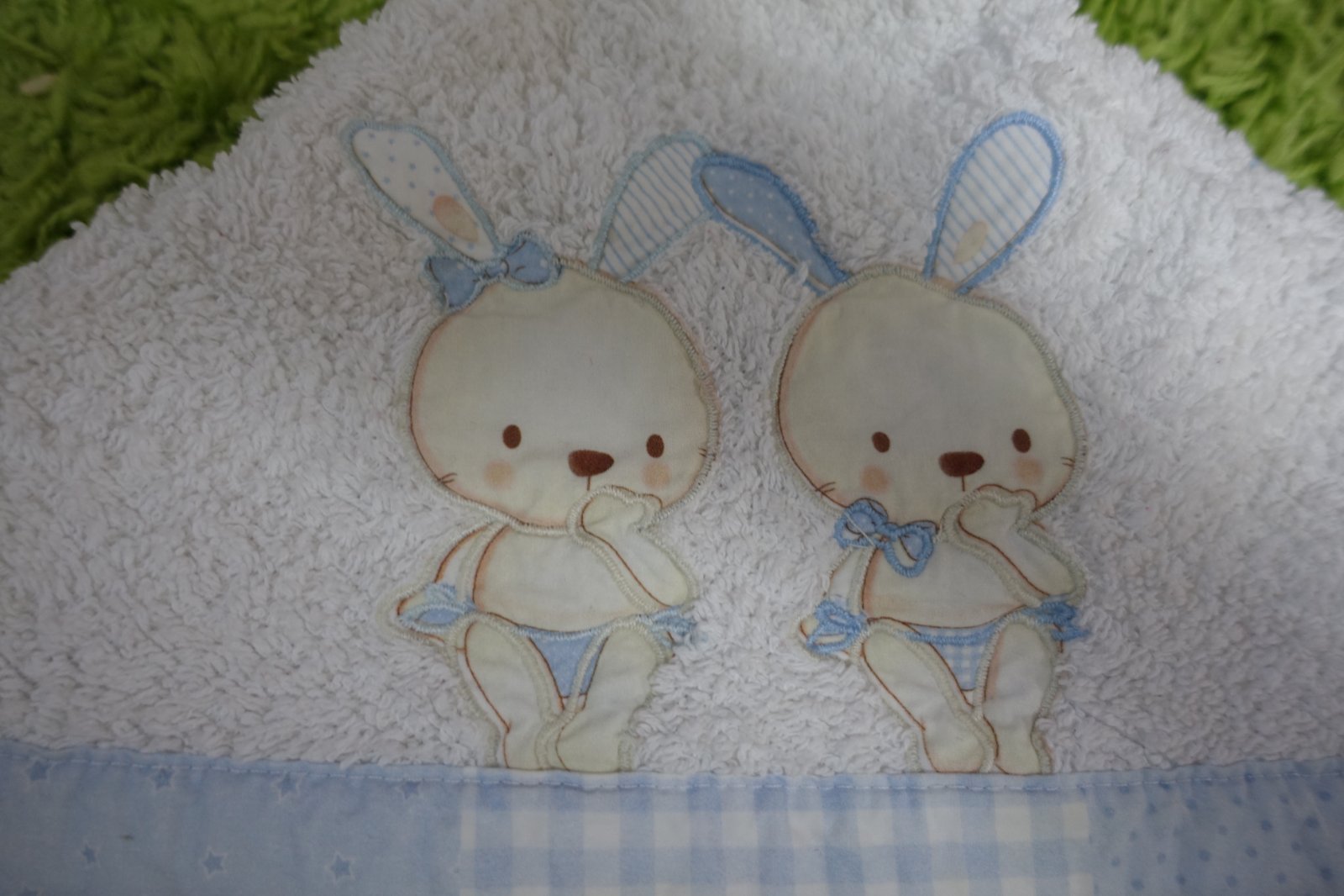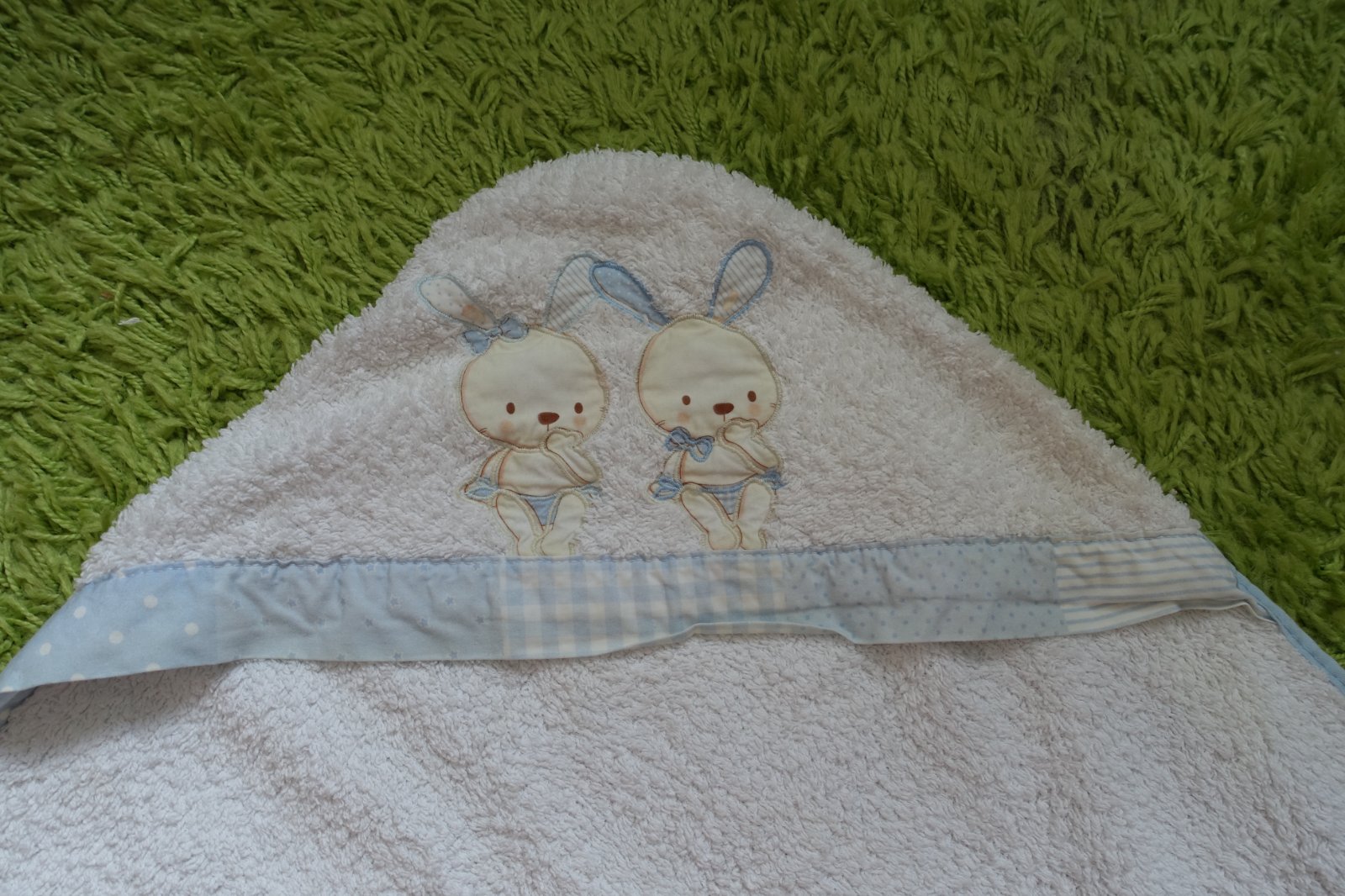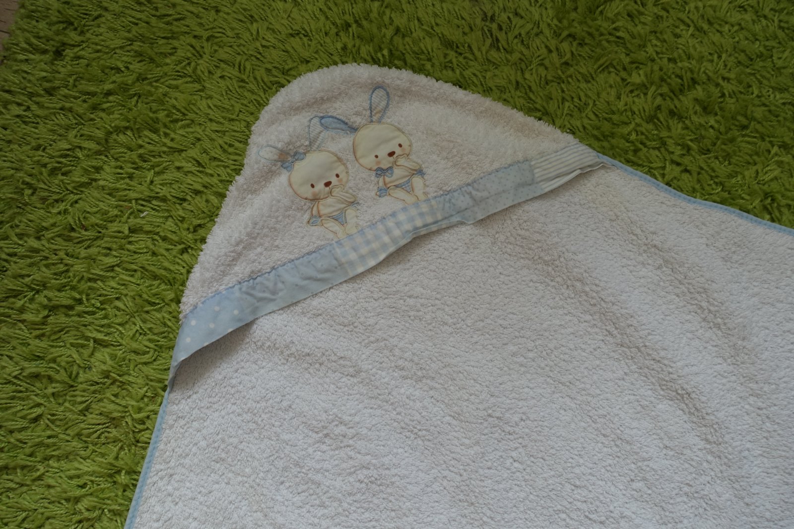 Predám krásnu veľkú bielu detskú frote osušku so zajačikmi na kapucni značky Interbaby. Bola používaná, ale je v peknom používanom stave. Našla som na nej jeden malý žltý slabučký fliačik, vidno ho len pri naklonení, nedá sa mi to dobre odfotiť, viď foto, možno ešte pôjde vyprať. Osuška je väčšia, bábätko sa do nej celé zabalí. Je veľmi mäkučká a príjemná na sušenie. 100% bavlna. Dĺžka 96 cm a šírka 96 cm. V bazáriku predávam viac uteráčikov, viď môj bazárik. (P)