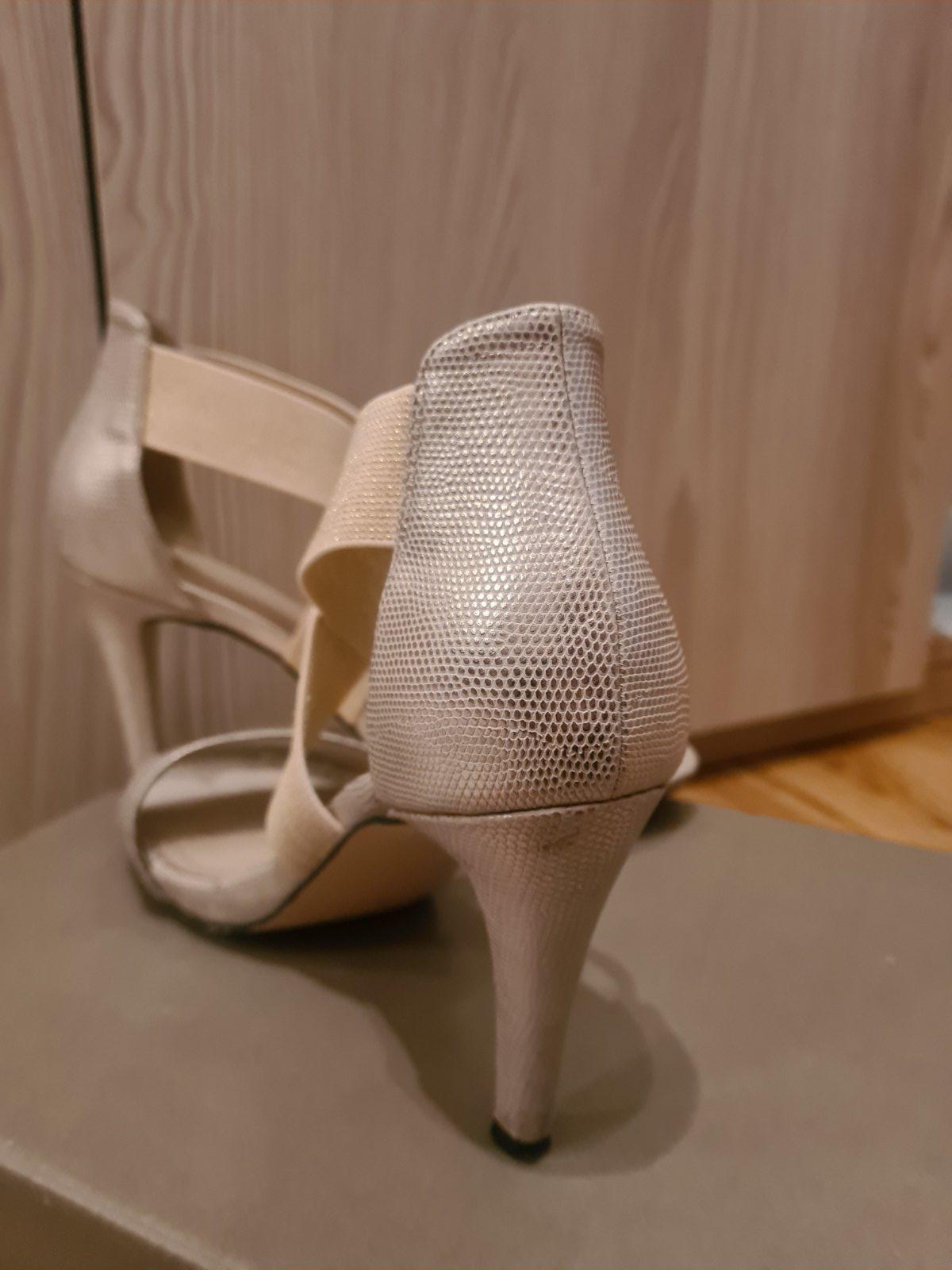 Kožené, 1x príležitostne obuté, bez poškodenia, výška opätku 7,5cm, vnútorná dĺžka max. 23,5 cm, nastaviteľný remienok