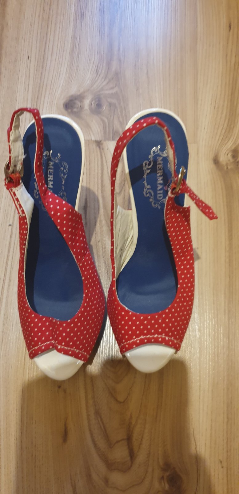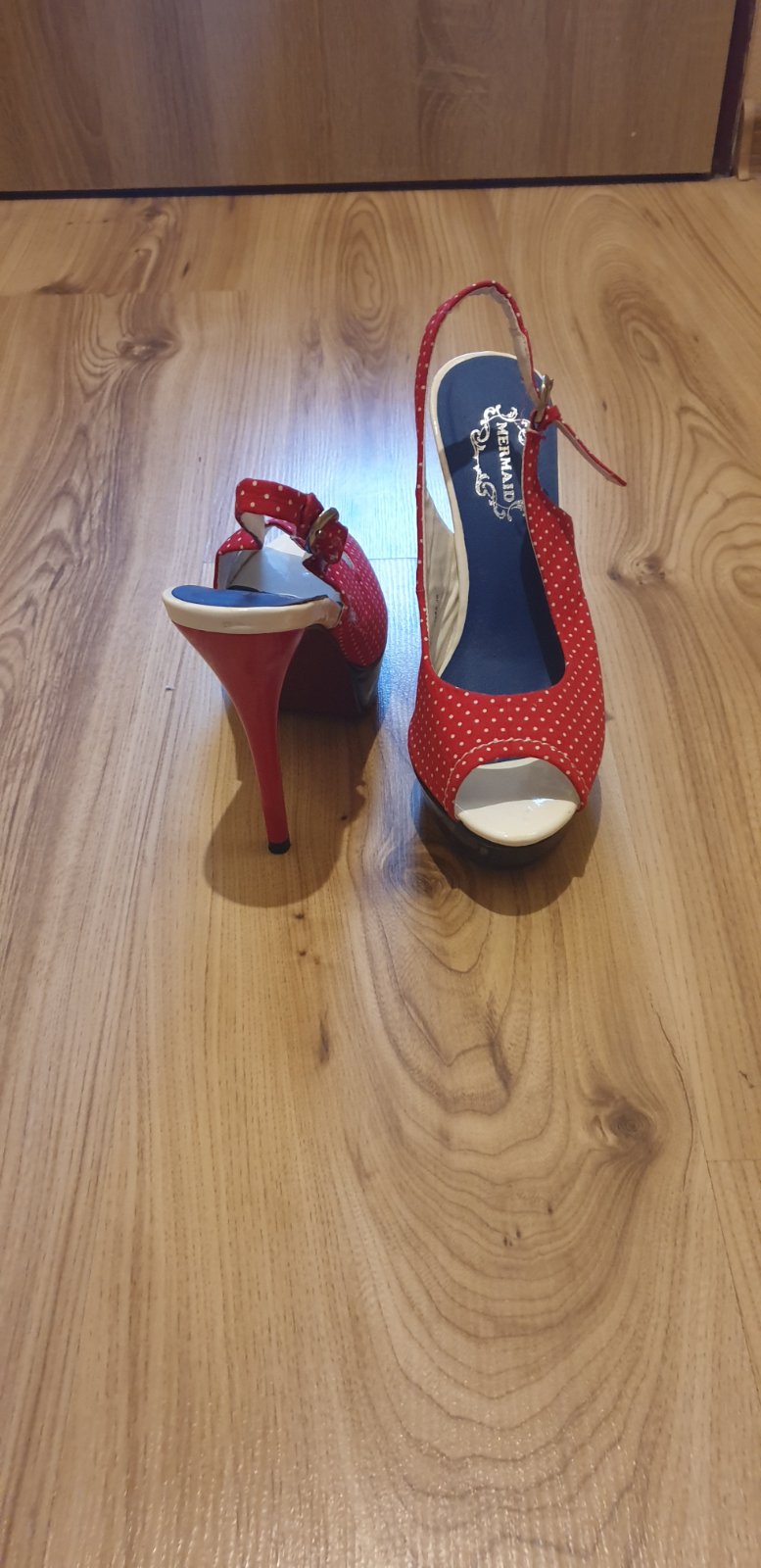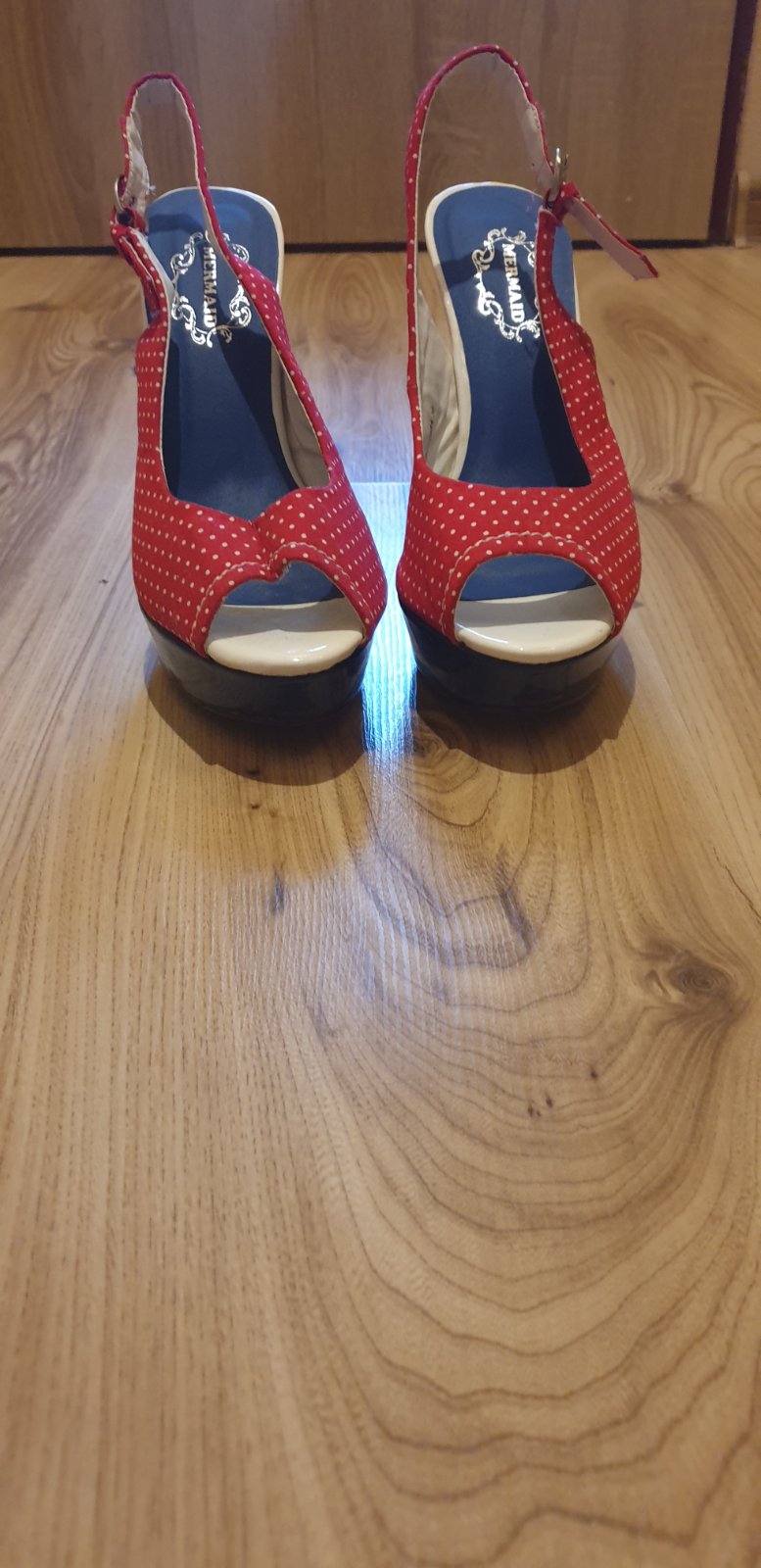 Predám nádherné červené bodkované sandálky. Vnútorná dĺžka 23cm, opätok 11cm, platforma 3cm. Platforma je v tmavomodrej farbe. Úžasná kombinácia s červenou farbou.