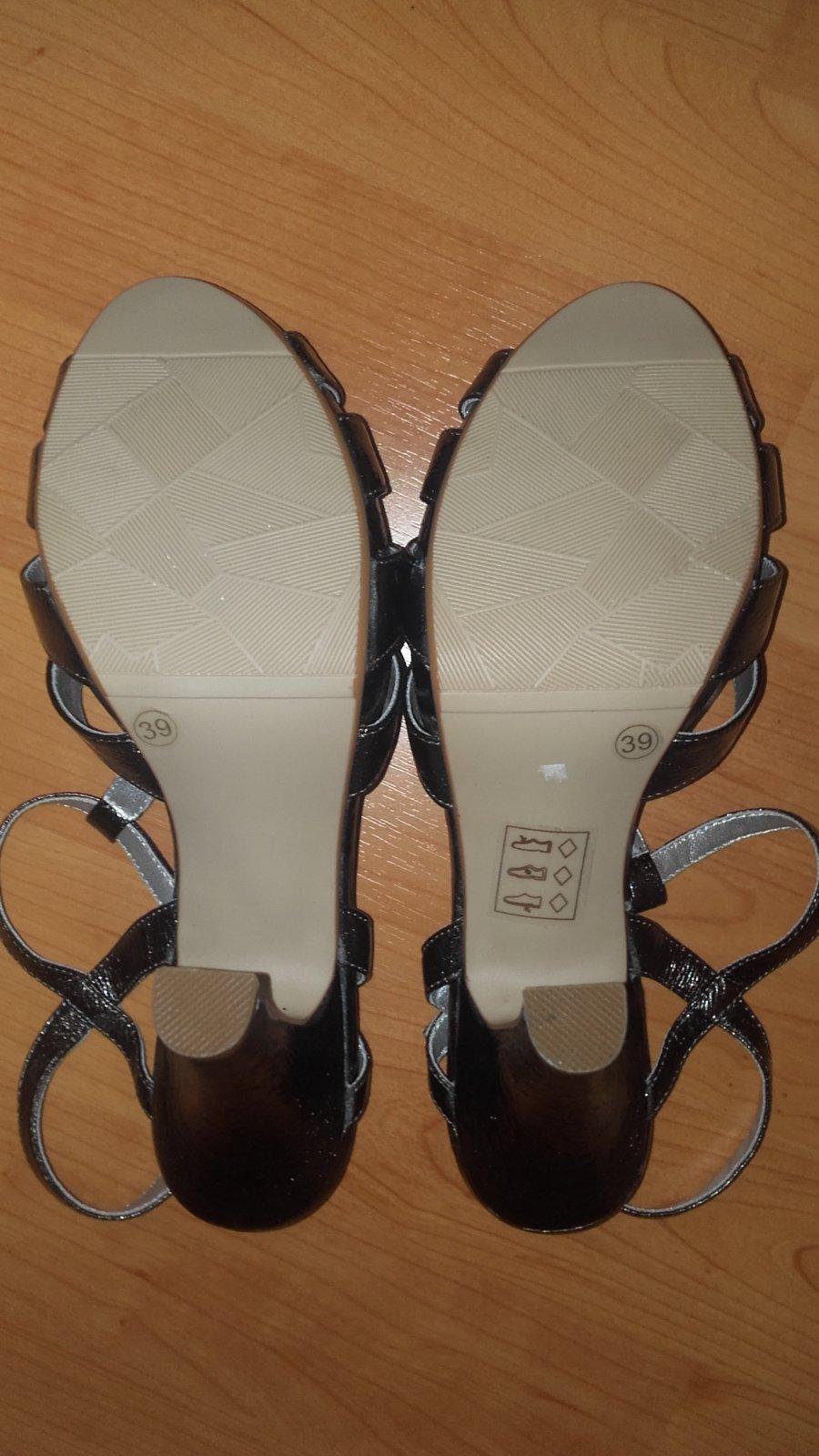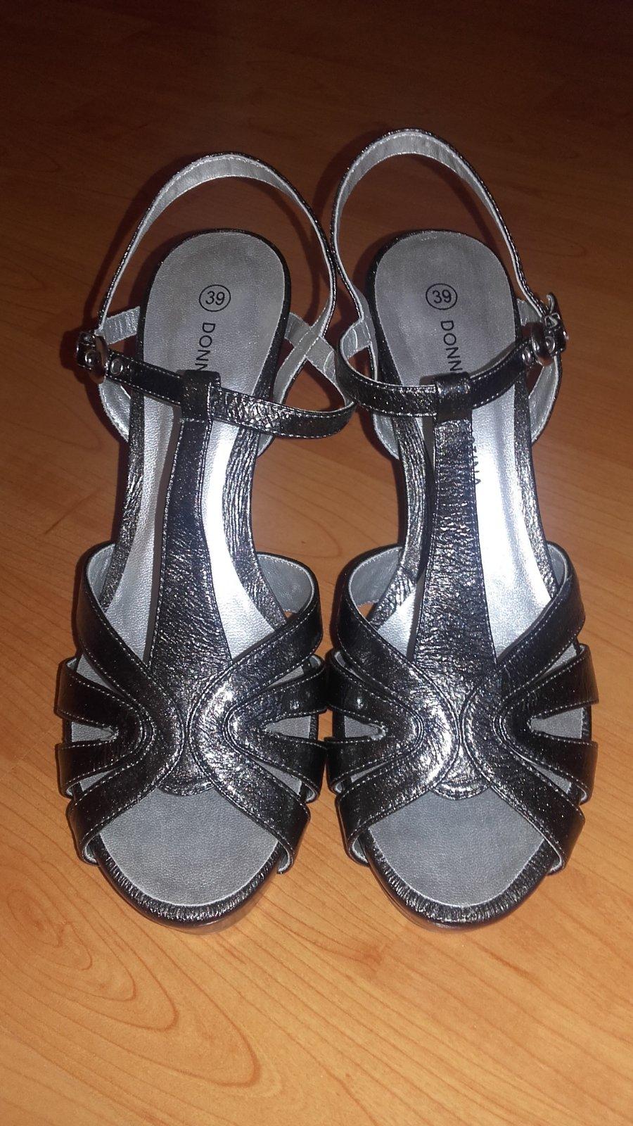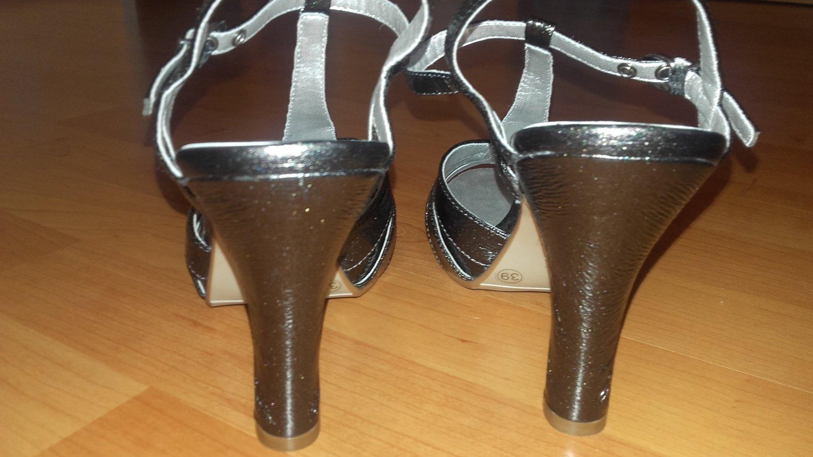 Sú v 100 % stave, obuté asi 1/2 hod. Tmavošedá metalízová farba. Vn. d. 25 cm, v. opätku 11 cm, v. platformy 1, 6 cm.
