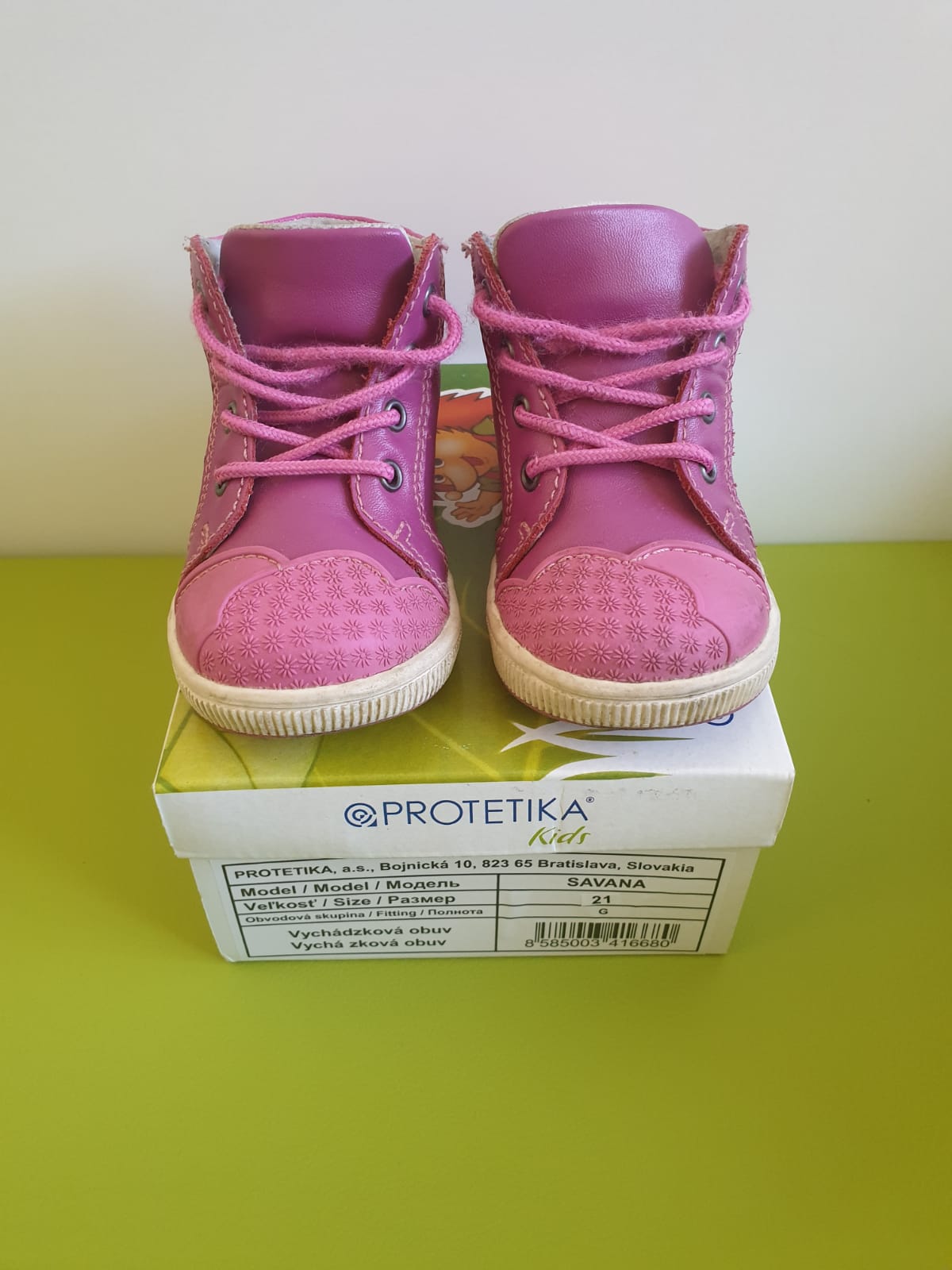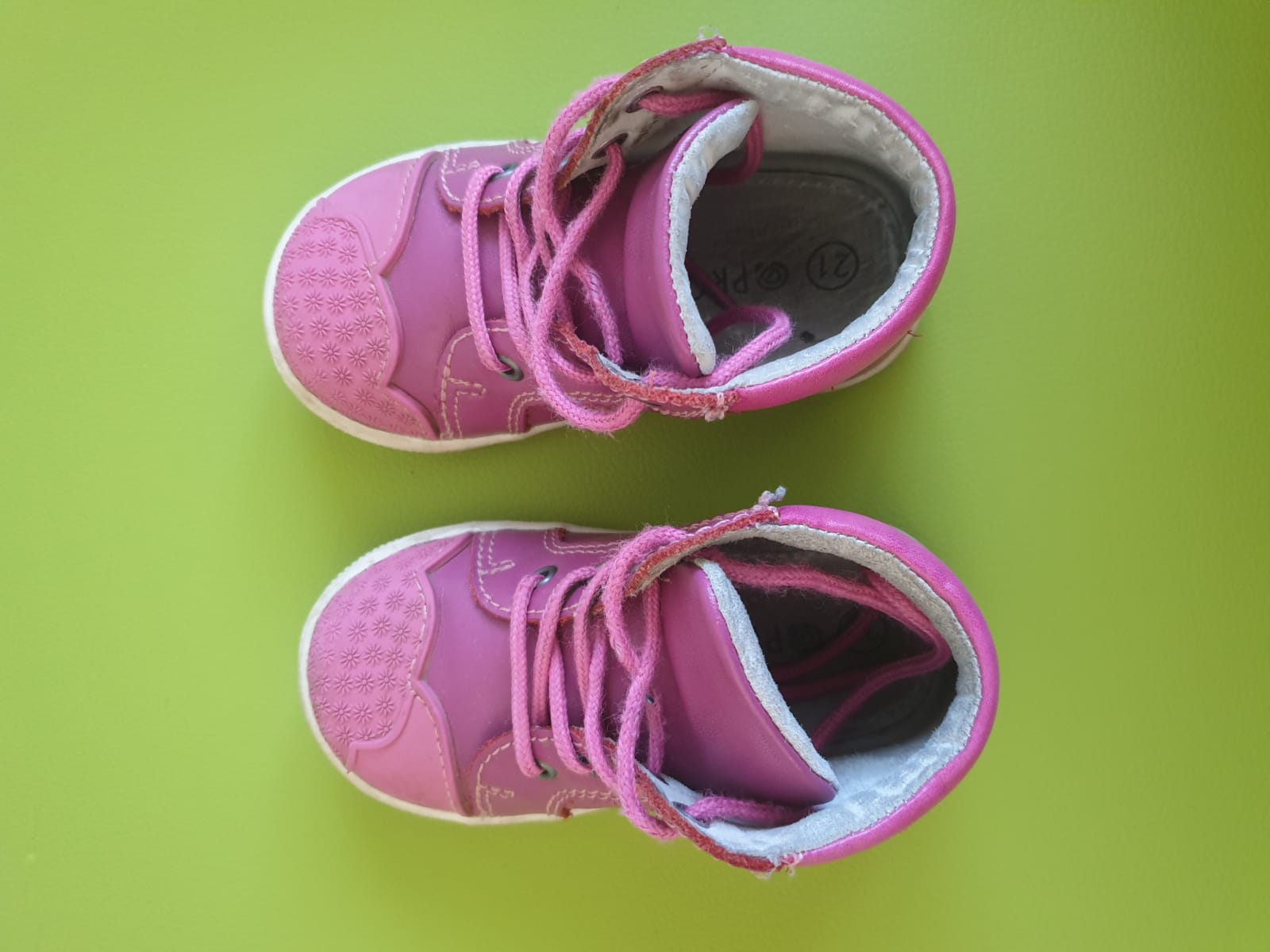 Krásne ružové topánky z hladkej kože. Vyborny noseny stav okrem jednej chybičky - obe päty sú mierne osuchane (vid foto), ziadne iné poškodenia nemajú. Je k nim krabica. Boli impregnovane. Veľkosť 21, vnútorná dĺžka 14 cm, značka protetika.