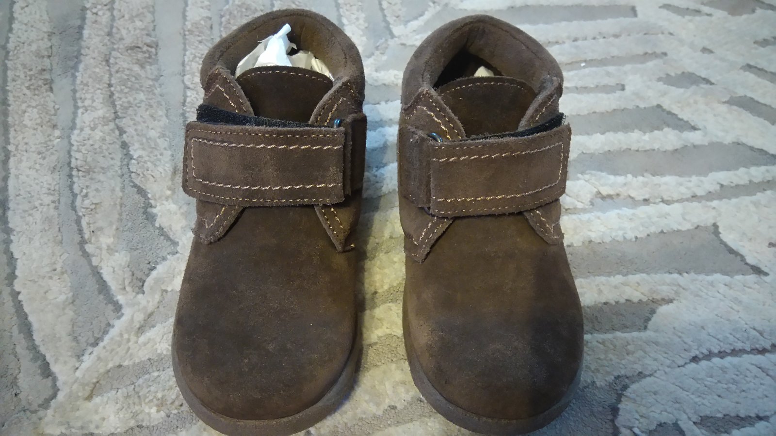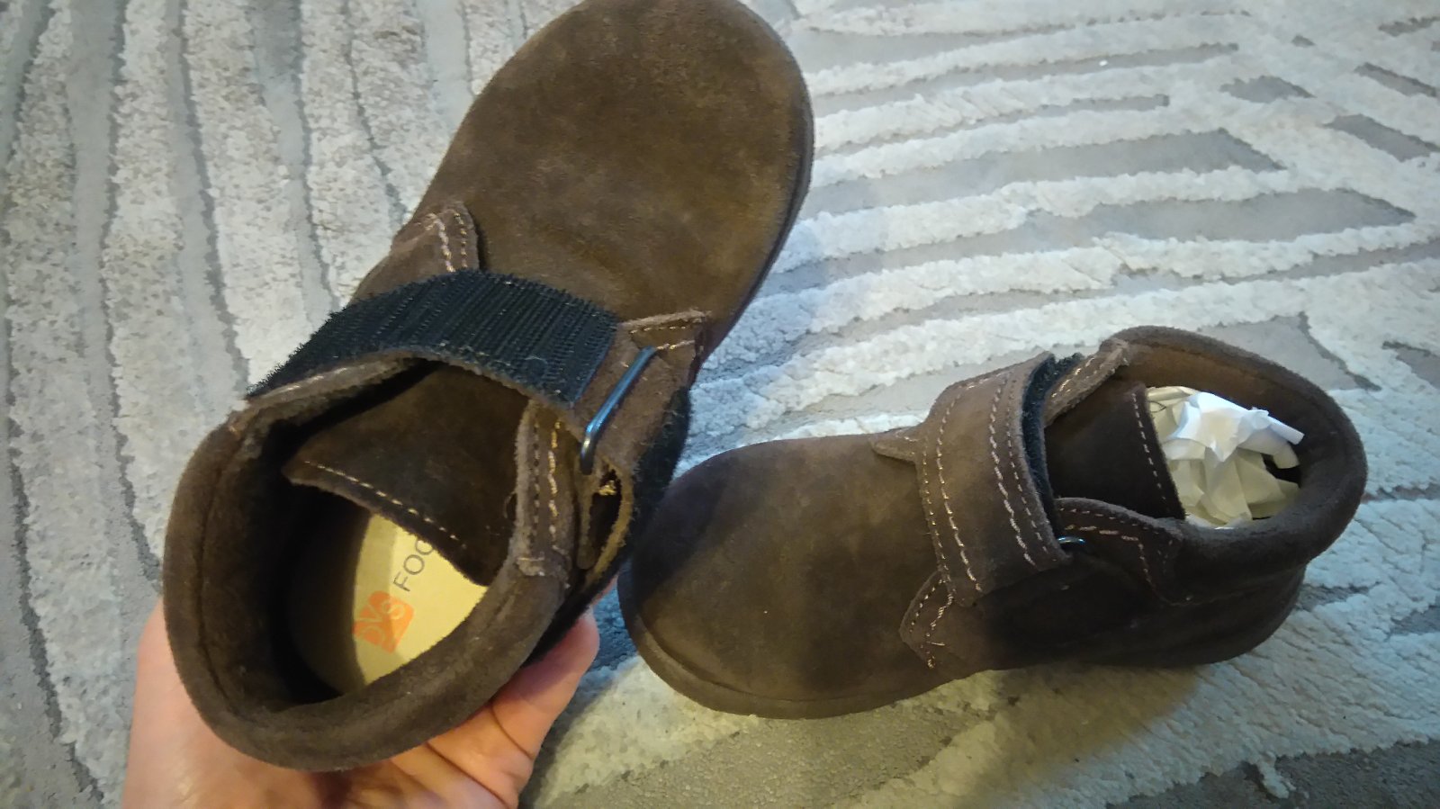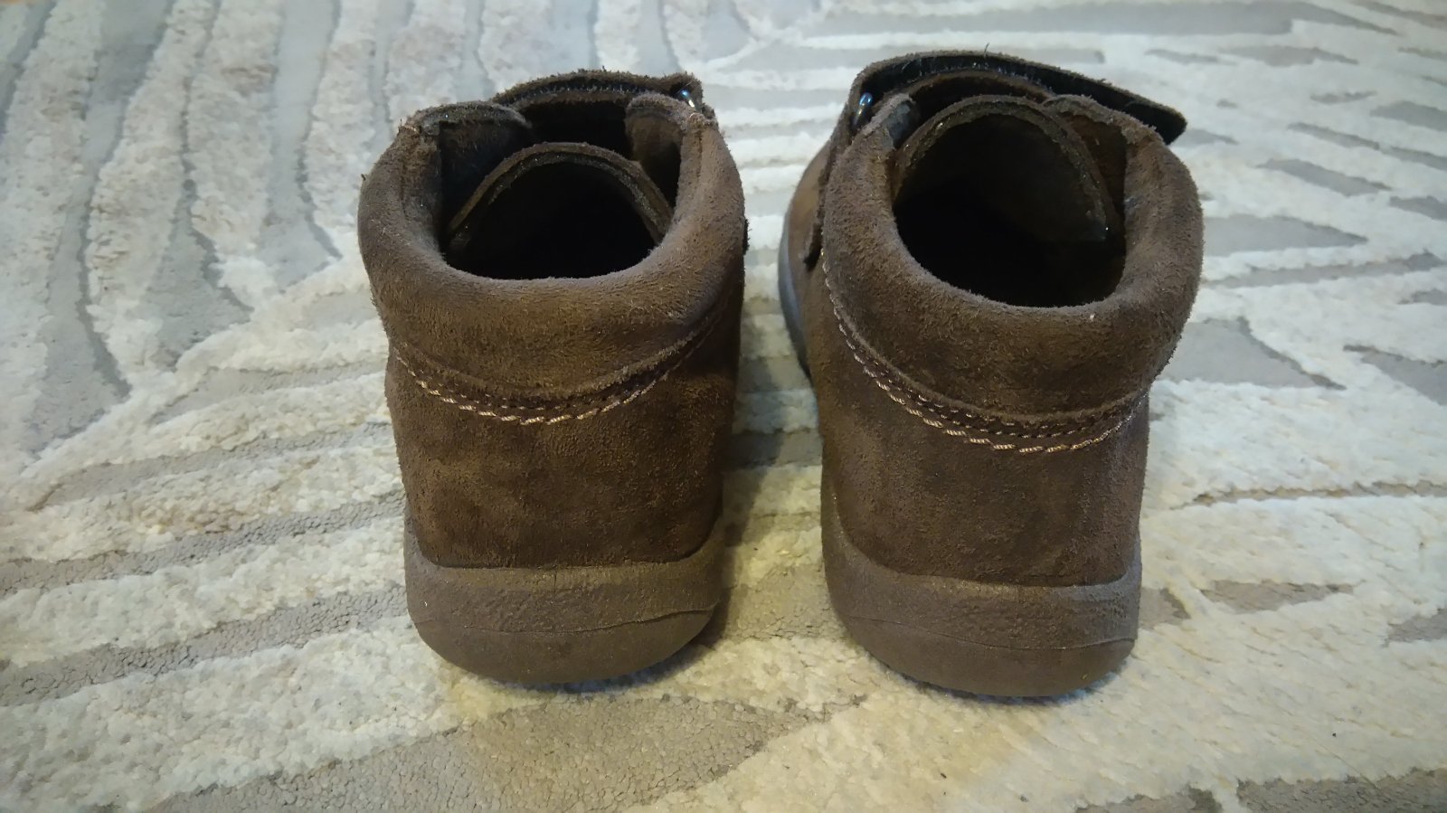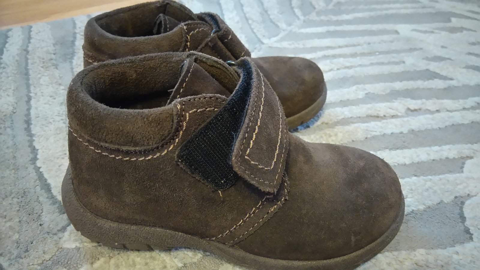 Nosené prechodné topánky, mierne zateplené. Majú trocha šuchnuté špičky, pri nosení to nevidno, až detailne keď si dáte topánku pred oči :) a pri foto s bleskom Kľudne do škôlky aj na doma.