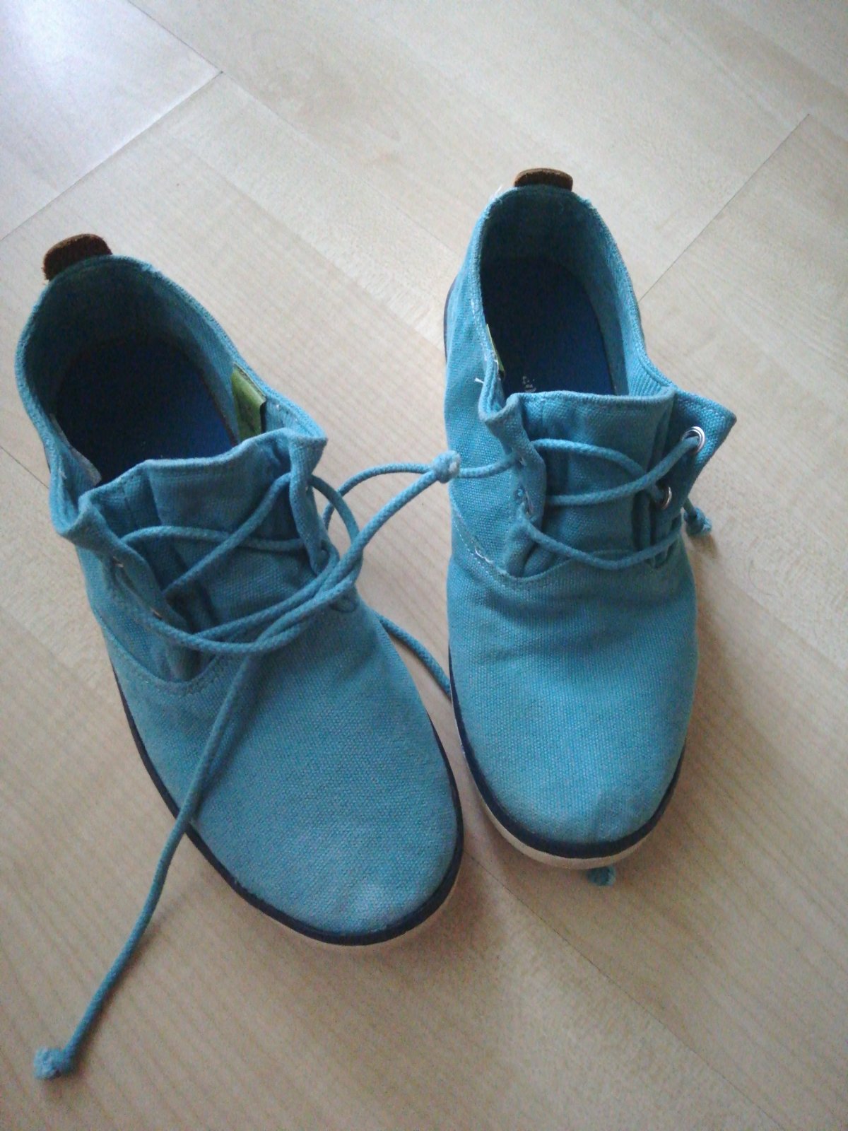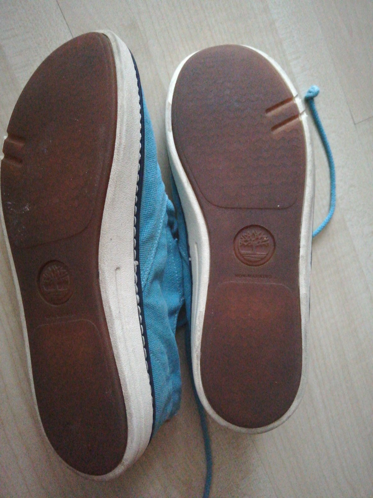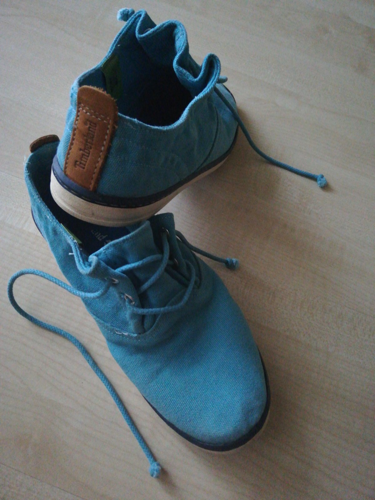 Super plátené Timberland, krasna tyrkysovo-bledomodra farba. Šnurovanie, veľmi pohodlné, ako papučky. Veľkosť Timberland 4,5. Naša 36-36,5-ka. Obute asi 2-3 x. Bez známok nosenia. Rýchlo nám vyhupla noha. Cena 19,90€