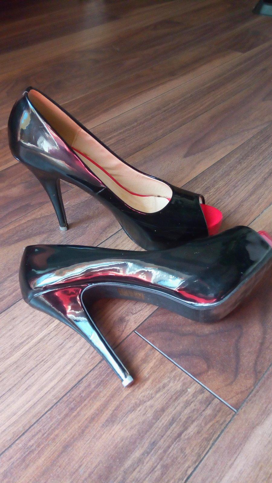 Predám lakované lodičky s otvorenou špičkou červenou opätky menené za kovové,mierne suchnute po bokoch ale nevidno to veľmi