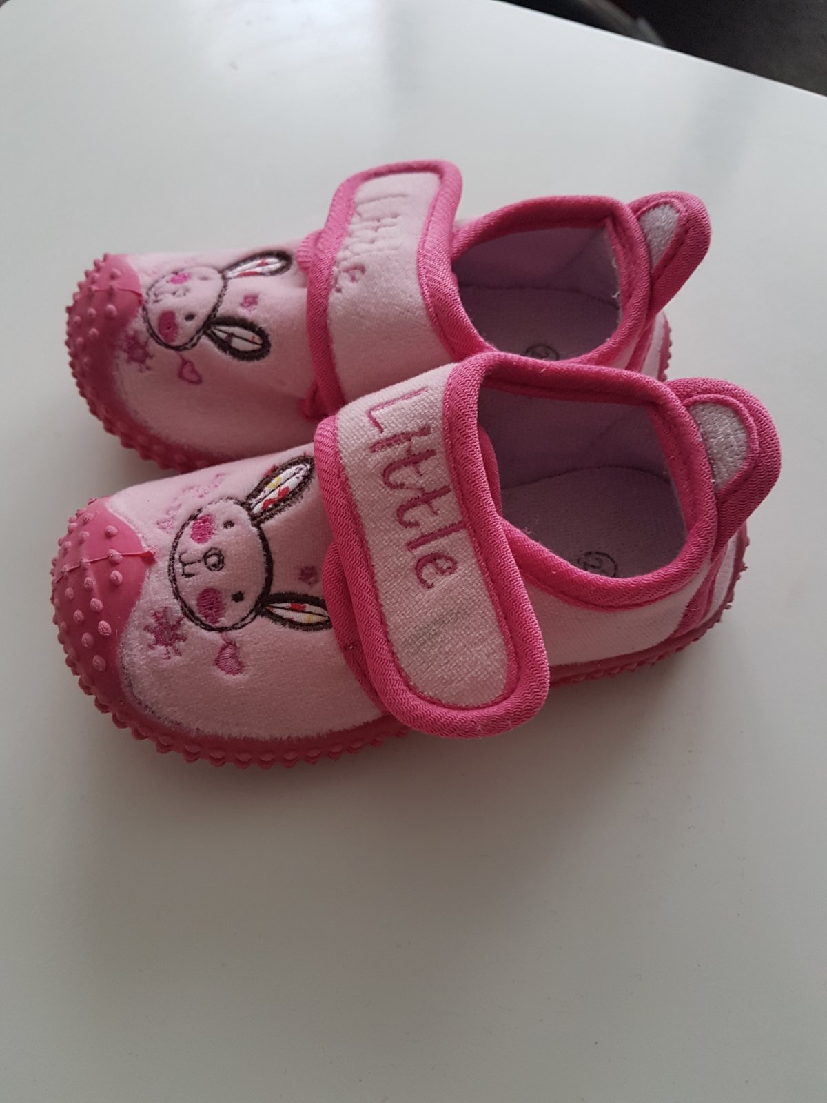 Predám nosené, ale stále pekné papučky. Neviem či sú to originál papučky, ale my sme ich využívali ako papuče. Vnútorná dĺžka 14cm. Na jednej topánočke kúsok vidno na suchom zipse špinu. Nie je to nic hrozné a pei nosení neprekáža. Kupované v deichmanne.