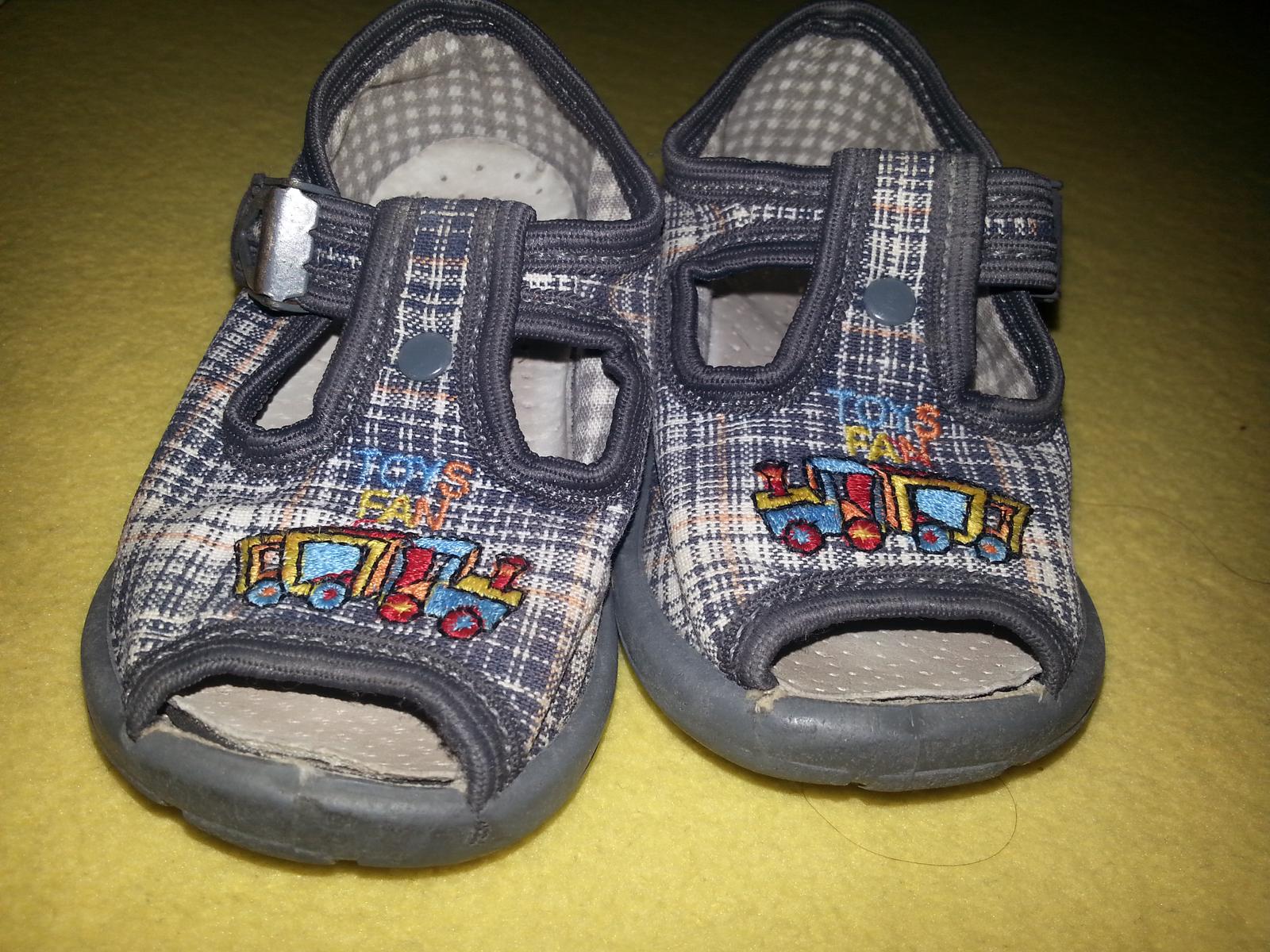 Krasne sandalky s aplikaciou vlacika znacky Nazo od Protetiky.Pouzivane mojim syncekom, iba v kociari, neschodene, neposkodene, vo vnutri ortopedicka vlozka.