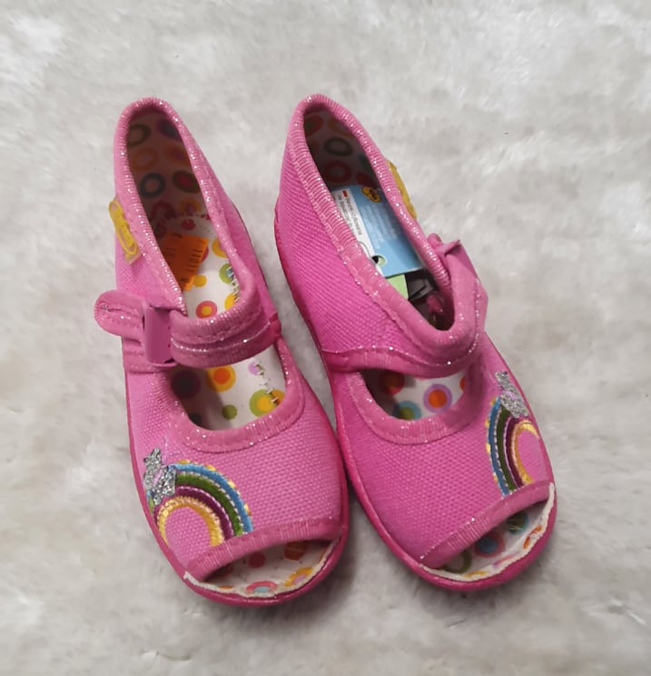 Dievčenské papučky so zapínaním na sponu. Obuv je vyrobená z prírodnej textílie. Vystužené päty zaisťujú stabilitu a bezpečnosť pri chôdzi. Podrážka je protišmyková, vyrobená z ľahkého pvc, ktoré je odolné voči nárazu a oderu.