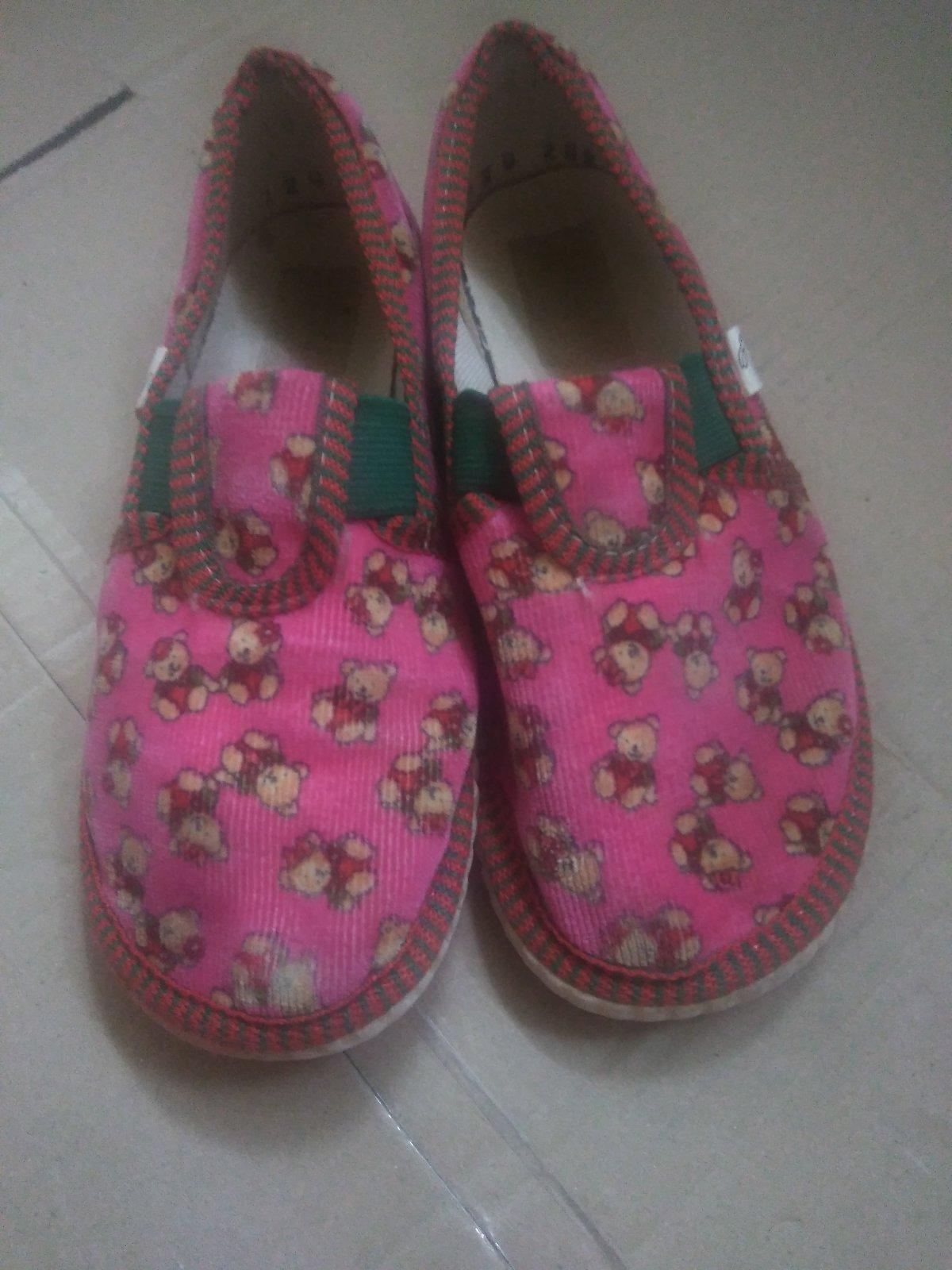 Predám 6 mesiacov v skolke nosené papučky. Su velmi zachovalé, paty neschodené. Nám su malé. Farba pekná ružová. Lepky lepia. Nie som si istá velkostou ale vnutorna dlzka je 17 cm.
