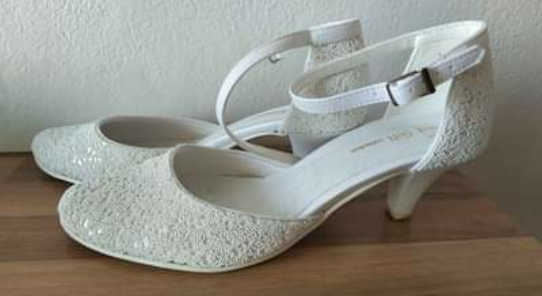Predam biele svadobne topanky na nizkom opatku. Raz obute, pohodlne. Velkost 38. Povodna cena 35.