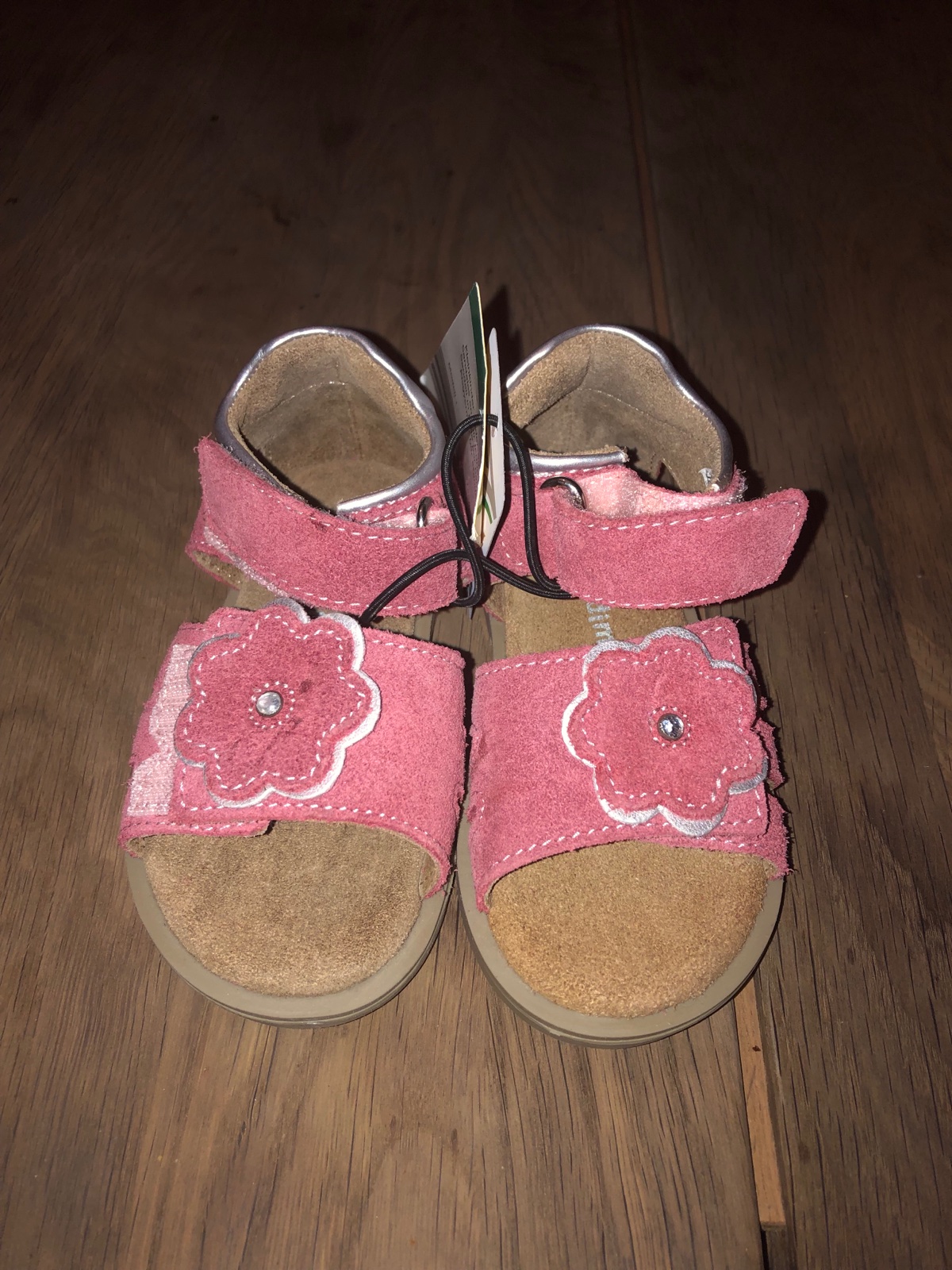 Krásne úplne novésandálky z brúsenej kože ktoré sme nestihli vynosiť.Sandálky majú ešte vysačku.vnútorná dĺžka je 14cm.Zapinanie na suchý zips aj v predu aj z boku.Kupované v maďarsku za 25€ presám za 18€