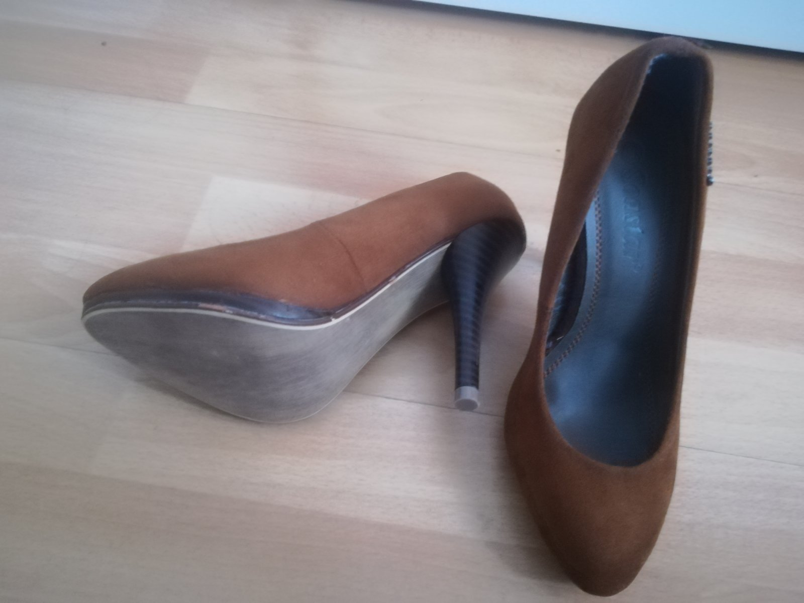 Farba je tmavohnedá ako na detail fotke. Pár krát obuté, ale opätky nie sú ako nové ( štrková cesta :-)). Sú pekné, určite ešte poslúžia. Je tam mašlička a lem - niečo ako hadia koža alebo čo. Špic...