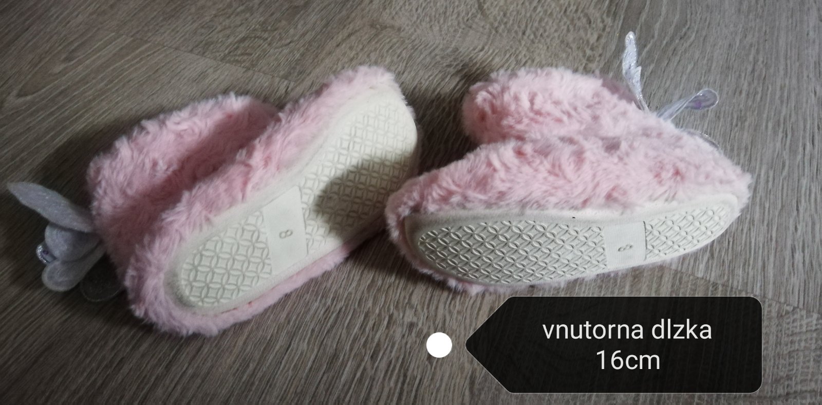 Bledoružové papučky na suchý zips s bledou podrážkou, vhodné nielen do škôlky ale aj do telocvične. Veľkosť písaná 27 ale sú skôr 26, vnútorná dĺžka je 16,2 cm. Papučky sú dosť nosené (v škôlke) a...