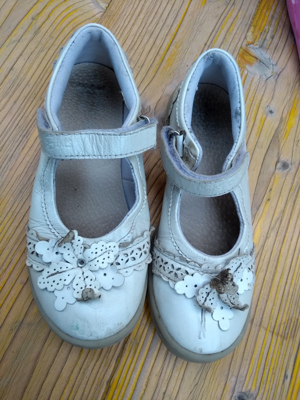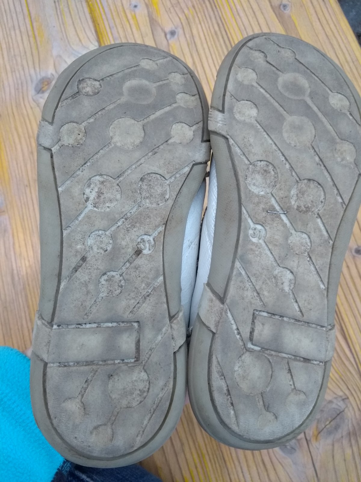 Sandálky trblietavé strieborné. Farba biela. nosený stav. Vpredu okopané, ešte nositeľné.Vel.31, celk.dl.20 cm, na nožičku max.19 cm.