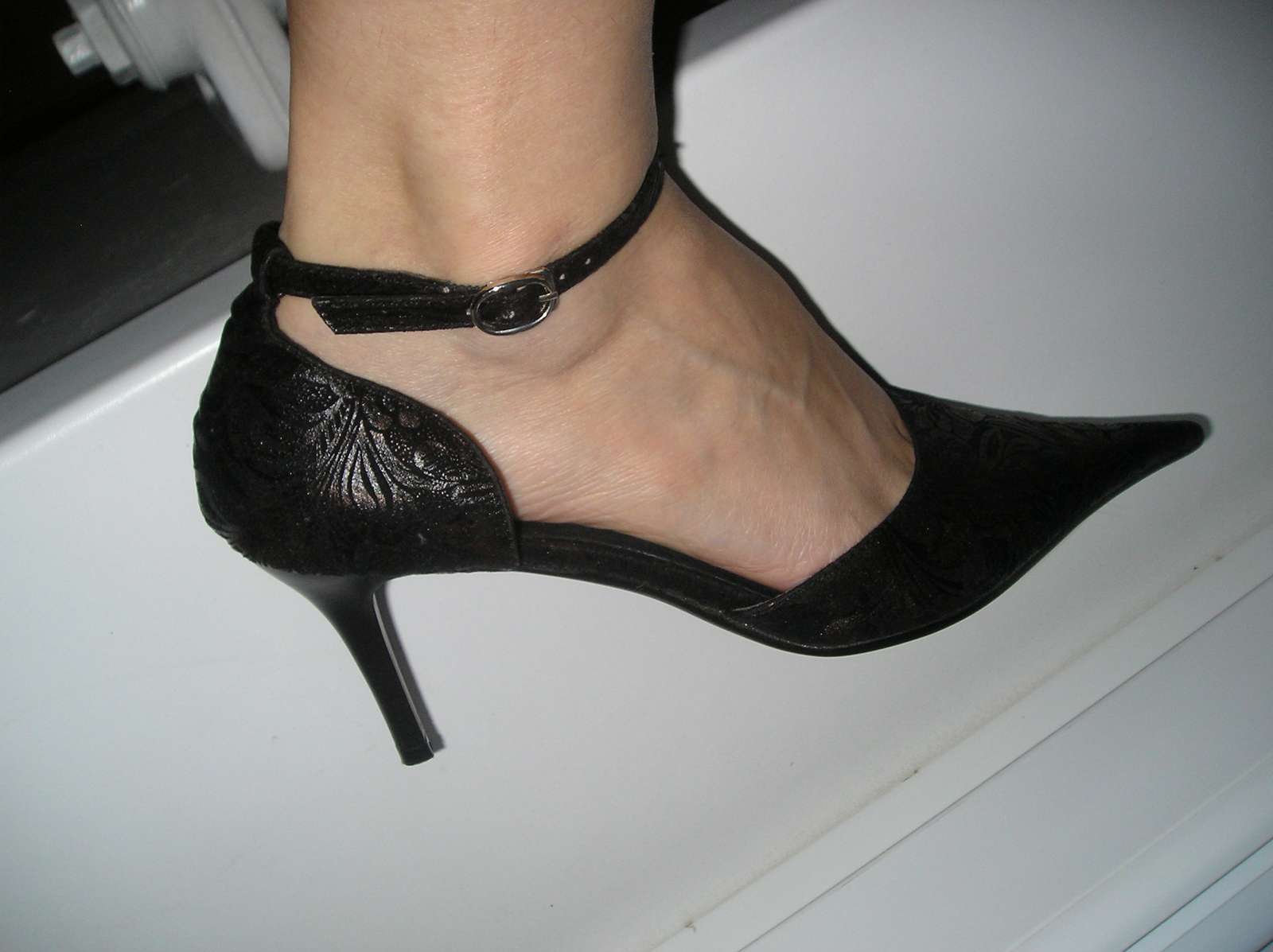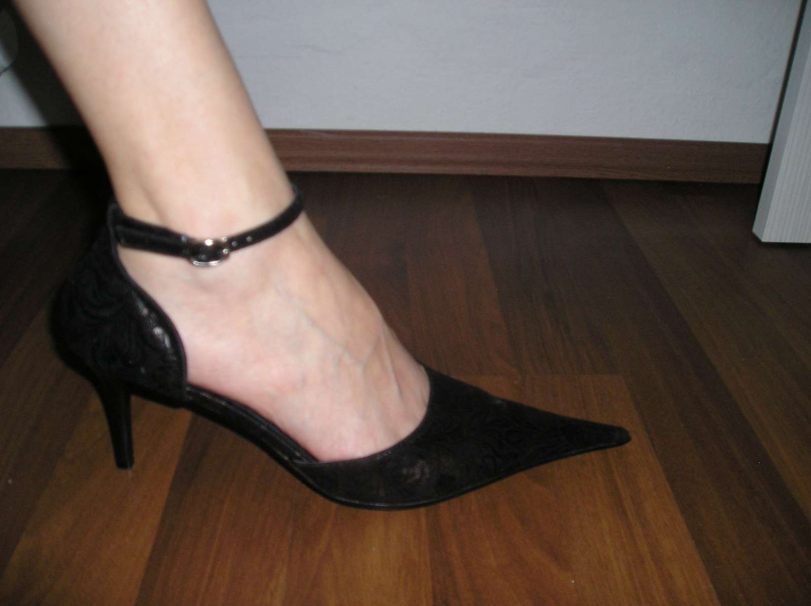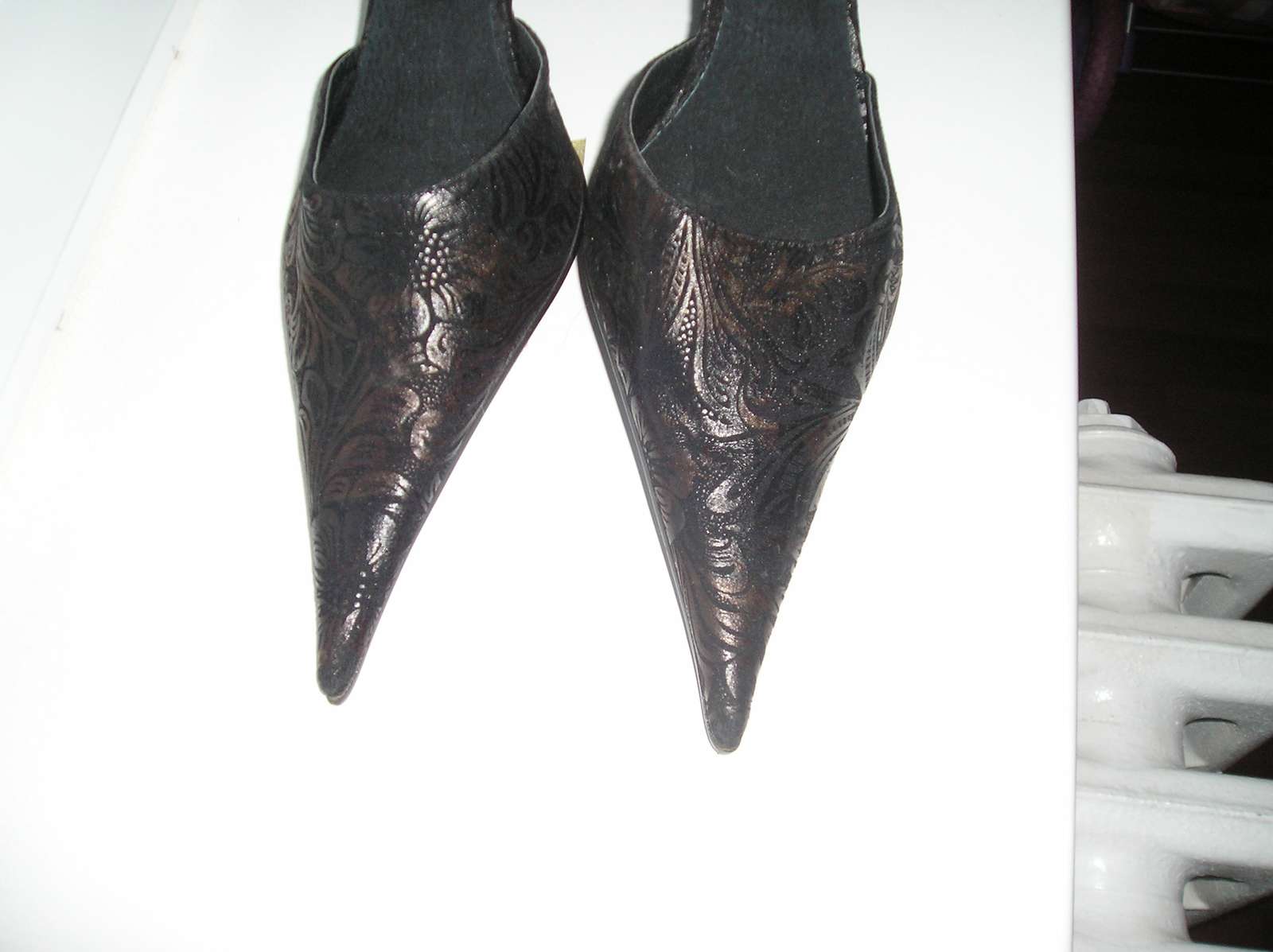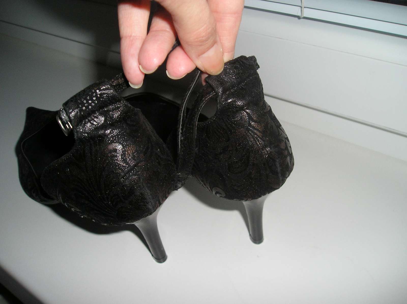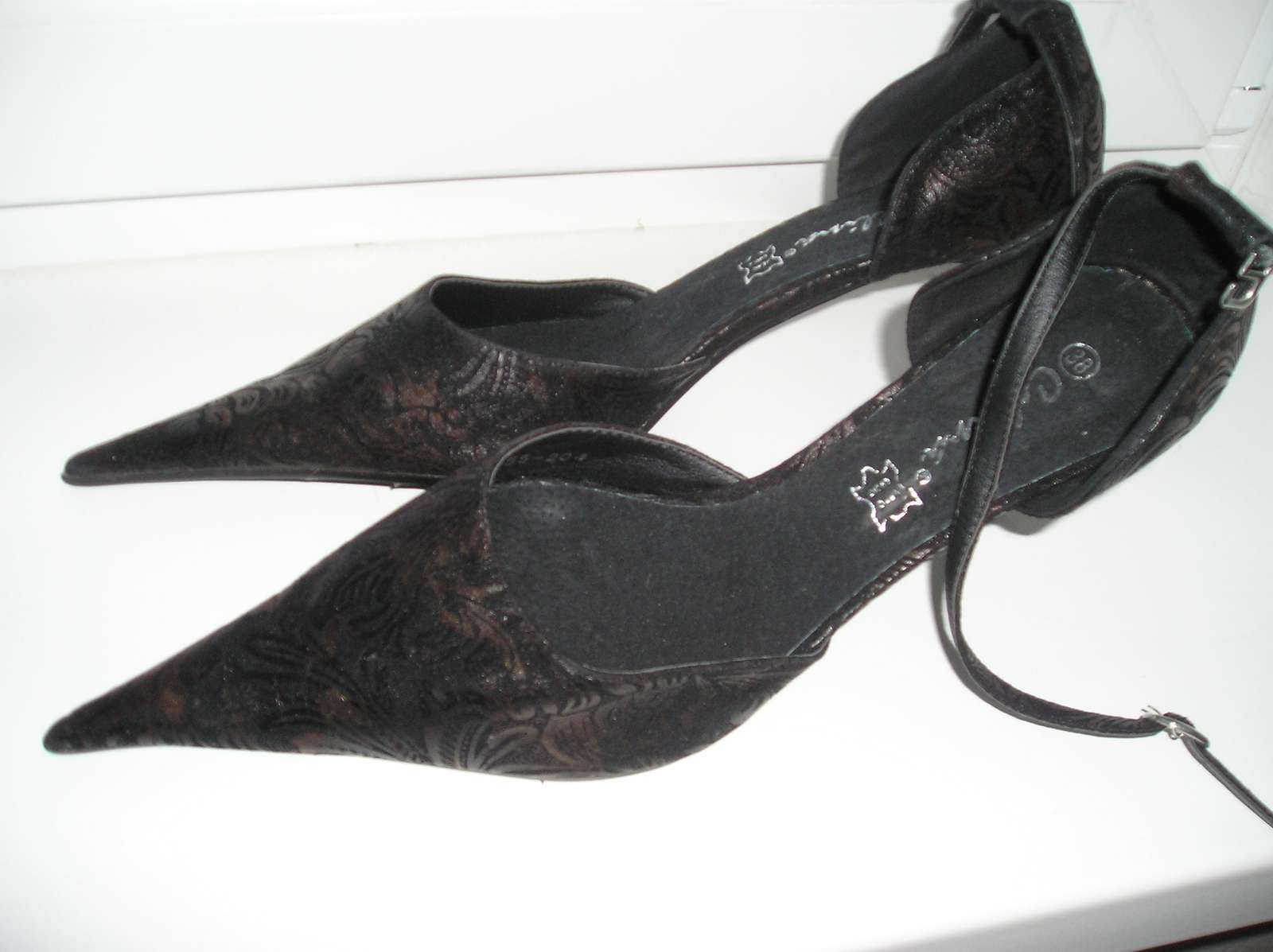 Pekné nenosené lodičky, do špicu. Zapínajú sa okolo členku na háčik. Vnútorná dĺžka topánky /merané úplne od špicu/ 27 cm. Farba je čierna s tmavohnedou. Perfektný stav. Výška opätku 7 cm.