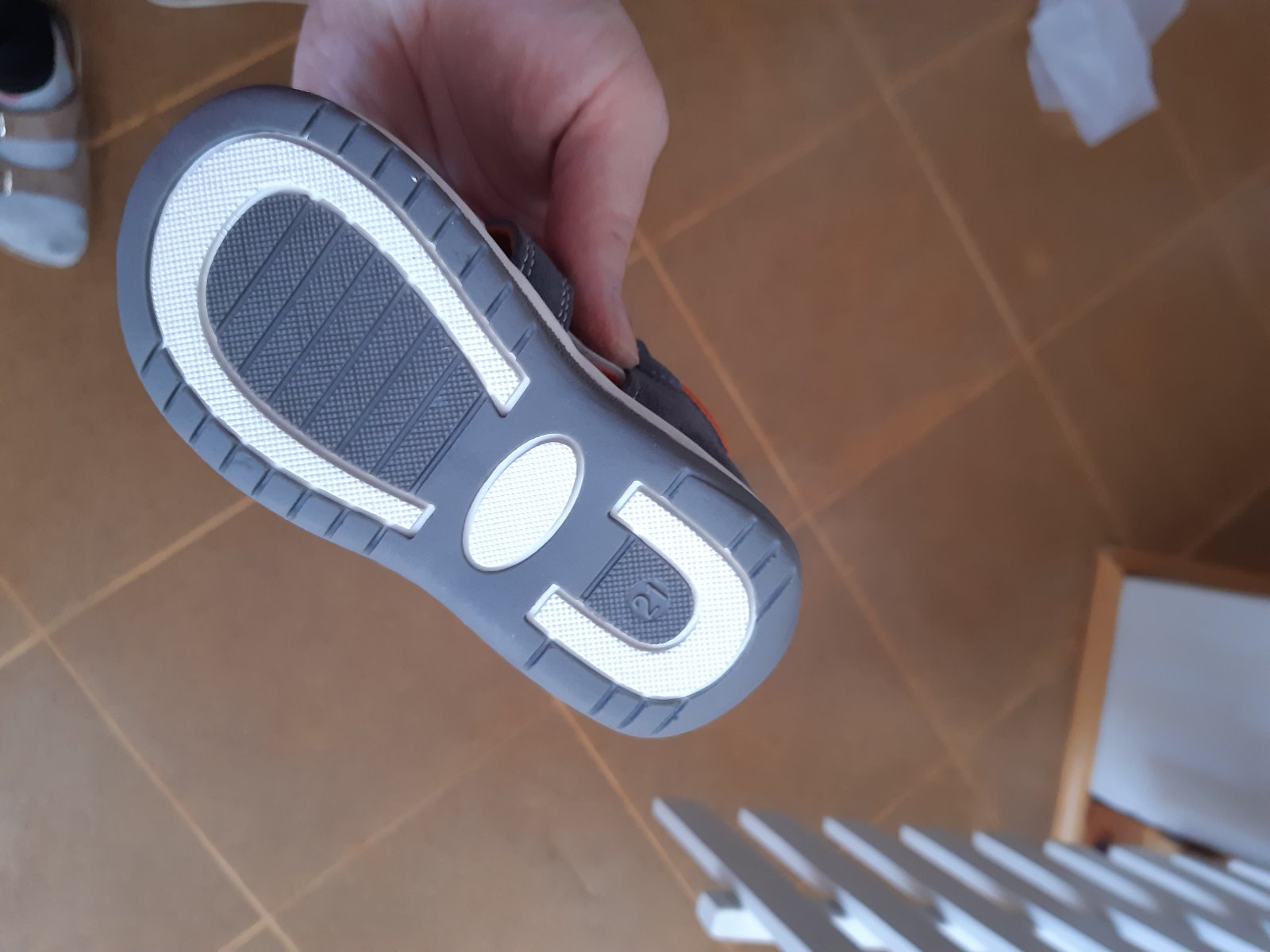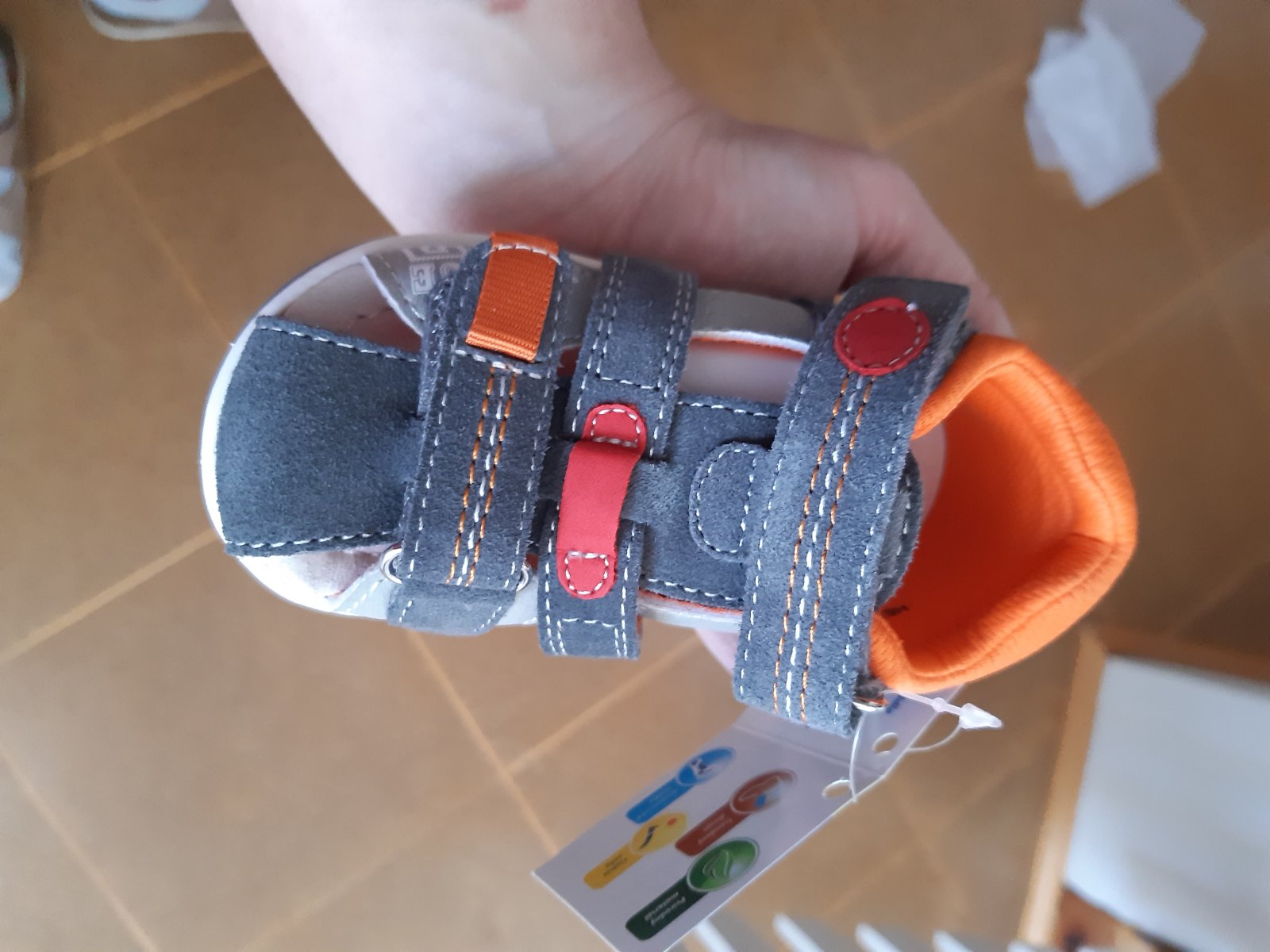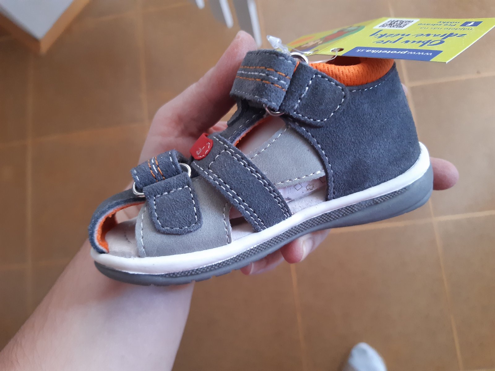 Sandálky Protetika,veľkosť 21,vd 14,5.Modra farba pustila na sivú.Vzadu je modrá farba vysuchana.