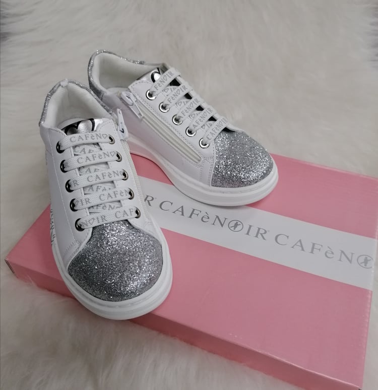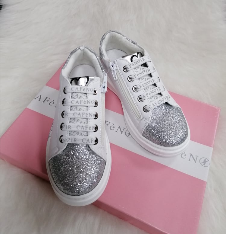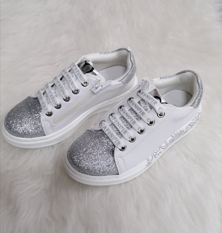 Módne dievčenské tenisky so zapínaním na zips v kombinácii zaväzovania na šnúrky. Vyššia platforma. Bielej a striebornej farby s nápismy na podrážke. Značka Laura Biagiotti.