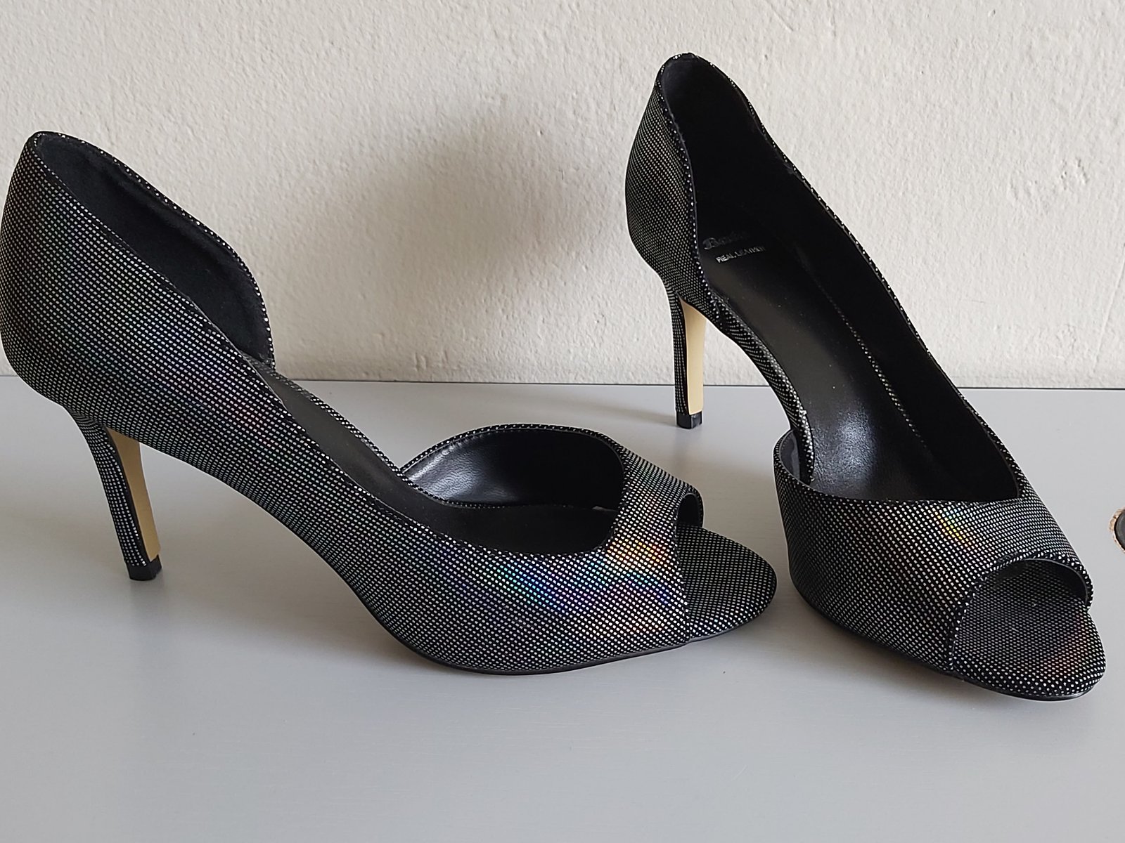 Predám nové pekné kožené lodičky mramorového vzhľadu, vnútorná dĺžka 24 cm, výška podpätku 7,5 cm. Cena 30 eur plus poštovné.