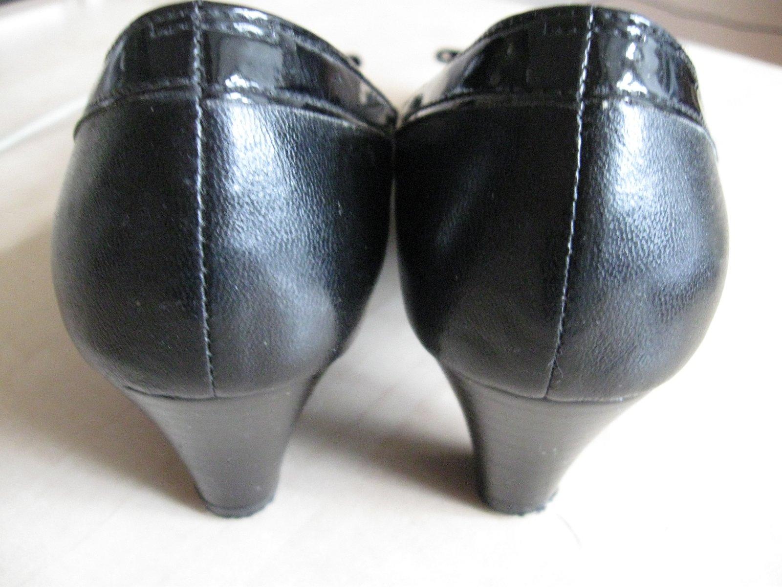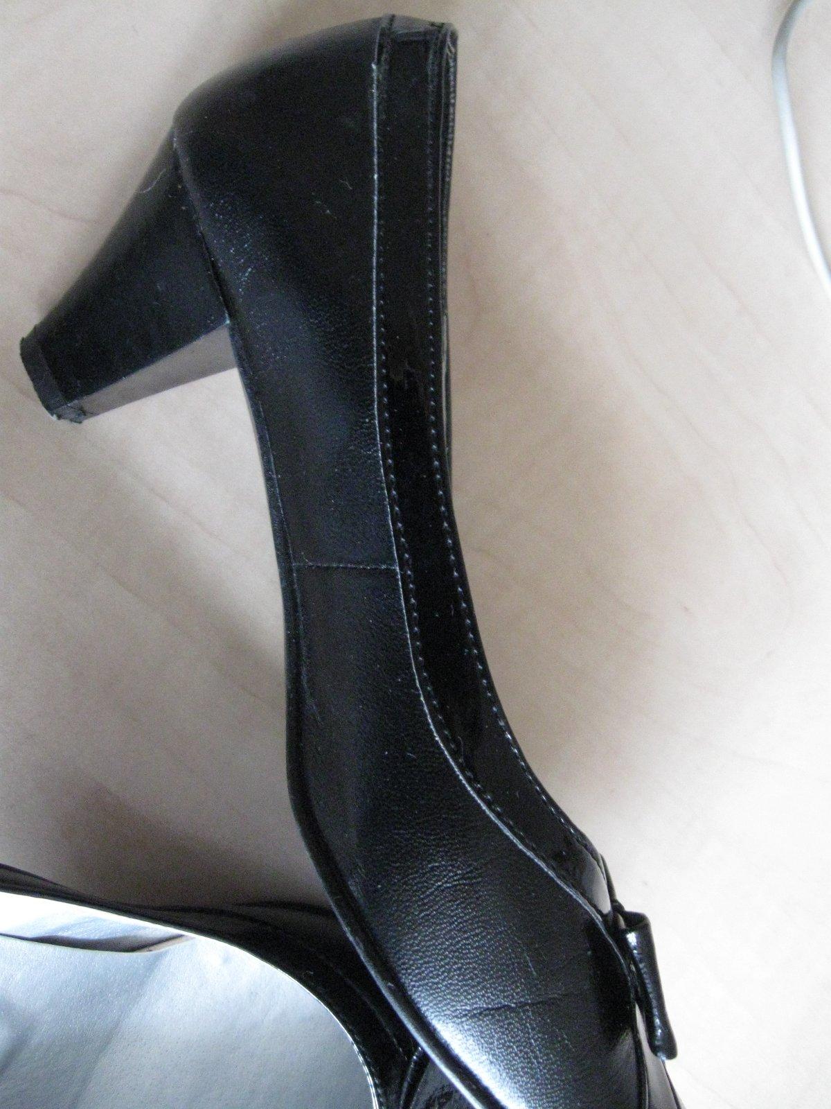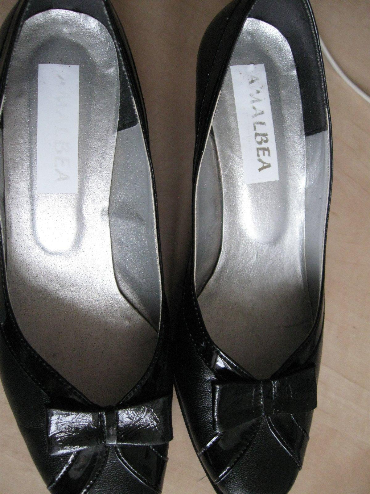 Predám veľmi zachovalé, obuté 3x, čierne lodičky s mašličkou vpredu. Lodičky sú ako nové. Vnútorná dĺžka 23,5 cm, keď meriam úplne po celej dĺžke chodidla, tak 25cm, ale určite sedia na veľkosť 36, ja nosím menšiu 37 a sú mi tesné. Výška opätku 5 cm.